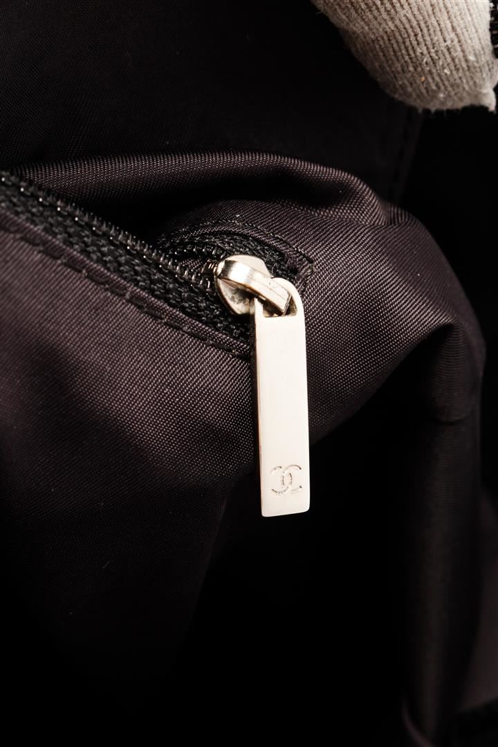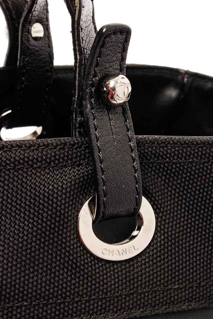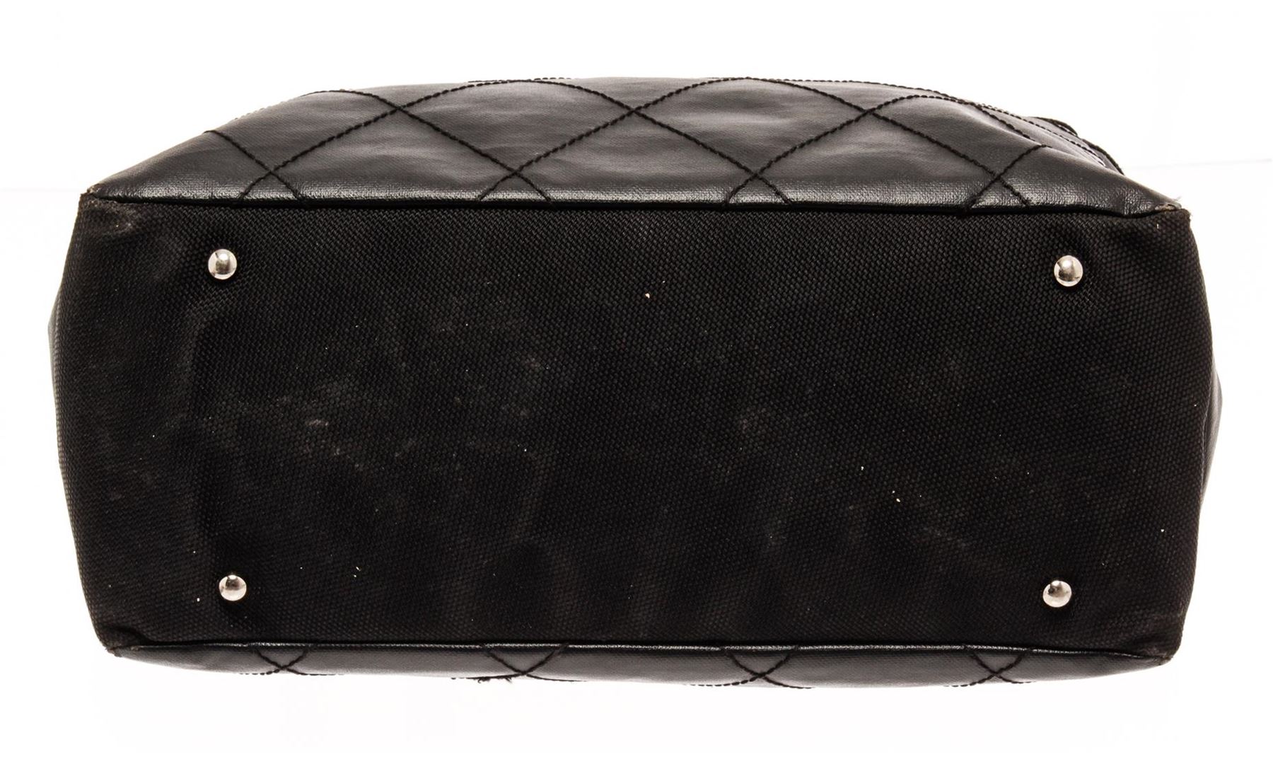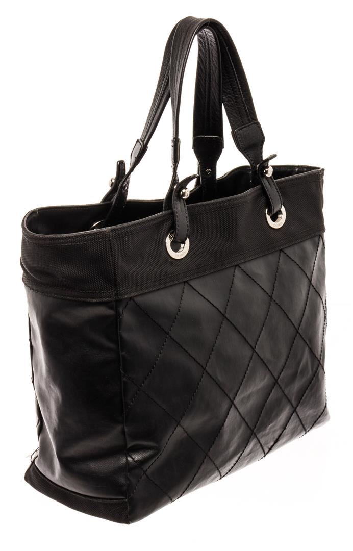Chanel Black Quilted Coated Canvas Paris Biarritz Shoulder Bag. All available information is listed in the description and shown in the photos. Chanel Black Quilted Coated Canvas Paris Biarritz Shoulder Bag with top handles, nylon lining, interior pockets, silver hardware, zipper closure. Height: 11.42 in (29 cm), Width: 5.52 in (14 cm), Length: 13.78 in (35 cm)