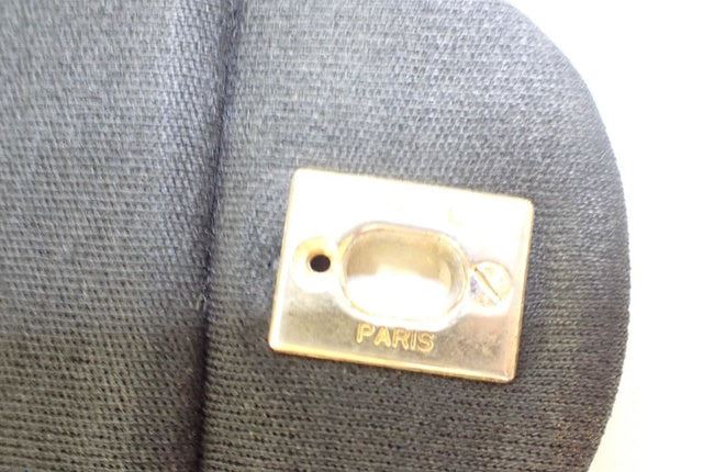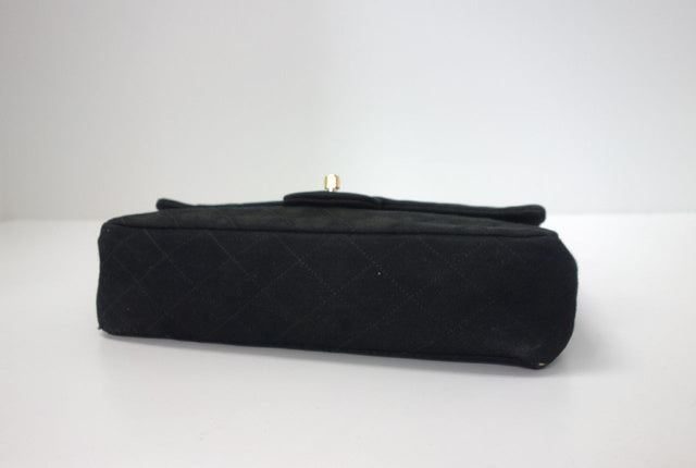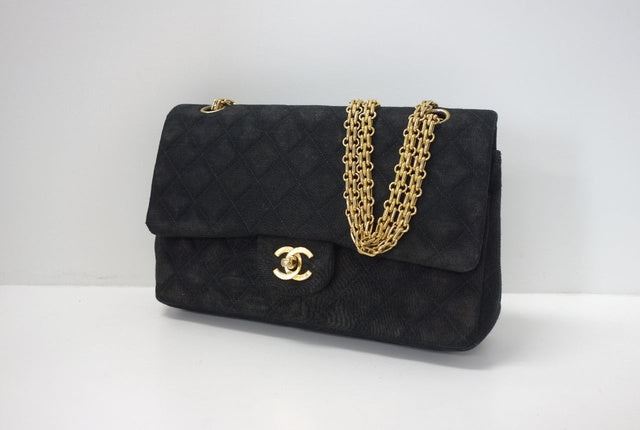 One Chanel Black Quilted Fabric Medium Flap Bag. Item is sold AS-IS. All available information is listed in the description and shown in the photo. Chanel Medium Flap Bag featured black quilted denim body with gold-tone hardware, chain shoulder strap, interlocking CC turn-lock closure and flap top that will open to red leather interior lining. PLEASE NOTE: bag has discoloration and creasing Width 9.8?³ x Height 6?³ x Depth 2.5?³