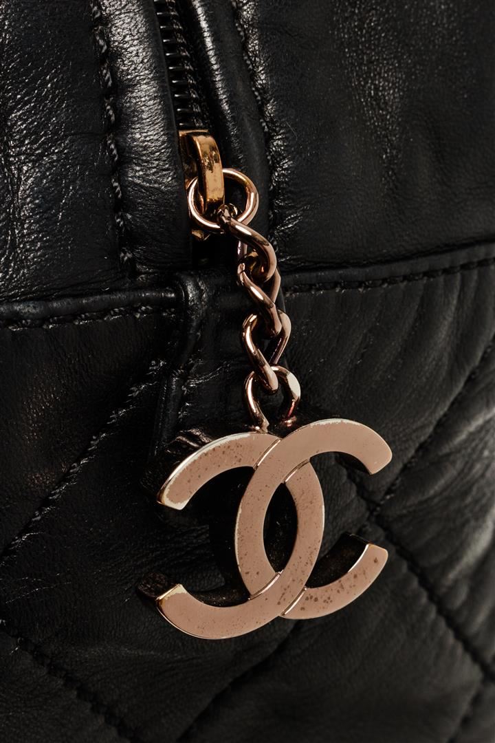 One Chanel Black Quilted Lambskin Cloudy Bundle Bowler Bag. Item is sold AS-IS. All available information is listed in the description and shown in the photo. Chanel black quilted lambskin Cloudy Bunder bowler bag with black leather exterior, black fabric lining, feet at the bottom of the bag to enable it to stand, gold-tone hardware, zipper closure, and CC interlocking logo as zipper tab. Measurements: Handle Drop 10", Height: 8.5 in (21.59 cm), Width: 16.5 in (41.91 cm), Depth: 6 in (15.24 cm)