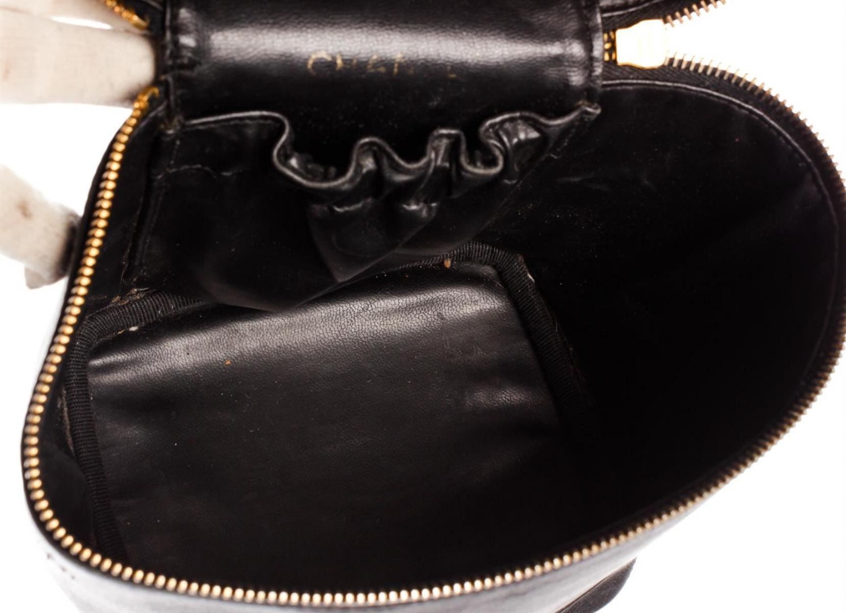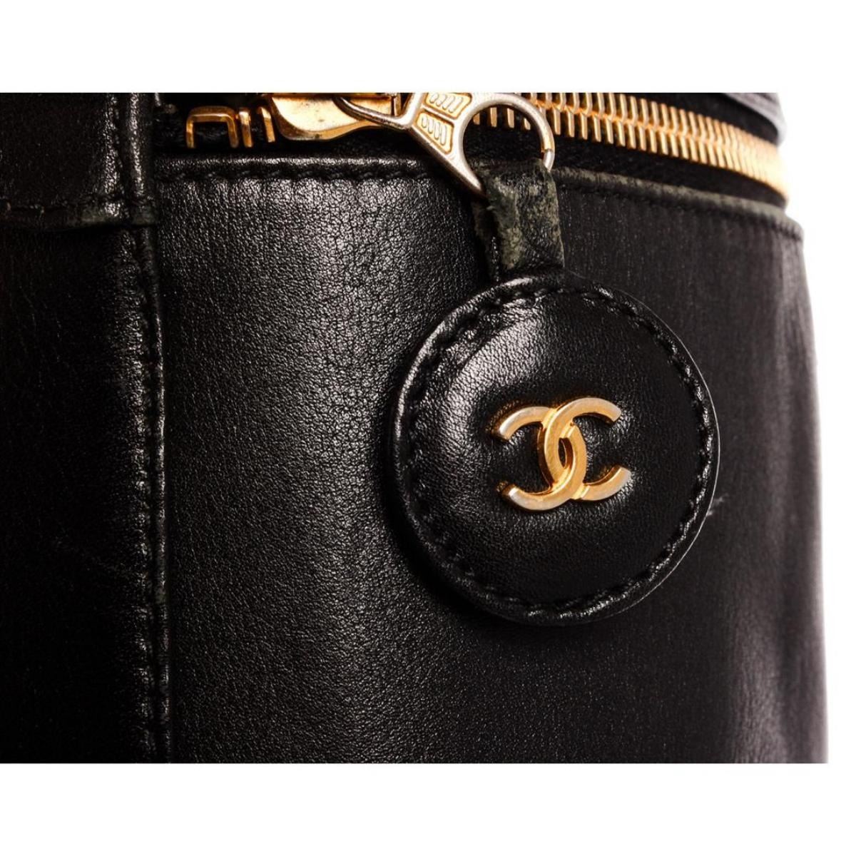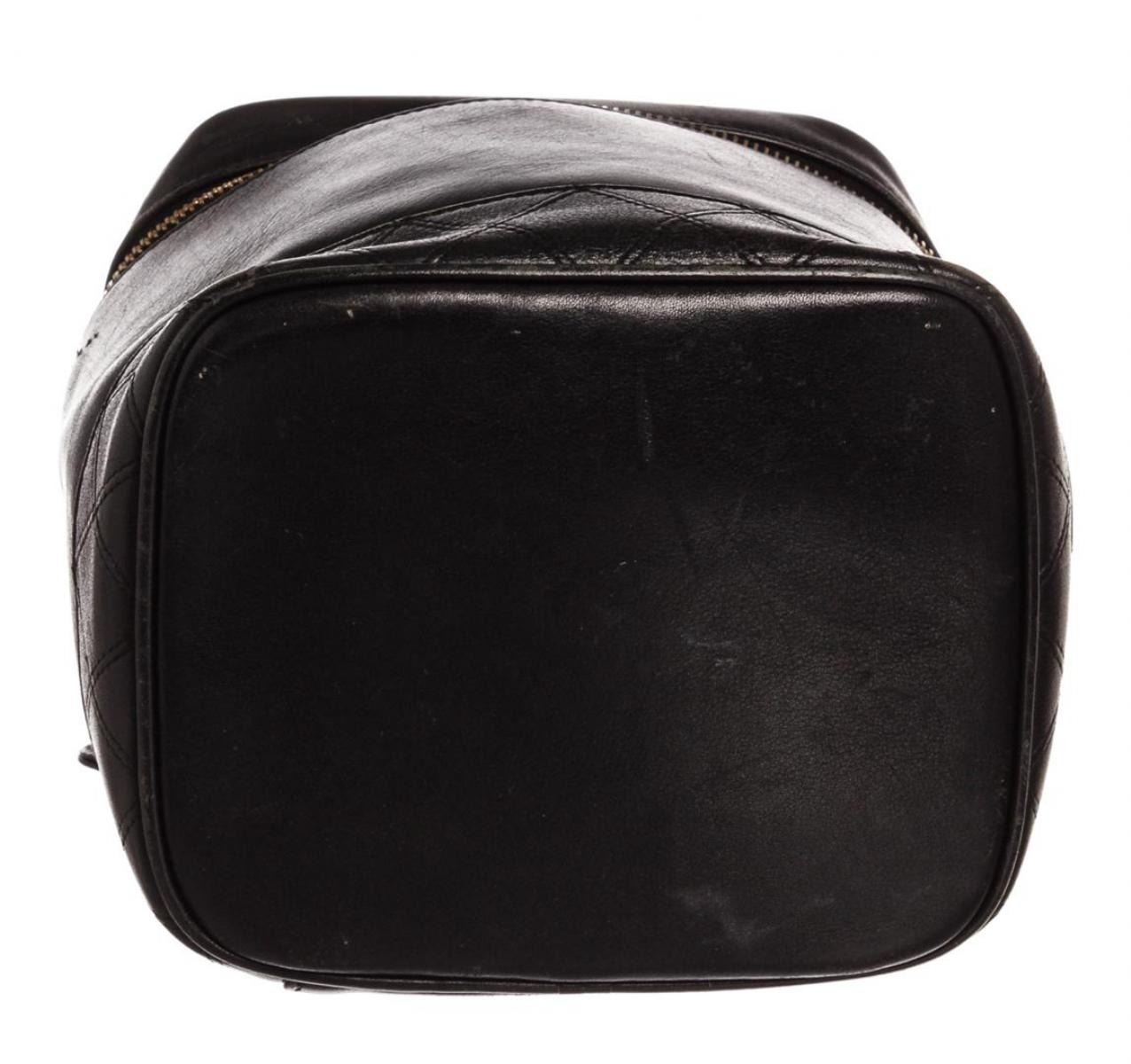 Black quilted leather Chanel vanity case with gold-tone hardware, single flat top handle, single leather lining, single pocket at interior wall and zip closure at front. Authentic.