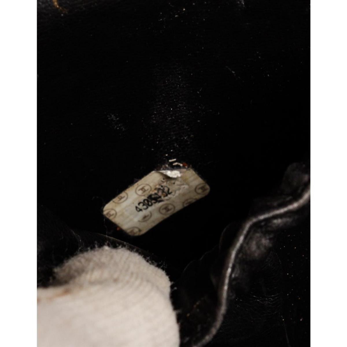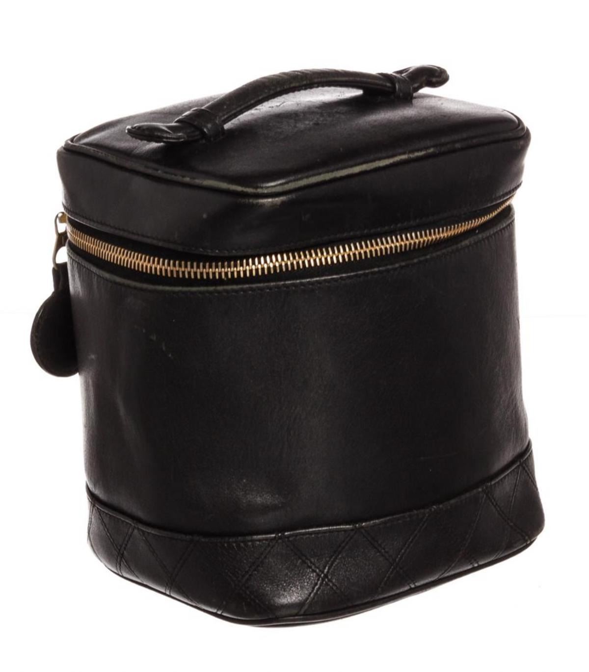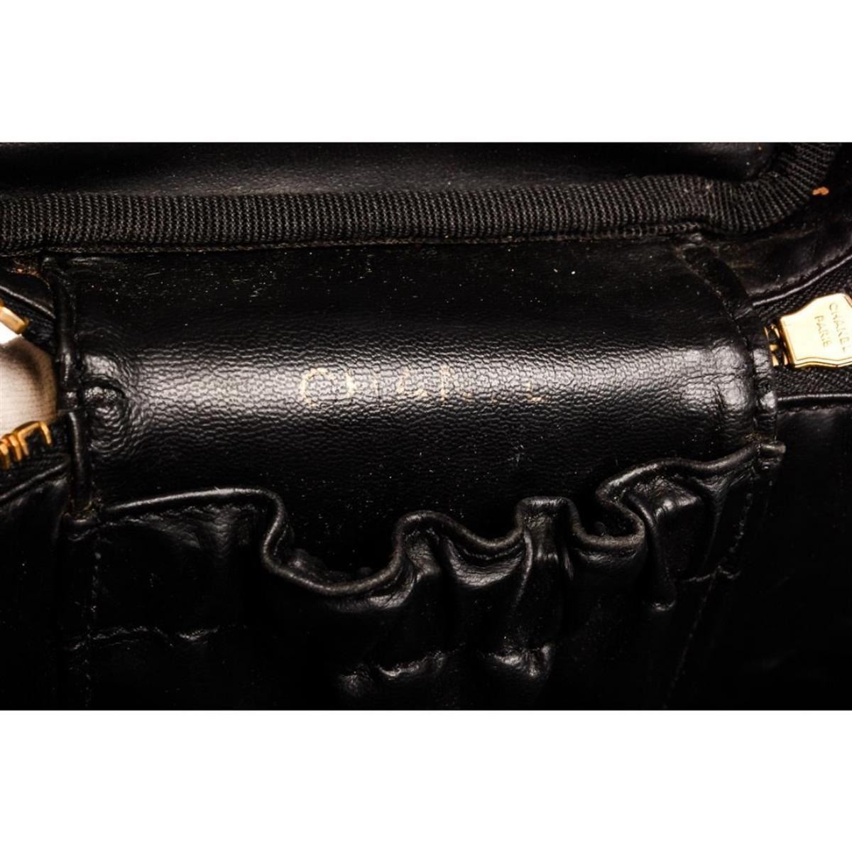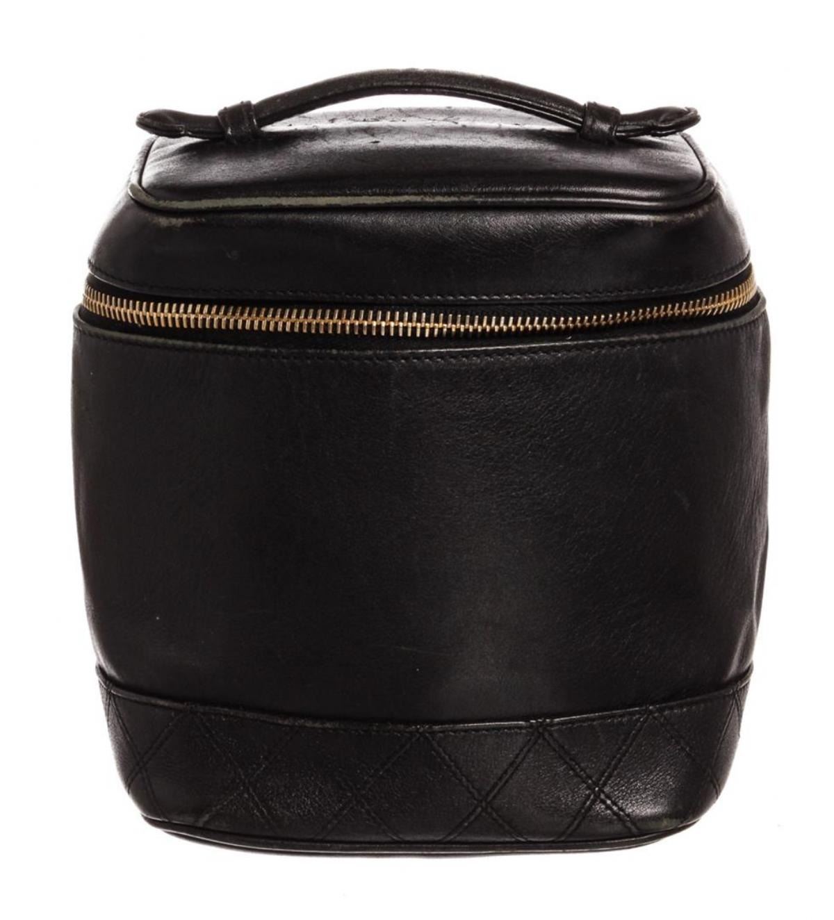 Black quilted leather Chanel vanity case with gold-tone hardware, single flat top handle, single leather lining, single pocket at interior wall and zip closure at front. Authentic.