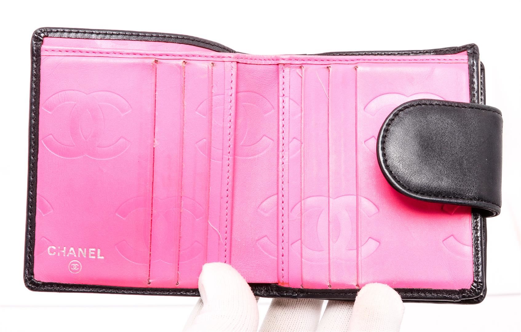 Black quilted leather Chanel Ligne Cambon compact wallet with silver-tone hardware, interlocking CC appliqué at exterior, tonal patent leather trim, single exterior compartment featuring push-lock closure, neon pink jacquard CC lining, single bill compartment, six card slots, dual interior slit pockets and snap closure at back.