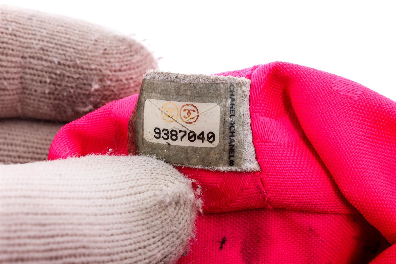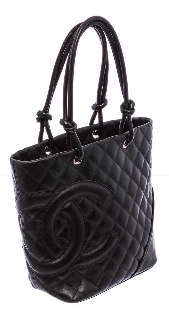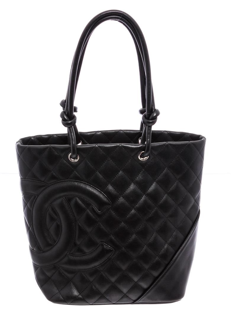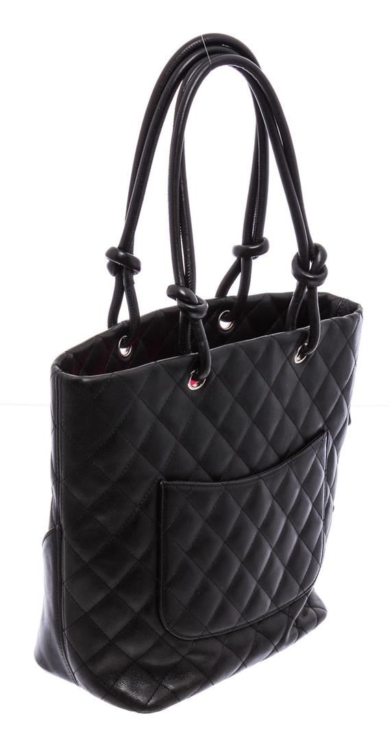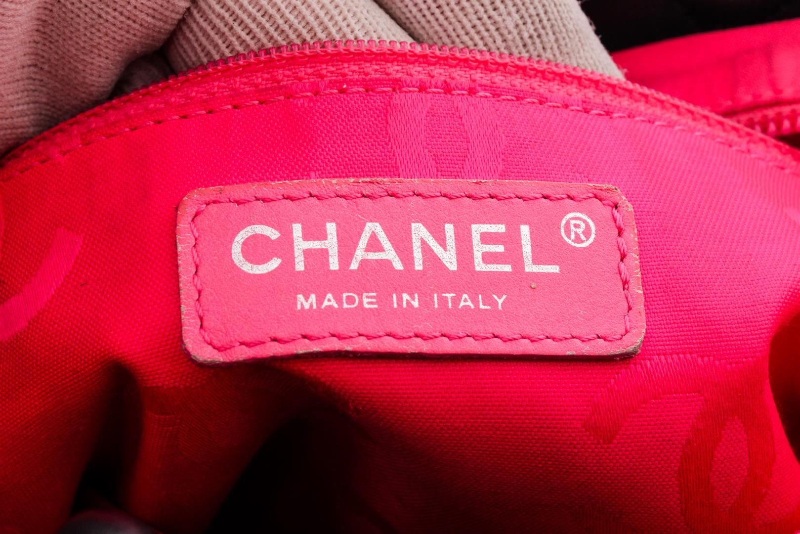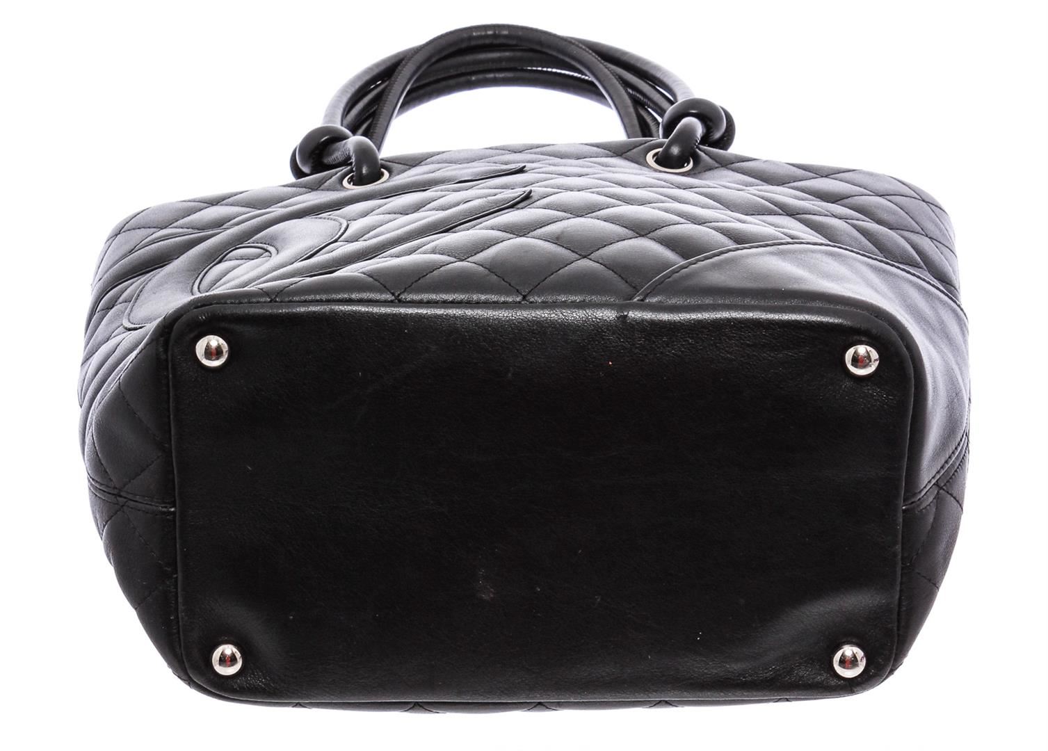 Black quilted lambskin leather Chanel Small Ligne Cambon Bucket tote with silver-tone hardware, dual rolled shoulder straps, CC embossed logo at side, single exterior patch pocket at back, protective feet at base, neon pink logo jacquard lining, dual zip pockets at interior walls, dual pen holsters and zip closure at top.