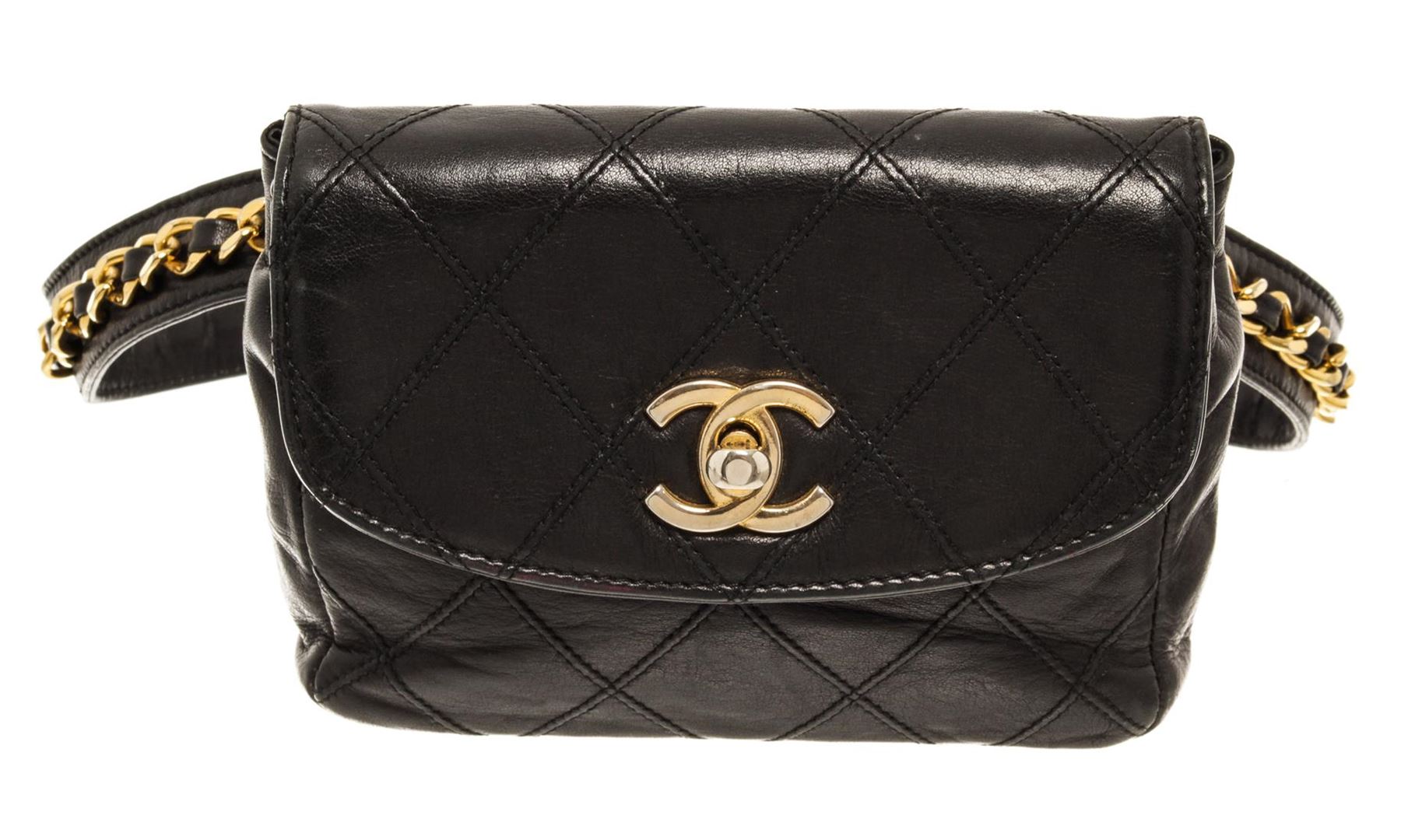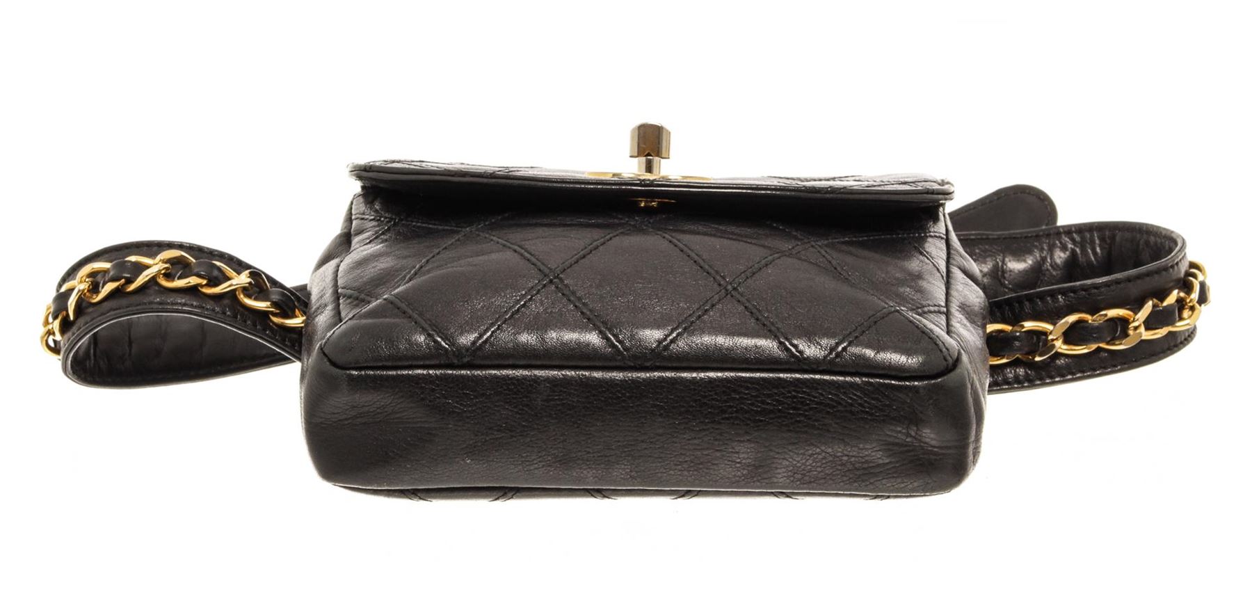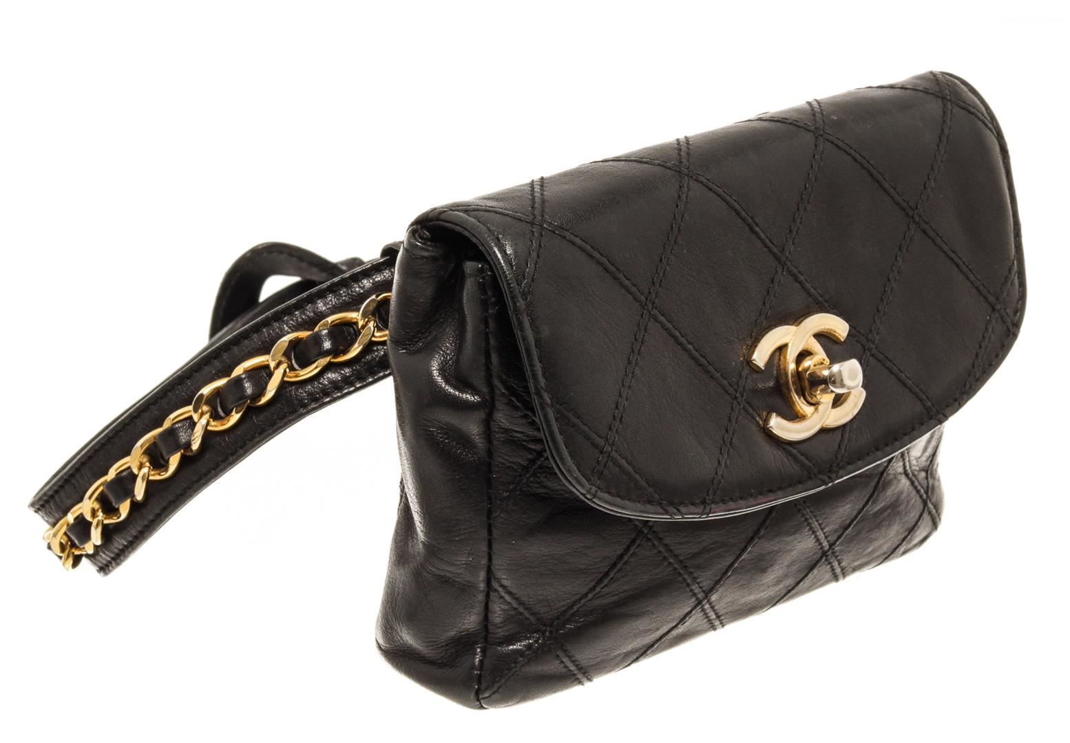 One Chanel Black Quilted Leather Waist Clutch Bag. Item is sold AS-IS. All available information is listed in the description and shown in the photo. Chanel Black Quilted Leather Waist Clutch Bag with gold-tone and silver-tone hardware, black leather lining, interior zip pocket, chain leather waist strap, and flap closure with CC turn-lock. .
