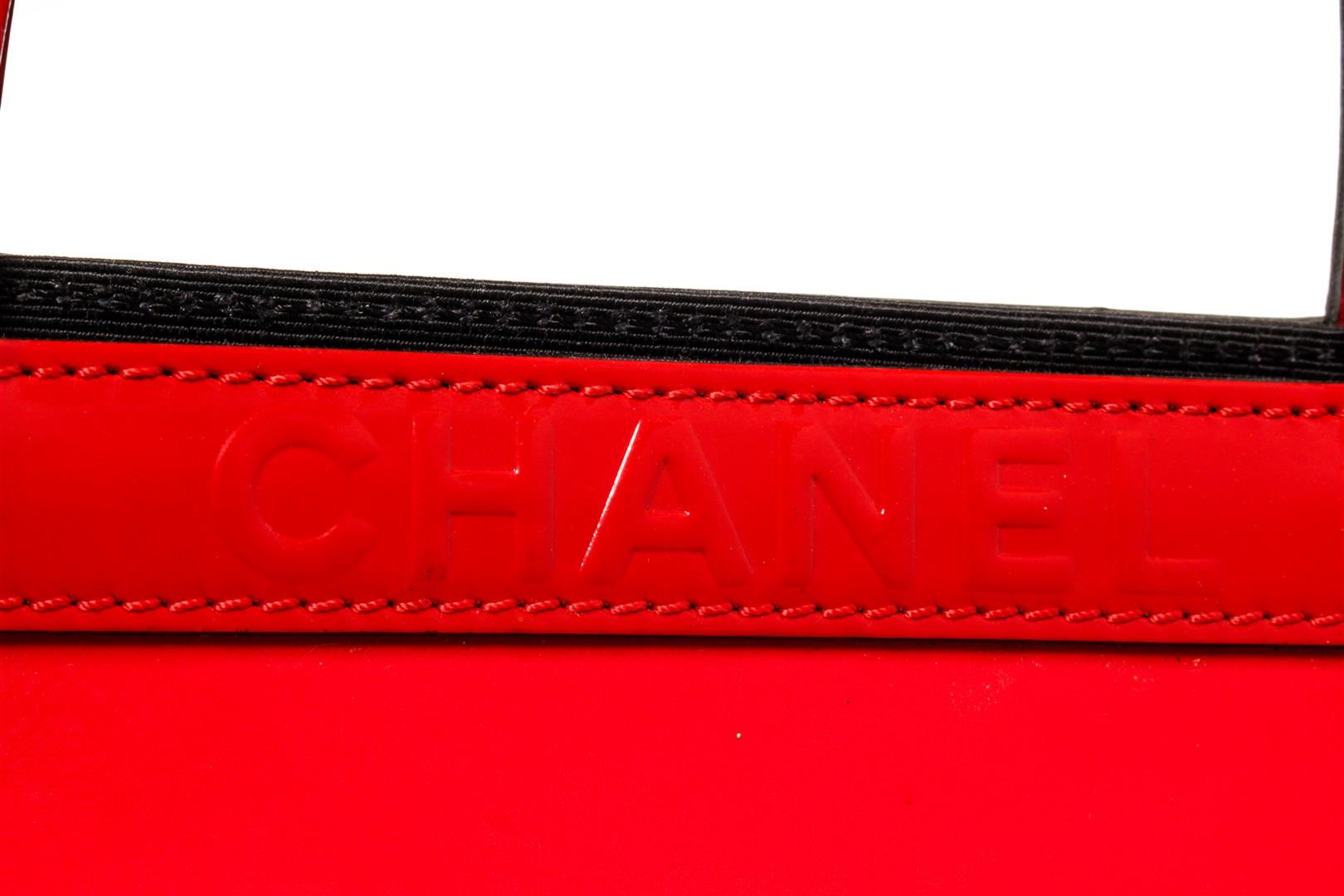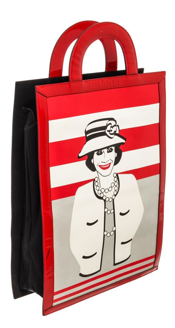 One Chanel Black Red Graphic Print Vintage Mademoiselle Tote Bag. Item is sold AS-IS. All available information is listed in the description and shown in the photo. Chanel Black Red Graphic Print Vintage Mademoiselle Tote Bag with patent leather trim, interior black canvas lining, interior slip and zip pockets, dual flat top handles, and open closure. Please note: scratches and material burn on bay of bag, please see photographs. .