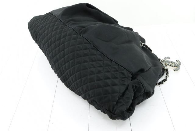 One Chanel Black Satin Melrose Cabas Large Tote Bag. Item is sold AS-IS. All available information is listed in the description and shown in the photo. Black satin Chanel Melrose Cabas tote with silver-tone hardware, quilted satin panel at base, dual chain-link and satin shoulder straps, grey satin interior lining, dual pockets at interior walls and drawstring closure at top. W: 58 cm (at widest) x H 35.5 cm x D: 5 cm