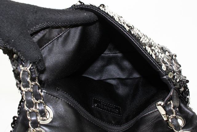One Chanel Black Silver-tone Sequin Leather Summer Night Single Flap Shoulder Bag. Item is sold AS-IS. All available information is listed in the description and shown in the photo. Black and silver-tone sequined satin Chanel Summer Night Flap bag with silver-tone hardware, leather and chain-link shoulder straps, black satin lining, single zip pocket at interior wall and magnetic snap closure at flap. Height: 6.5" Width: 10" Depth: 2.5" Shoulder Strap Drop: 8.5"