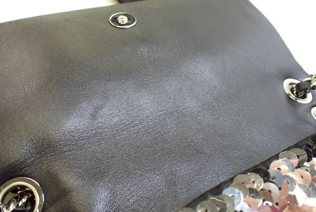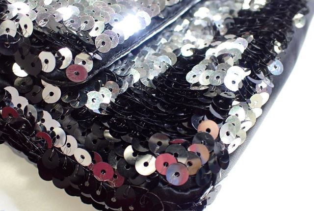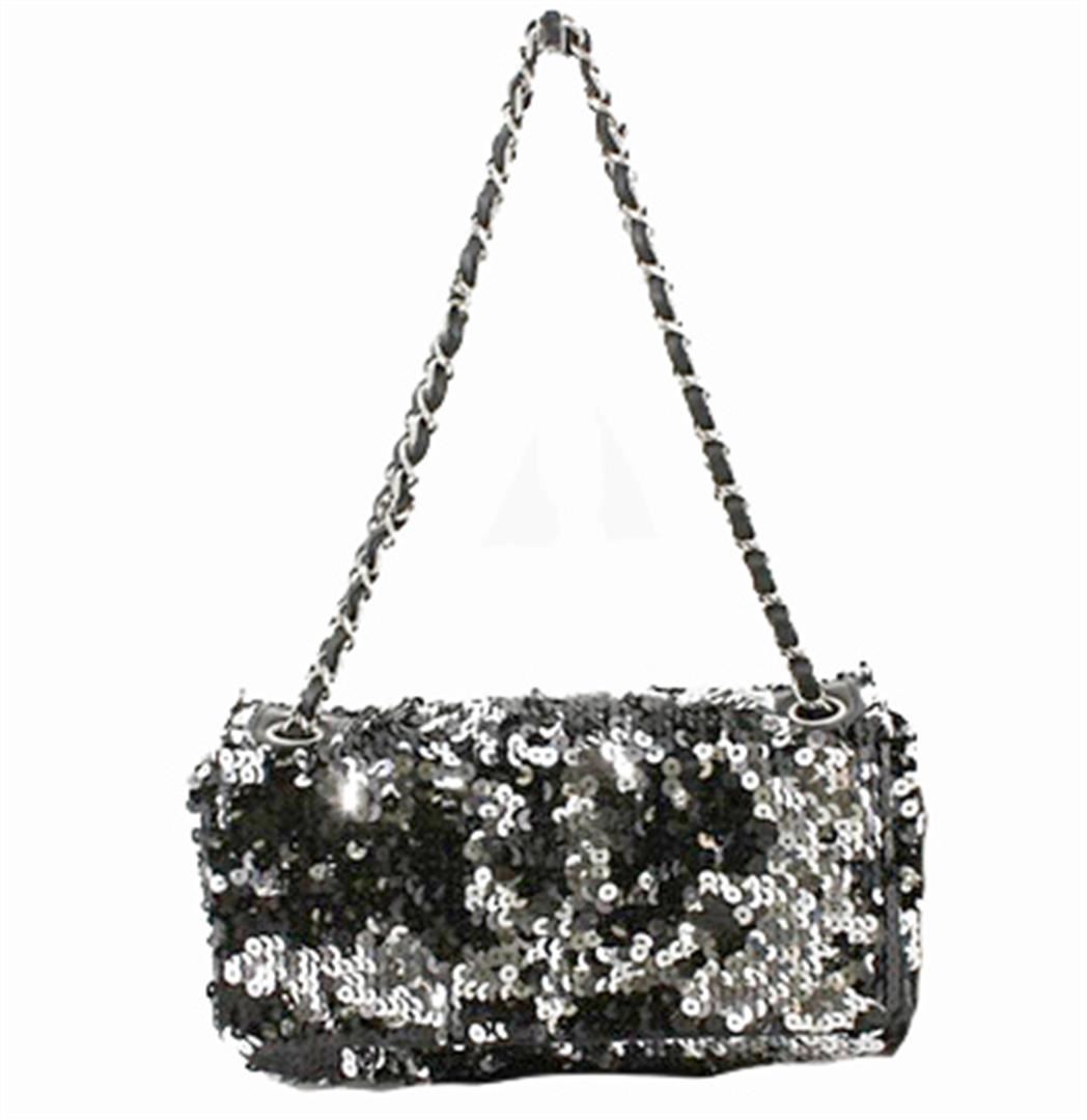 One Chanel Black Silver-tone Sequin Leather Summer Night Single Flap Shoulder Bag. Item is sold AS-IS. All available information is listed in the description and shown in the photo. Black and silver-tone sequined satin Chanel Summer Night Flap bag with silver-tone hardware, leather and chain-link shoulder straps, black satin lining, single zip pocket at interior wall and magnetic snap closure at flap. Height: 6.5" Width: 10" Depth: 2.5" Shoulder Strap Drop: 8.5"