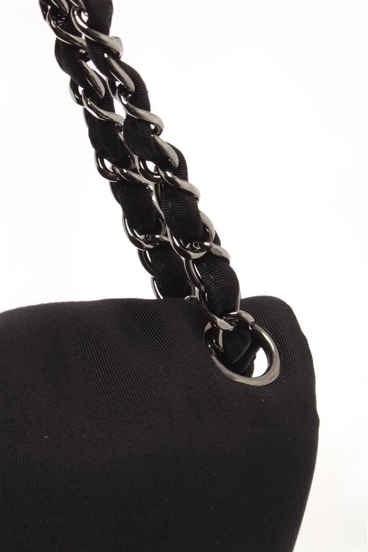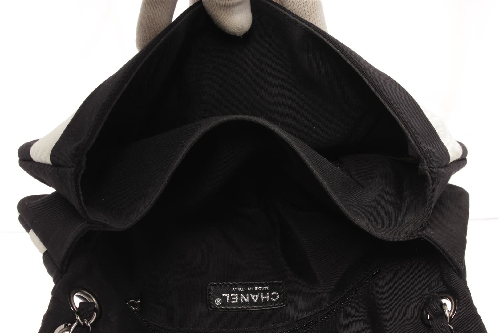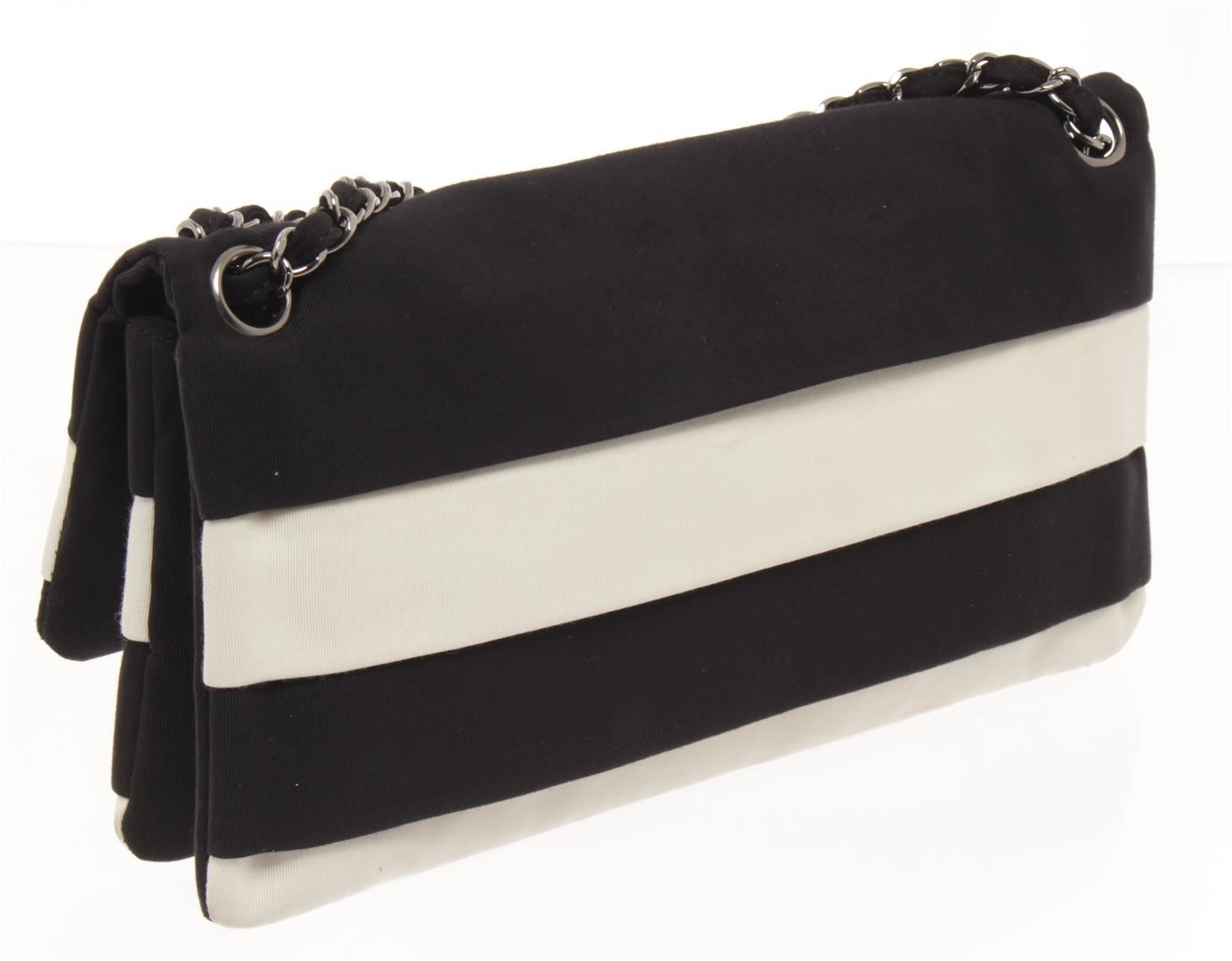 Chanel Black White Canvas 2.55 Reissue Flap Shoulder Bag. All available information is listed in the description and shown in the photos. Chanel 2.55 black and white striped canvas handbag with silver-tone hardware, chain handle and silver metal clasp, two interior compartments and one zipped. Width 28 cm, Height 16 cm, Depth 3 cm/ 11.02" x 6.29" x 1.18"