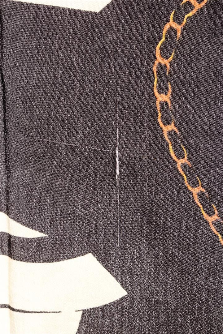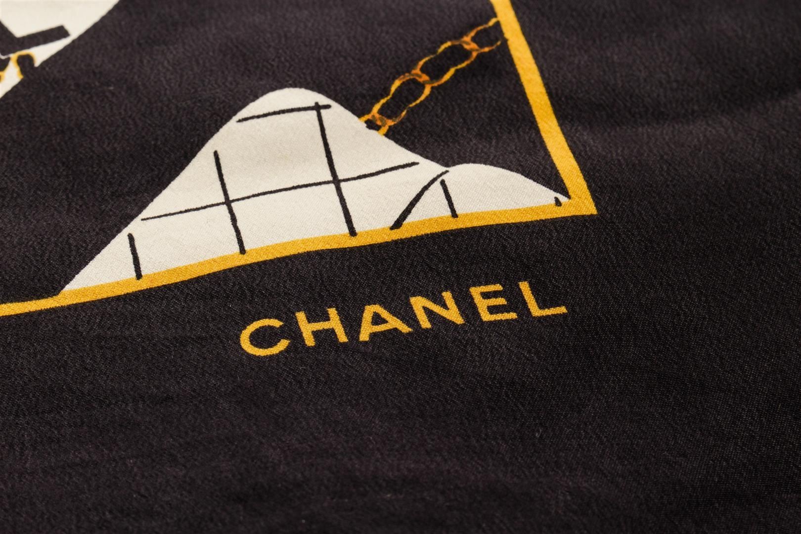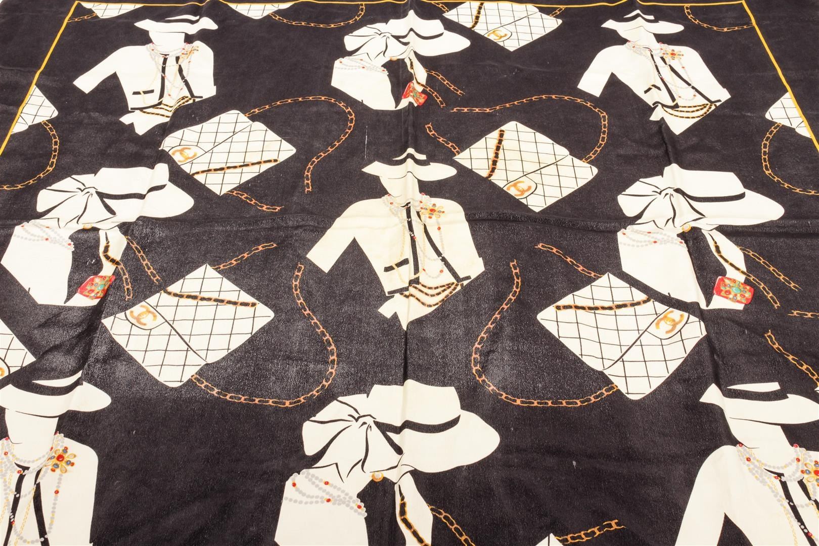 One Chanel Black White Silk Chanel Scarf. Item is sold AS-IS. All available information is listed in the description and shown in the photo. Chanel Black White Silk Chanel Scarf. Features white, black, and yellow stitching. Please note minor wear in silk.