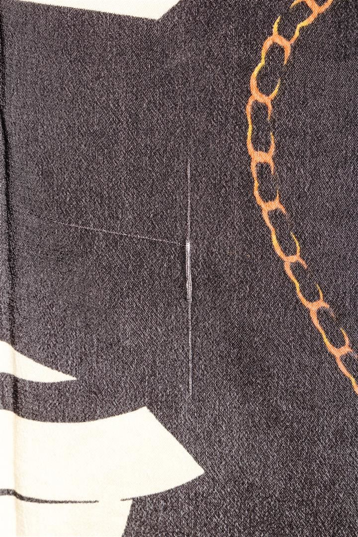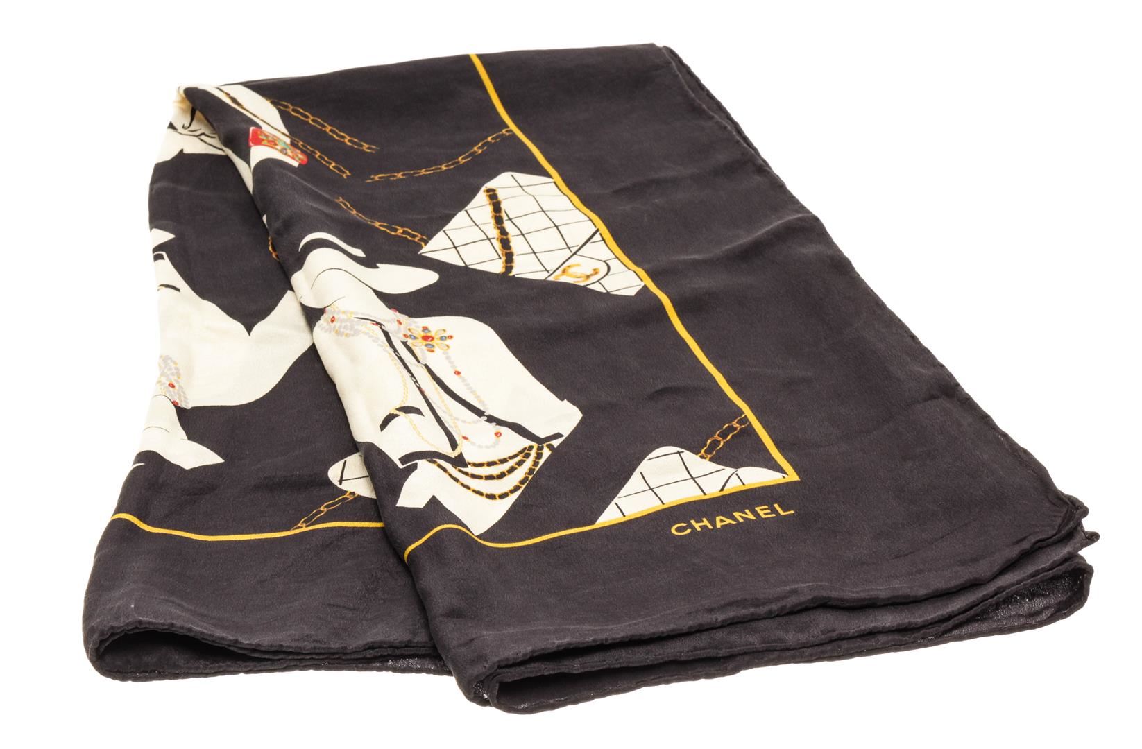 One Chanel Black White Silk Chanel Scarf. Item is sold AS-IS. All available information is listed in the description and shown in the photo. Chanel Black White Silk Chanel Scarf. Features white, black, and yellow stitching. Please note minor wear in silk.