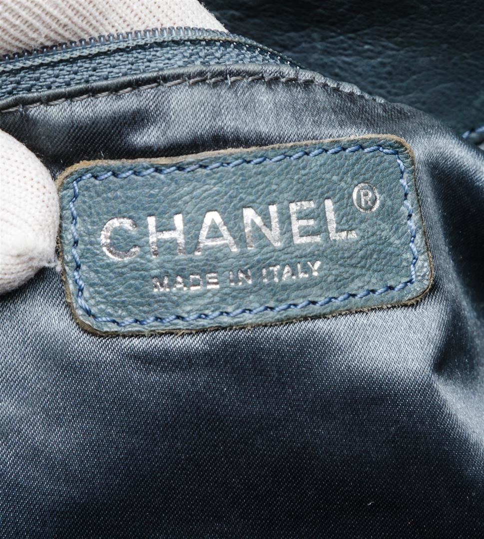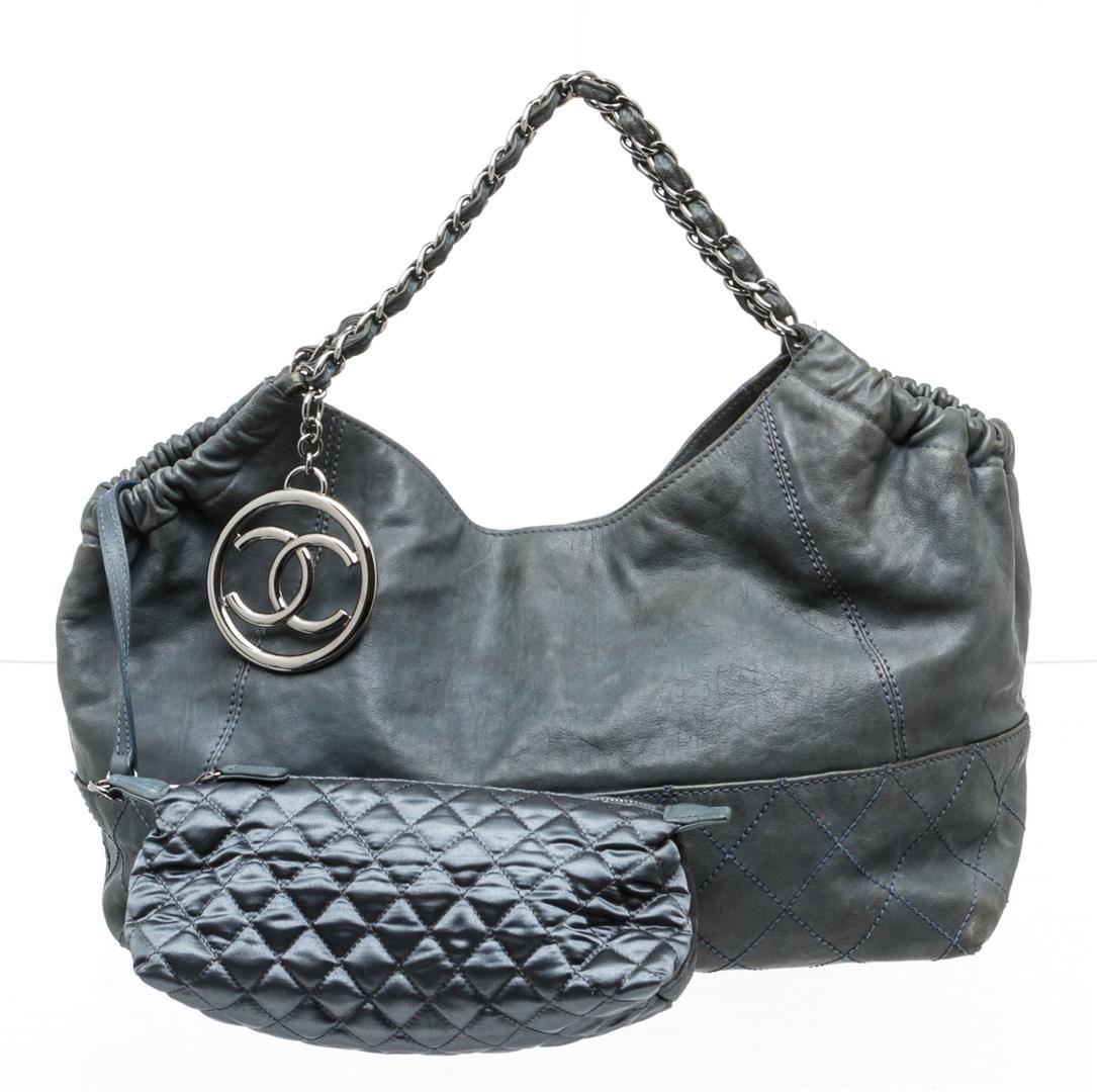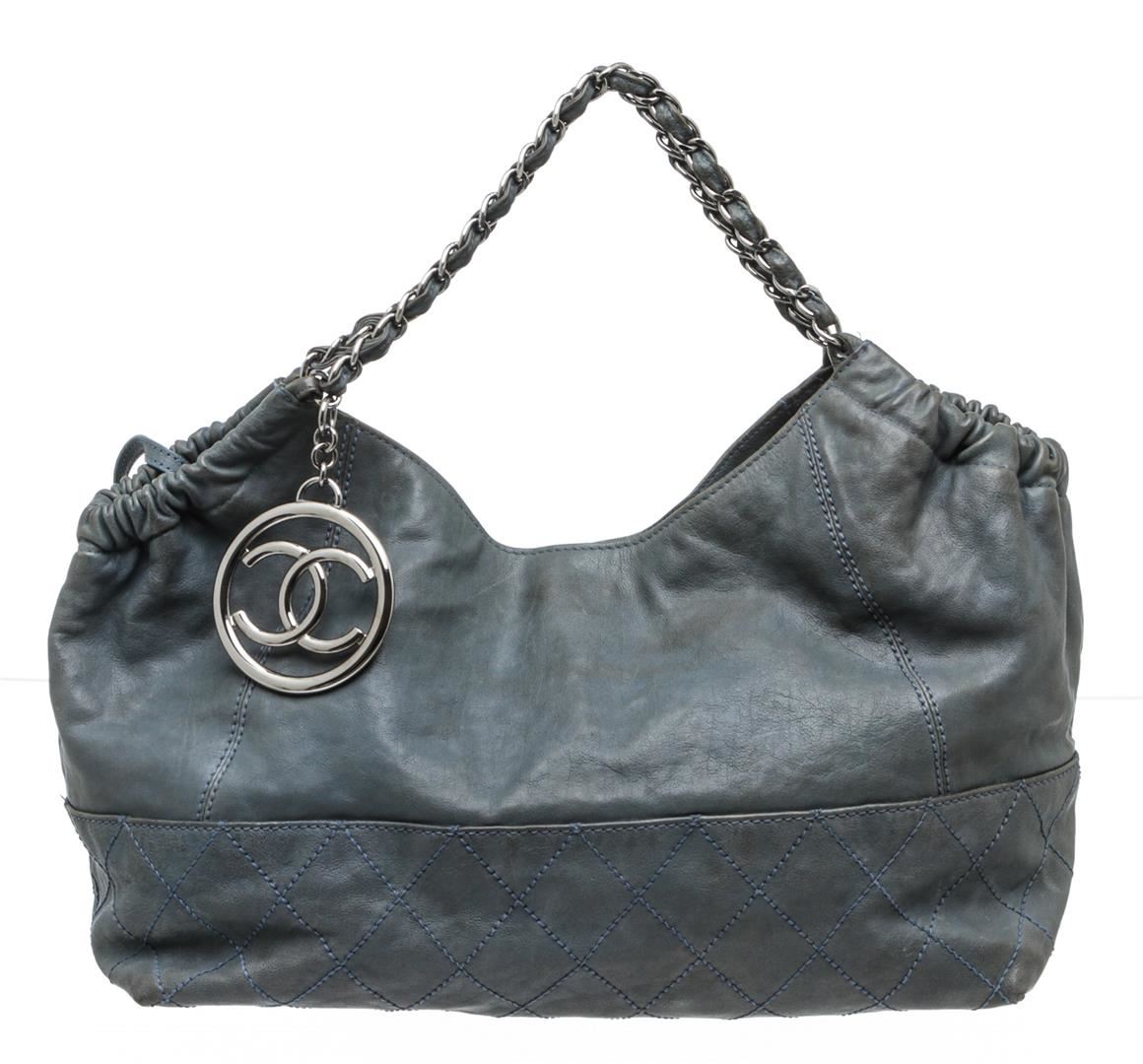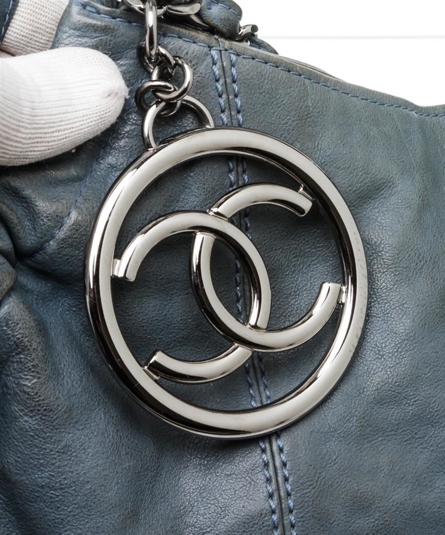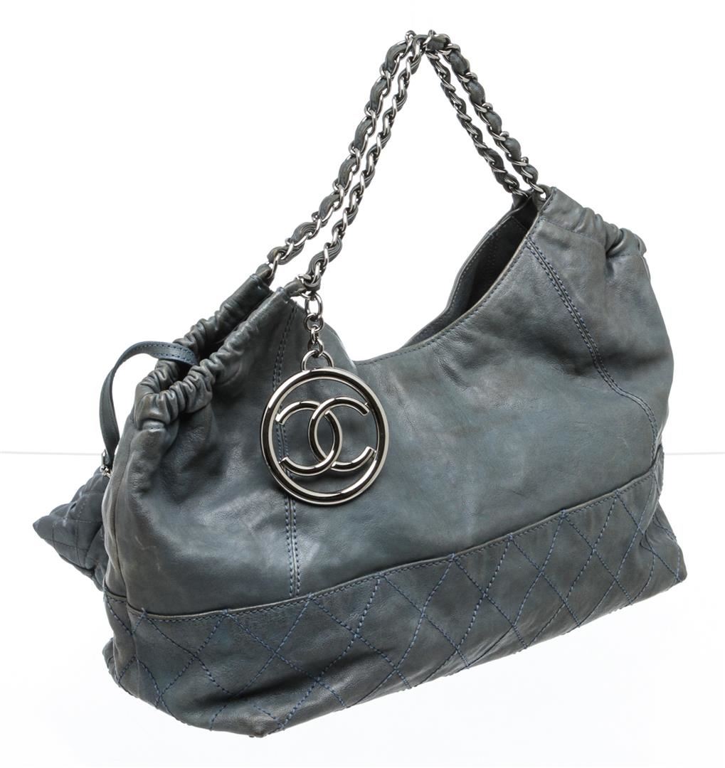 Chanel blue leather Coco Cabas shoulder bag with silver-tone hardware, chain-link and leather straps, CC charm at front, quilting detail at base, tonal satin lining, interior zip pocket, two interior slip pockets, and magnetic snap closure. Optional interior satin quilted pouch. Please note: Some color discoloration around corners.