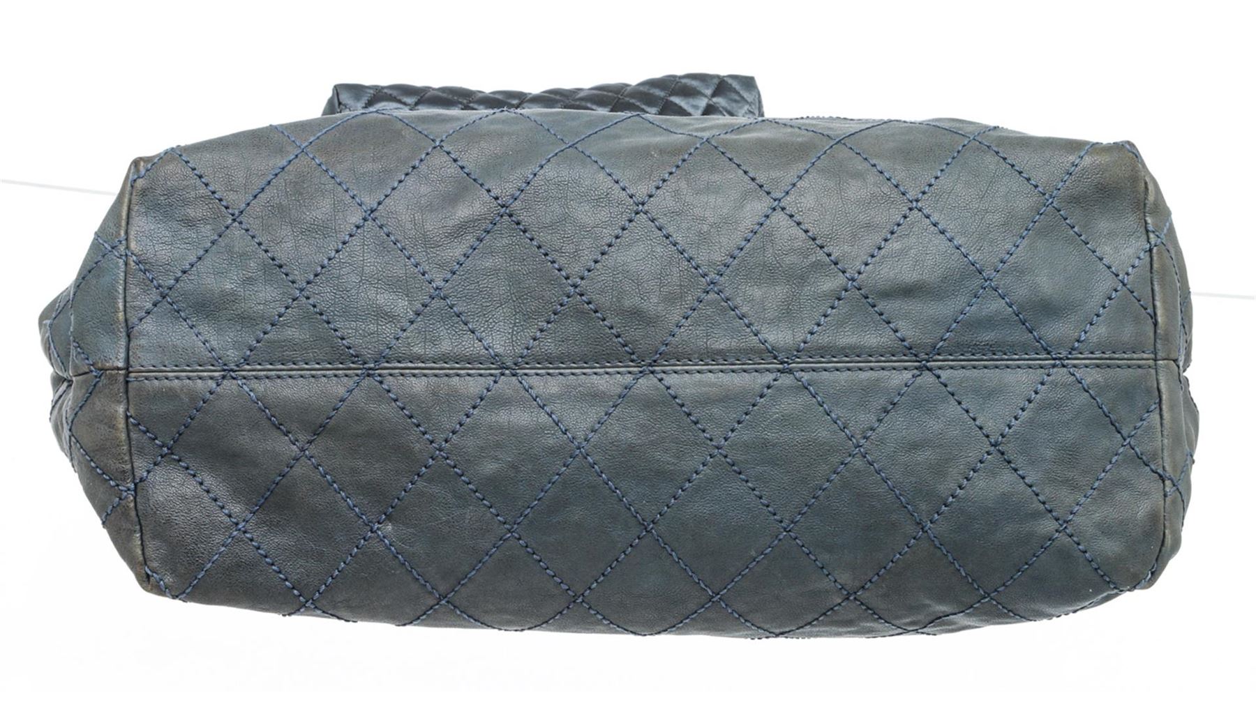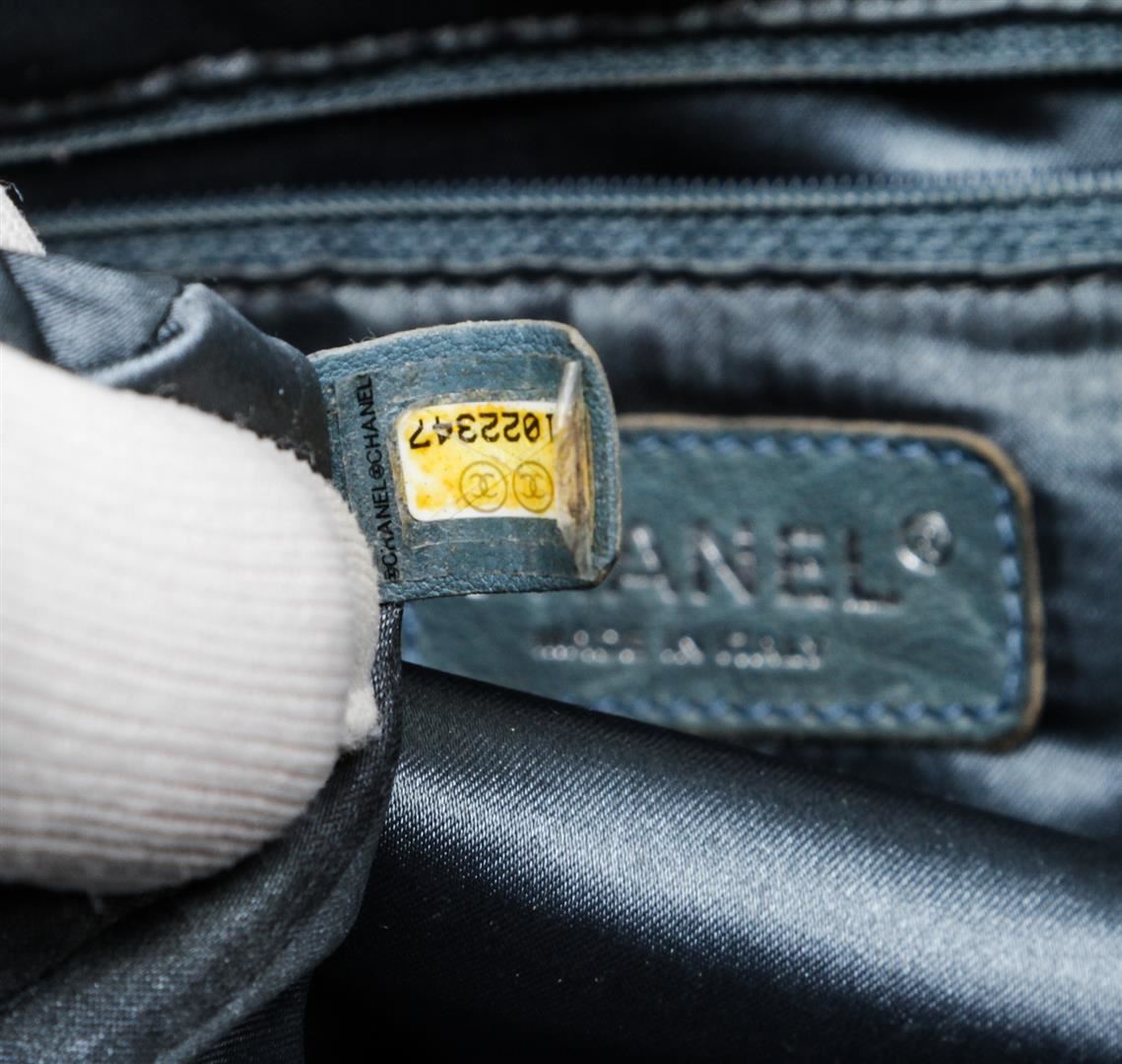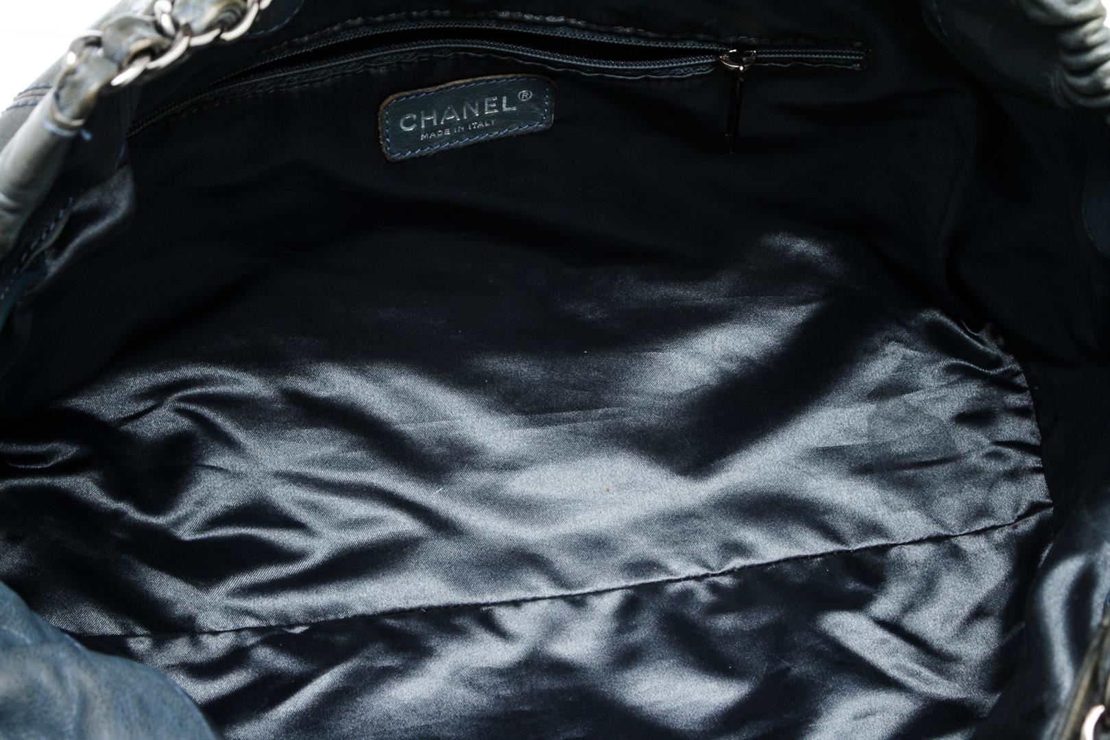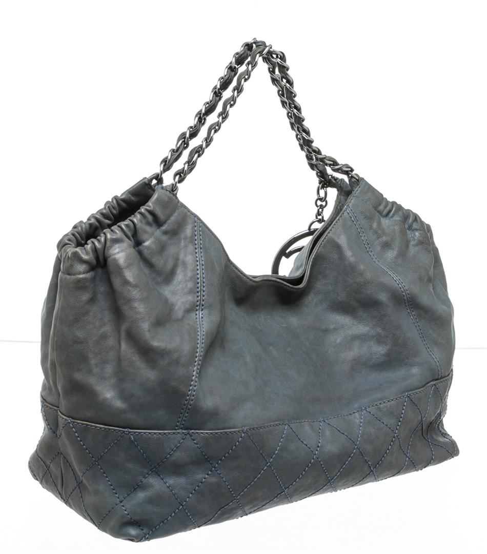 Chanel blue leather Coco Cabas shoulder bag with silver-tone hardware, chain-link and leather straps, CC charm at front, quilting detail at base, tonal satin lining, interior zip pocket, two interior slip pockets, and magnetic snap closure. Optional interior satin quilted pouch. Please note: Some color discoloration around corners.