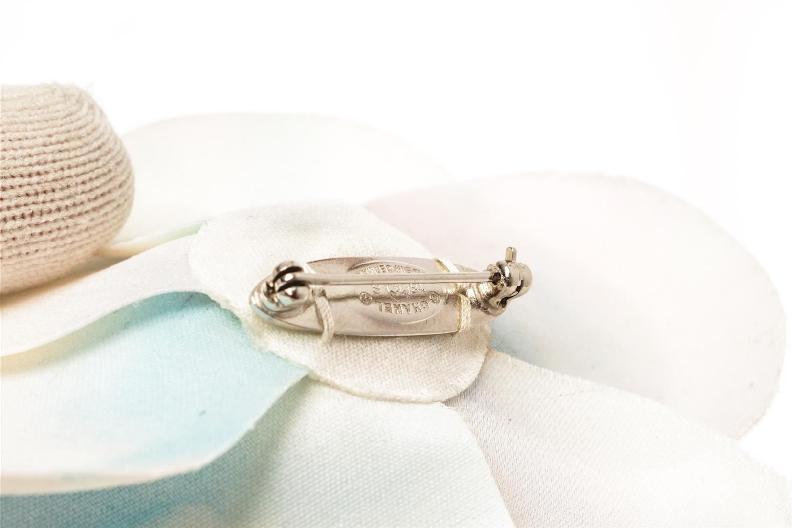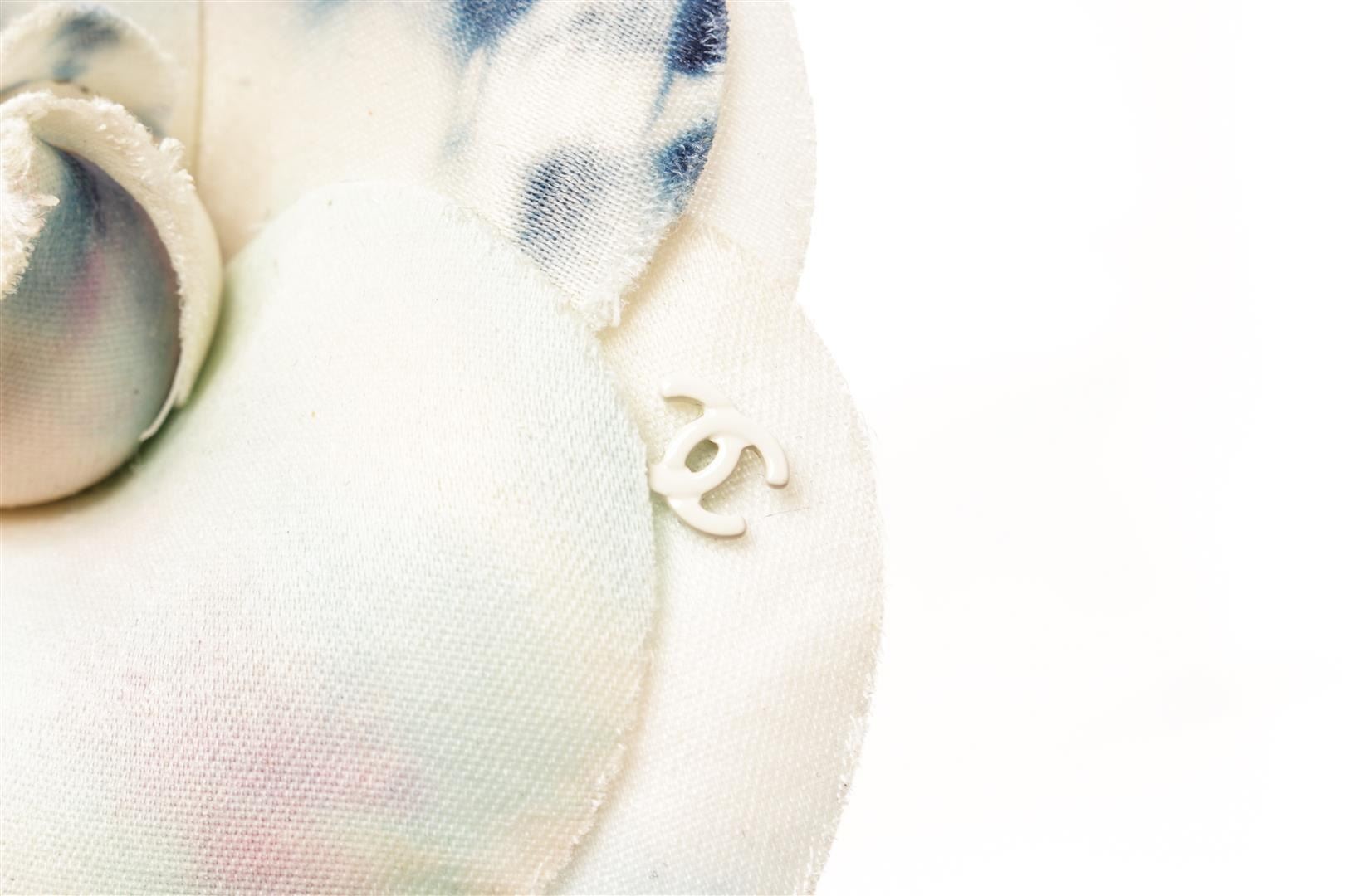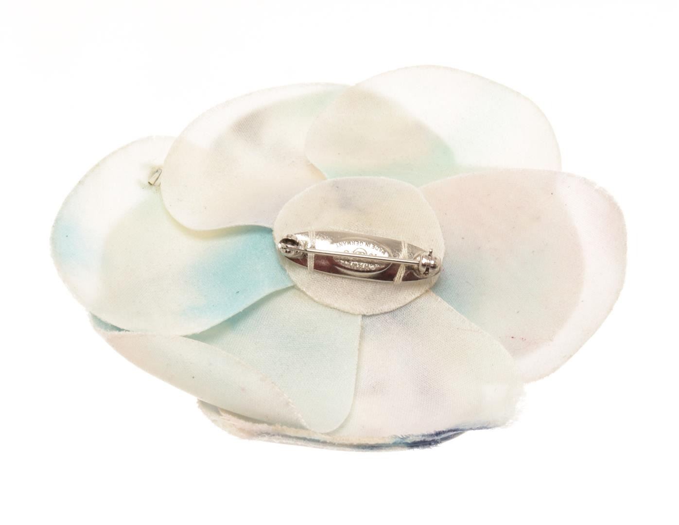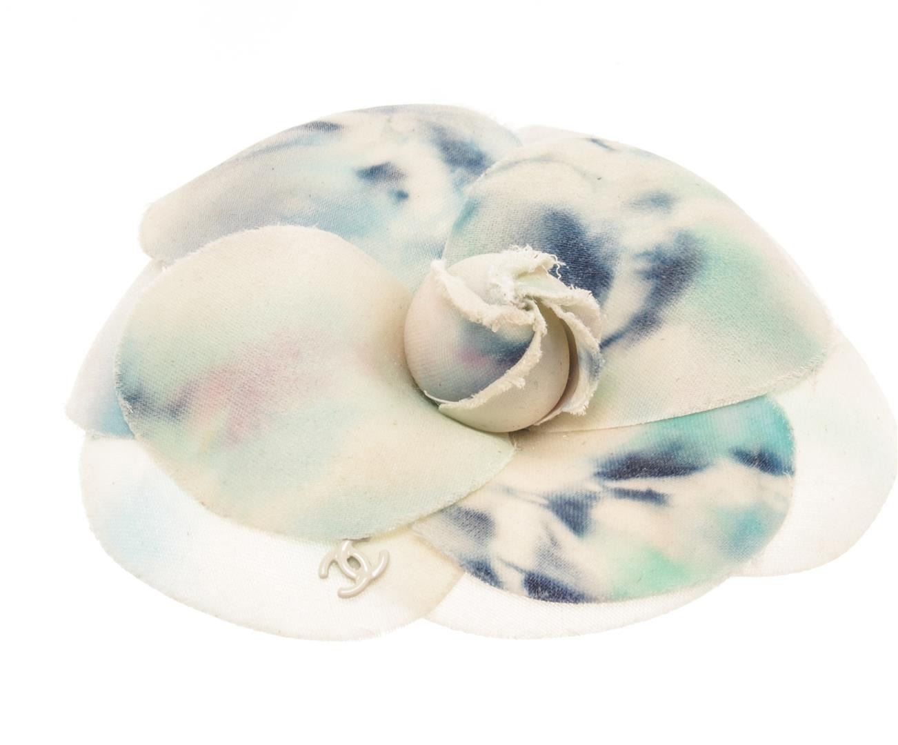 Chanel Blue Silk Tie Dye Camellia Brooch. All available information is listed in the description and shown in the photos. Chanel Blue Silk Tie Dye Camellia Brooch with silver-tone hardware. Height: 1 in (2.54 cm), Width: 5 in (12.7 cm), Depth: 1 in (2.54 cm)