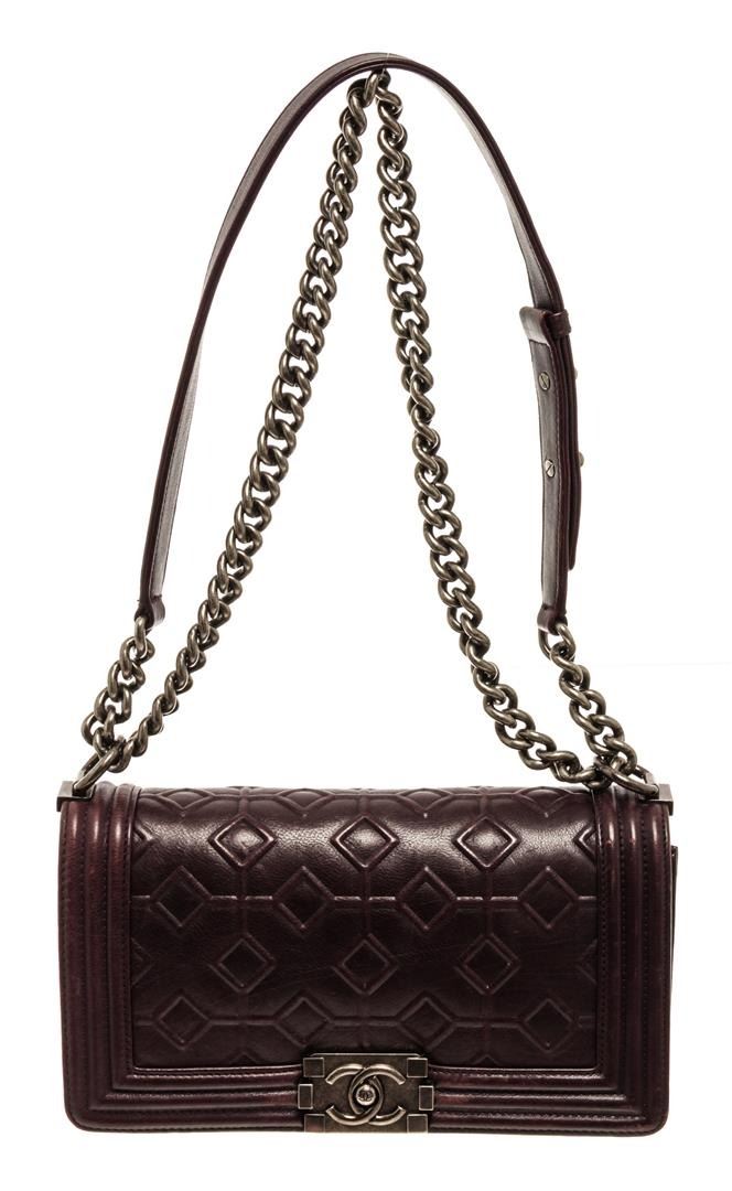 Chanel Boy Flap Bag Shoulder Bag. Brand: Chanel, Style: Boy Flap Bag, Type: Shoulder Bag, Exterior color: Maroon, Exterior material: Lambskin, Interior color: Grey, Interior material: Canvas, Length: 8, Width: 3, Height: 5. Item is sold AS-IS and all info