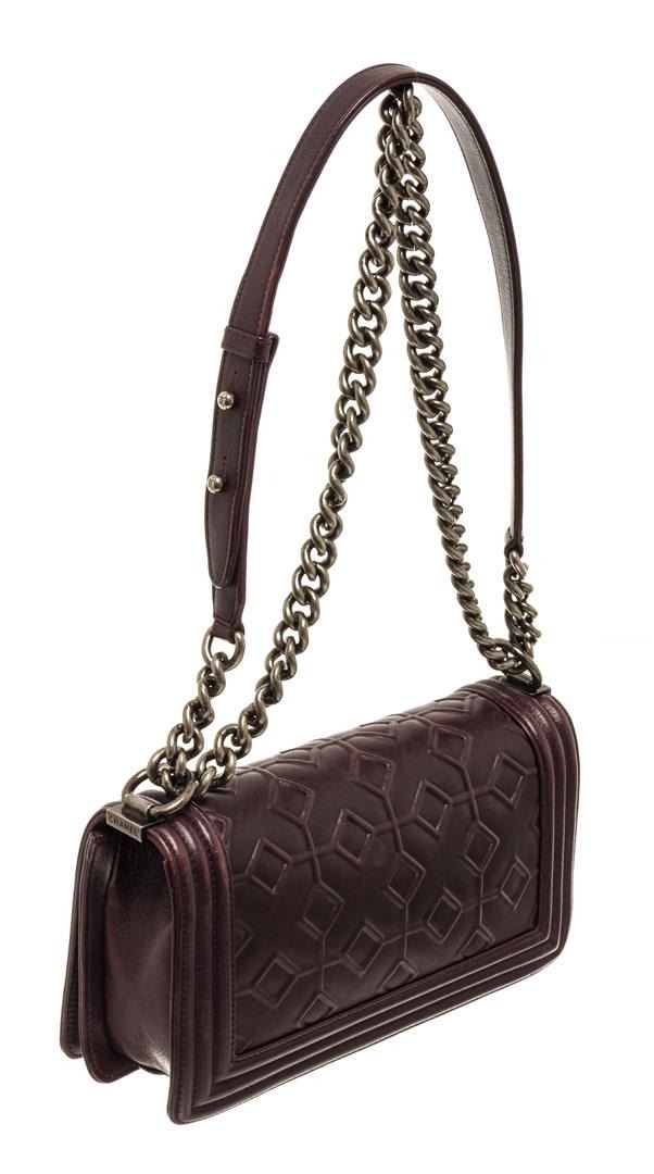 Chanel Boy Flap Shoulder Bag Maroon Lambskin. Brand: Chanel, Style: Boy Flap, Type: Shoulder Bag, Exterior Color: Maroon, Exterior Material: Lambskin, Exterior Pockets: None, Interior Color: Grey, Interior Material: Canvas, Interior Pockets: One Zip, Handle/Strap Type: Chain Strap, Length: 8, Width: 3, Height: 5, Strap Drop: 22. Condition: Leather is worn. Item is sold AS-IS and all information pertaining to this lot is available in the photos or this description.