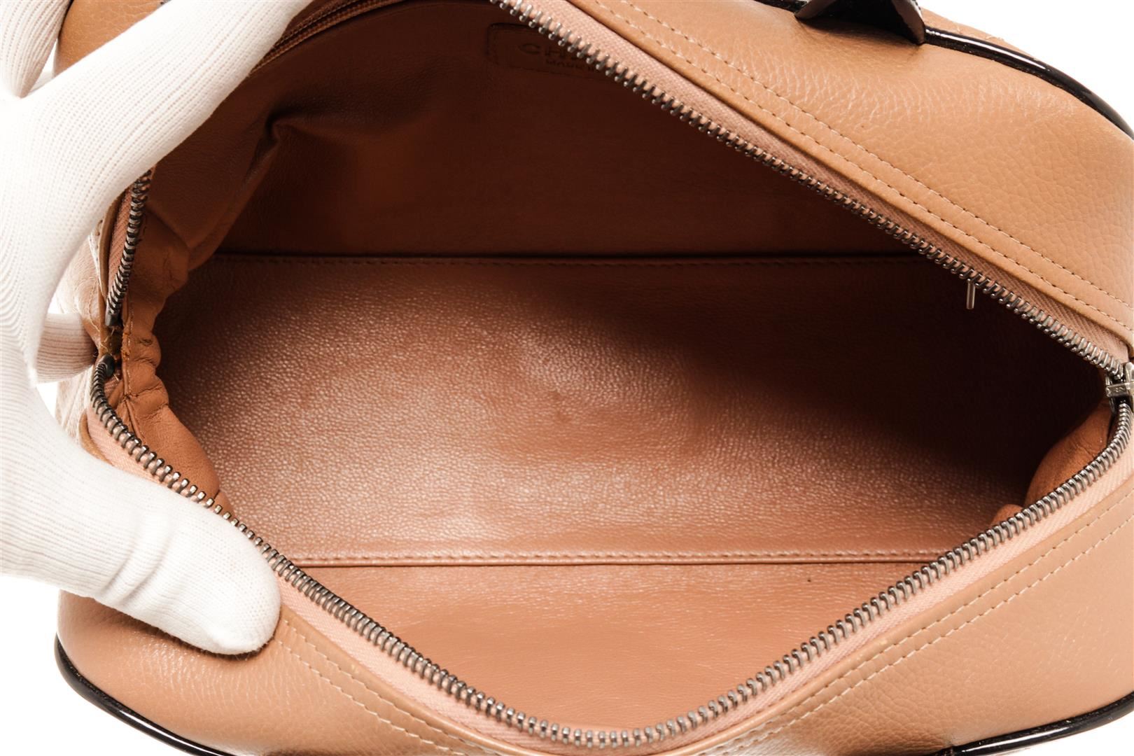 One Chanel Brown Black Quilted Caviar Mini Boston Bowler Bag. Item is sold AS-IS. All available information is listed in the description and shown in the photo. Chanel Brown Black Quilted Caviar Mini Boston Bowler Bag with brass hardware, foot base, exterior zip pocket, Chanel scripted logo at the front, brown leather lining, dual rolled leather handles, zip closure at the top. .