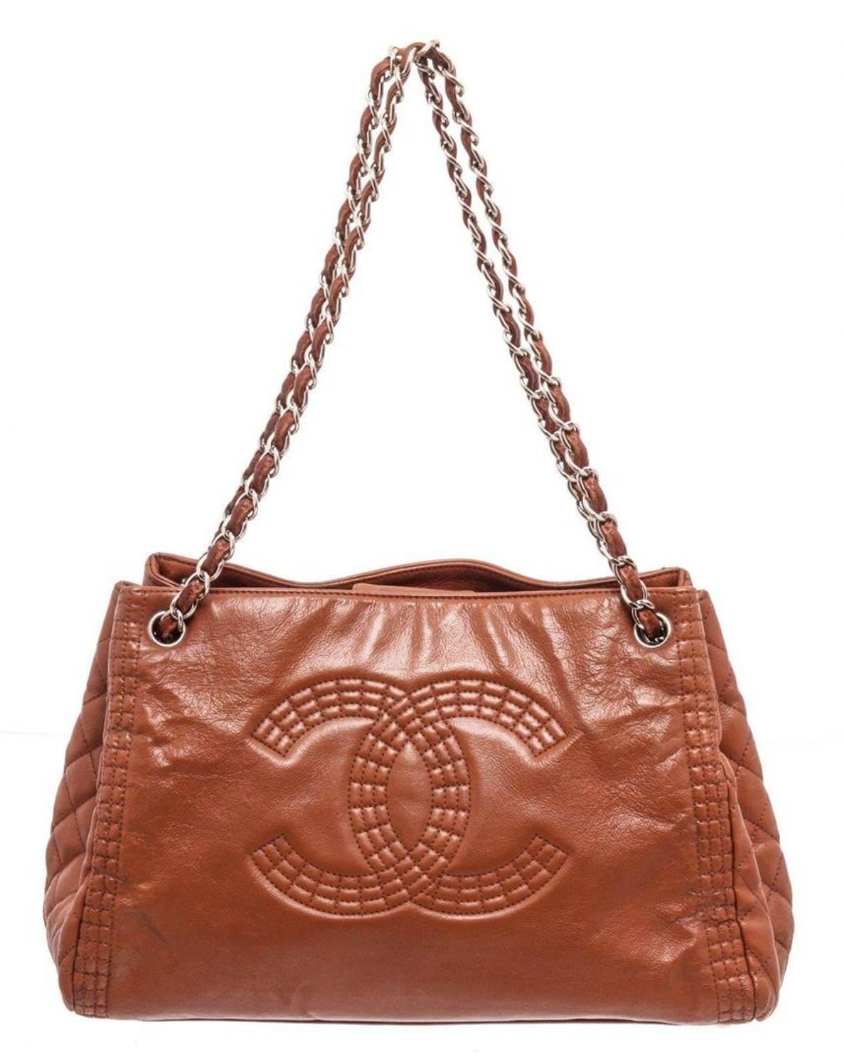 Chanel Brown Caviar Leather Chain CC Shoulder Bag with gold-tone hardware, leather trim, interior flap pockets, chain leather shoulder strap, and flap closure. Peeling on quilted side of bag. Measurements: Length: 4 in / 10 cm Width: 11 in / 28 cm 8 in / 20 cmCONDITION: Pre-Owned Good overall, please see photographs for detail.