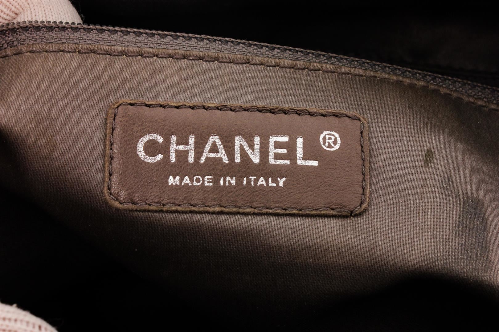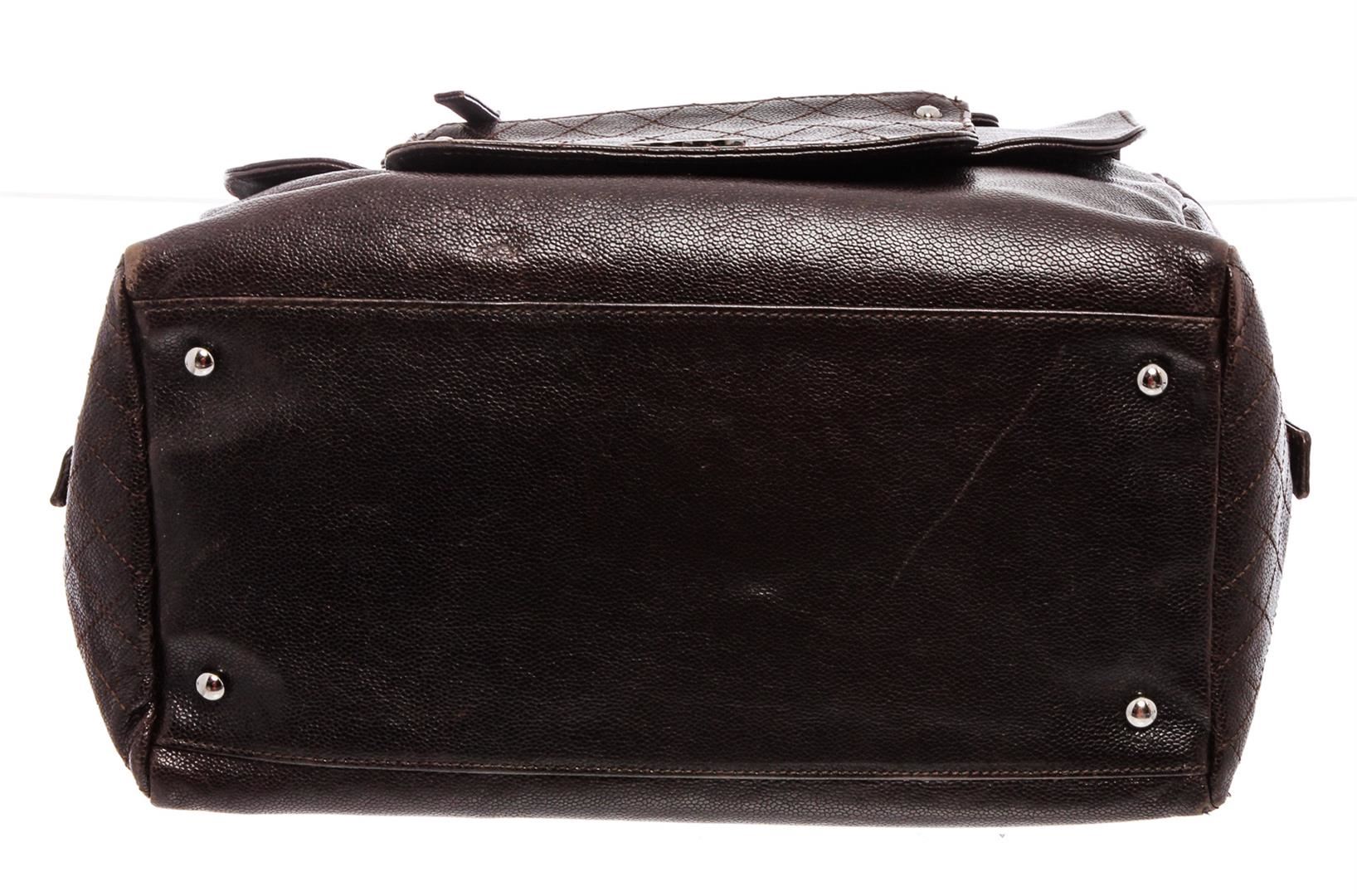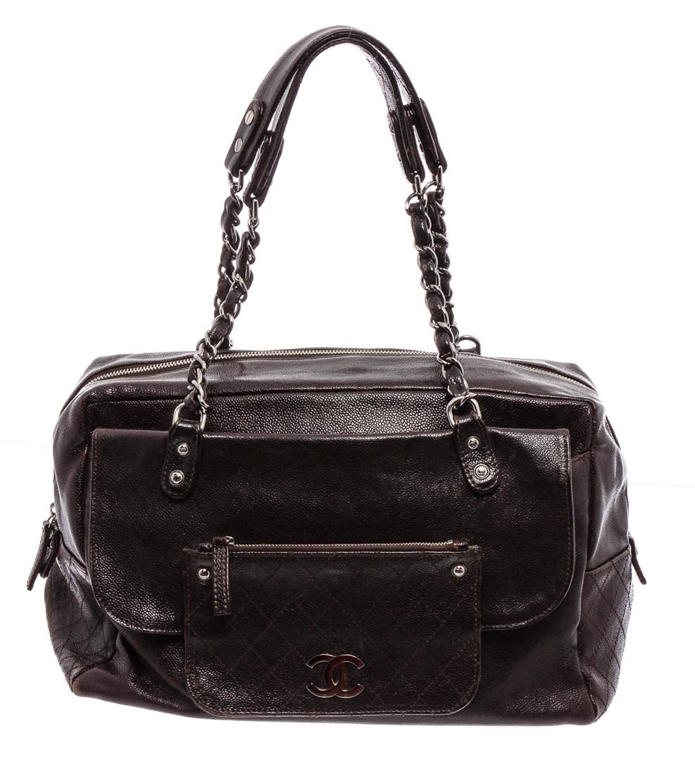 Brown quilted caviar leather Chanel Pocket In The City Flap Bag with antiqued silver-tone hardware, dual pockets at exterior; one with CC adornment, dual chain-link and leather shoulder straps, three interior compartments; dual with fold-over flap closures, grey satin lining, three interior compartments, three interior pockets; single zip pocket at interior wall and zip closure at top.