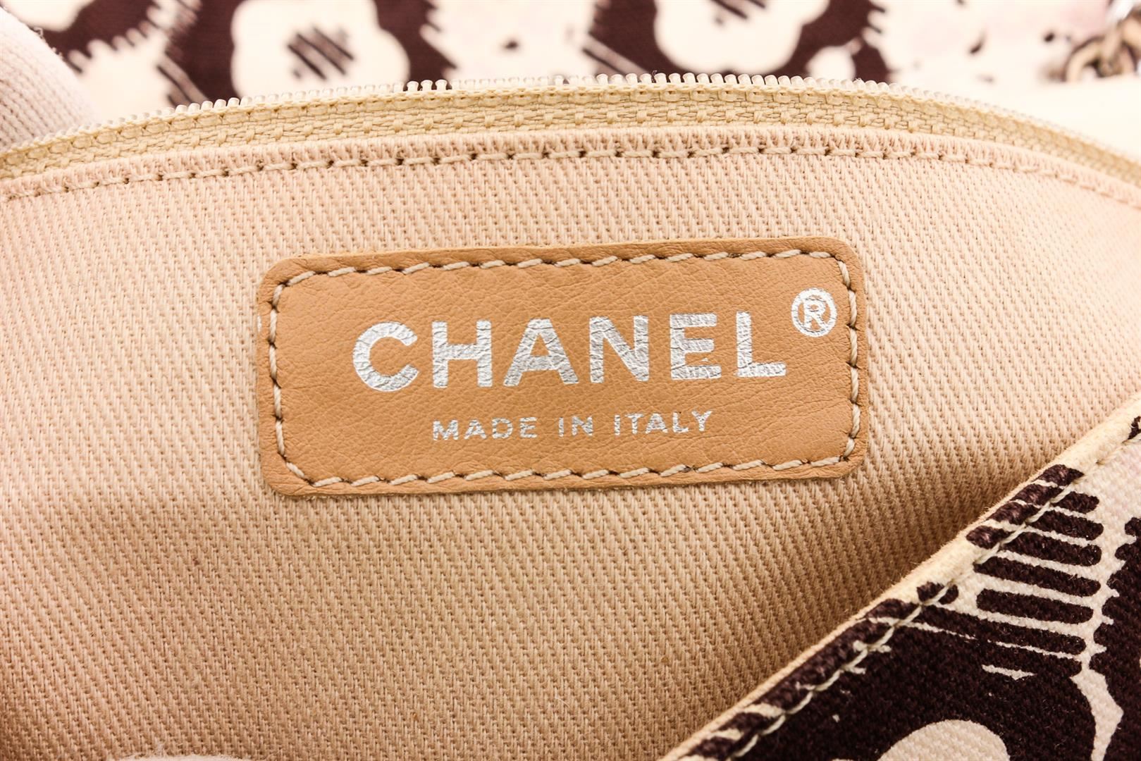 Crafted out of cream and brown Camelia fabric pattern, silver-tone hardware, and turn lock CC at front flap. Inner cream fabric lining.