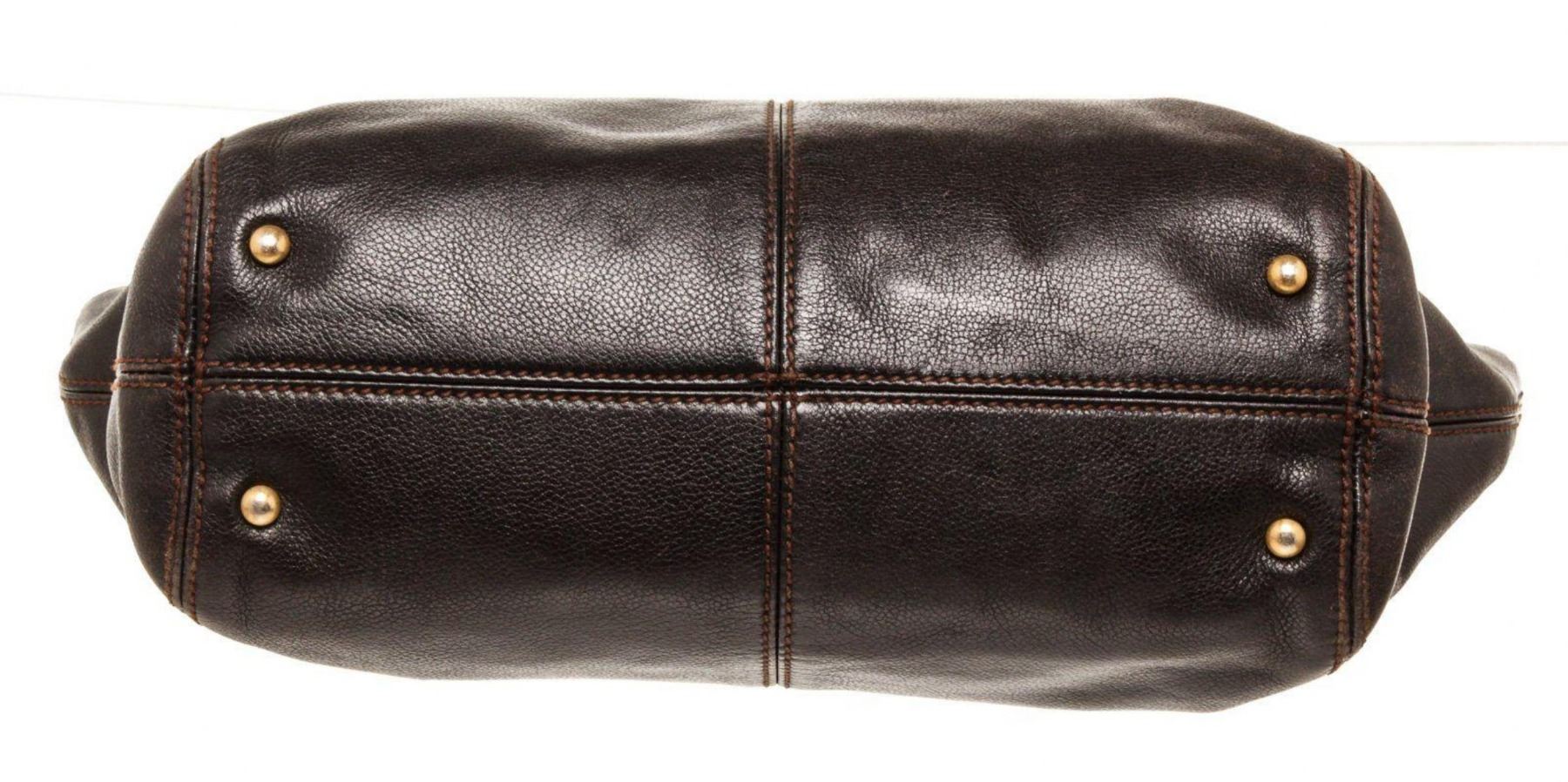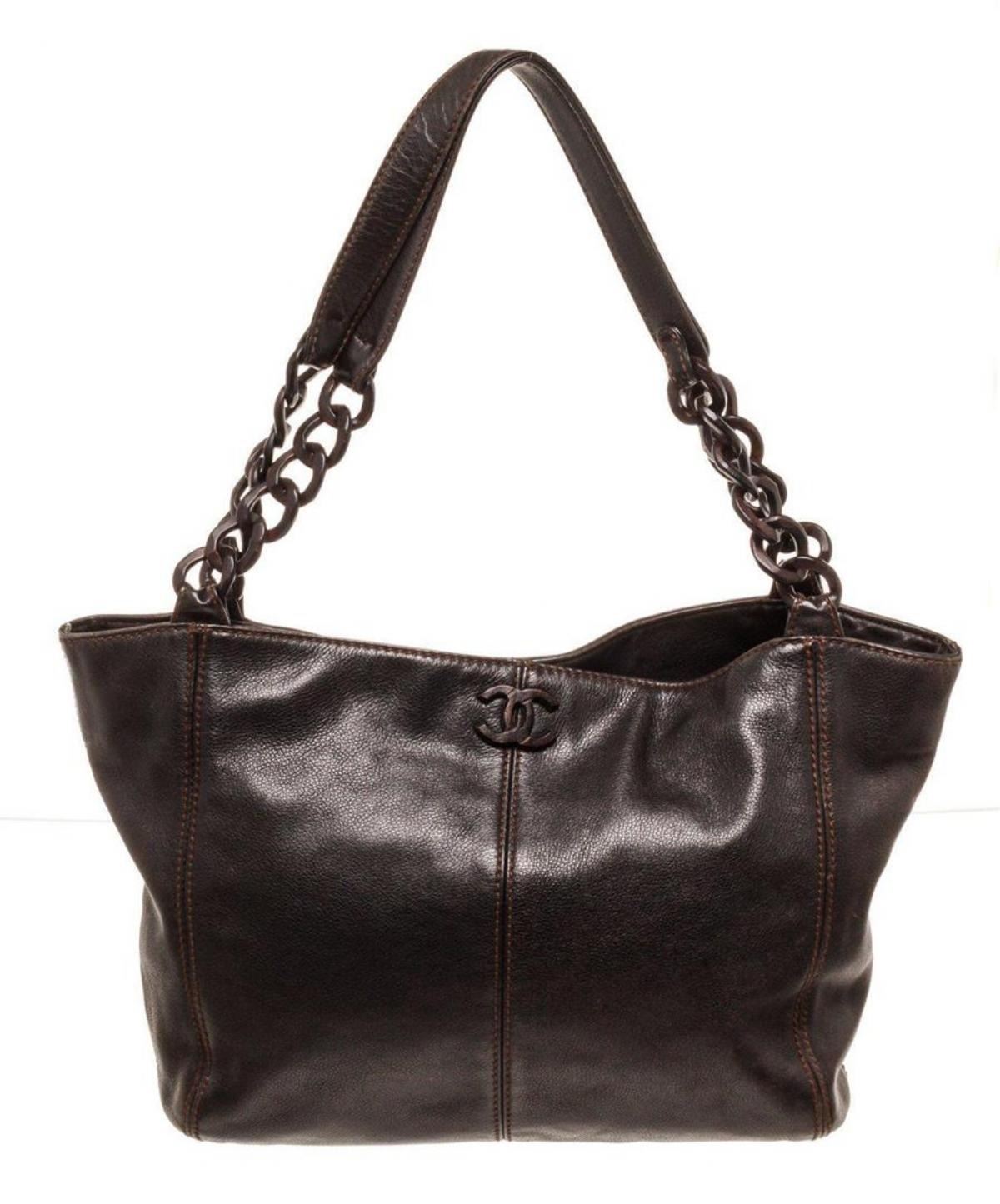 Chanel Brown Leather CC Resin Chain Tote Bag with material Leather, gold-tone hardware, Brown leather trim, interior Zip pocket, Canvas Lining, Leather shoulder strap and snap closure.