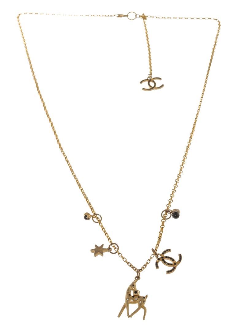 Chanel CC Bambi Deer Necklace. All available information is listed in the description and shown in the photos. Chanel CC Bambi Deer Necklace with gold tone metal hardware and pendants, clear and black rhinestones, and CC logo pendants.