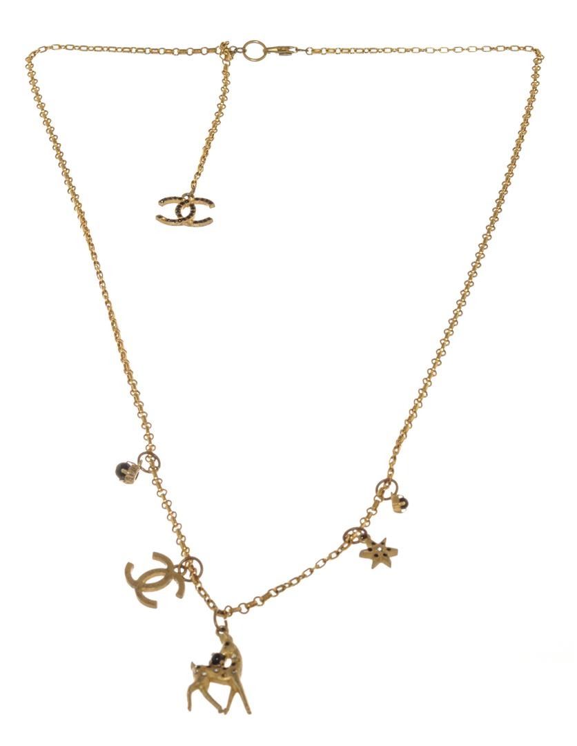 Chanel CC Bambi Deer Necklace. All available information is listed in the description and shown in the photos. Chanel CC Bambi Deer Necklace with gold tone metal hardware and pendants, clear and black rhinestones, and CC logo pendants.
