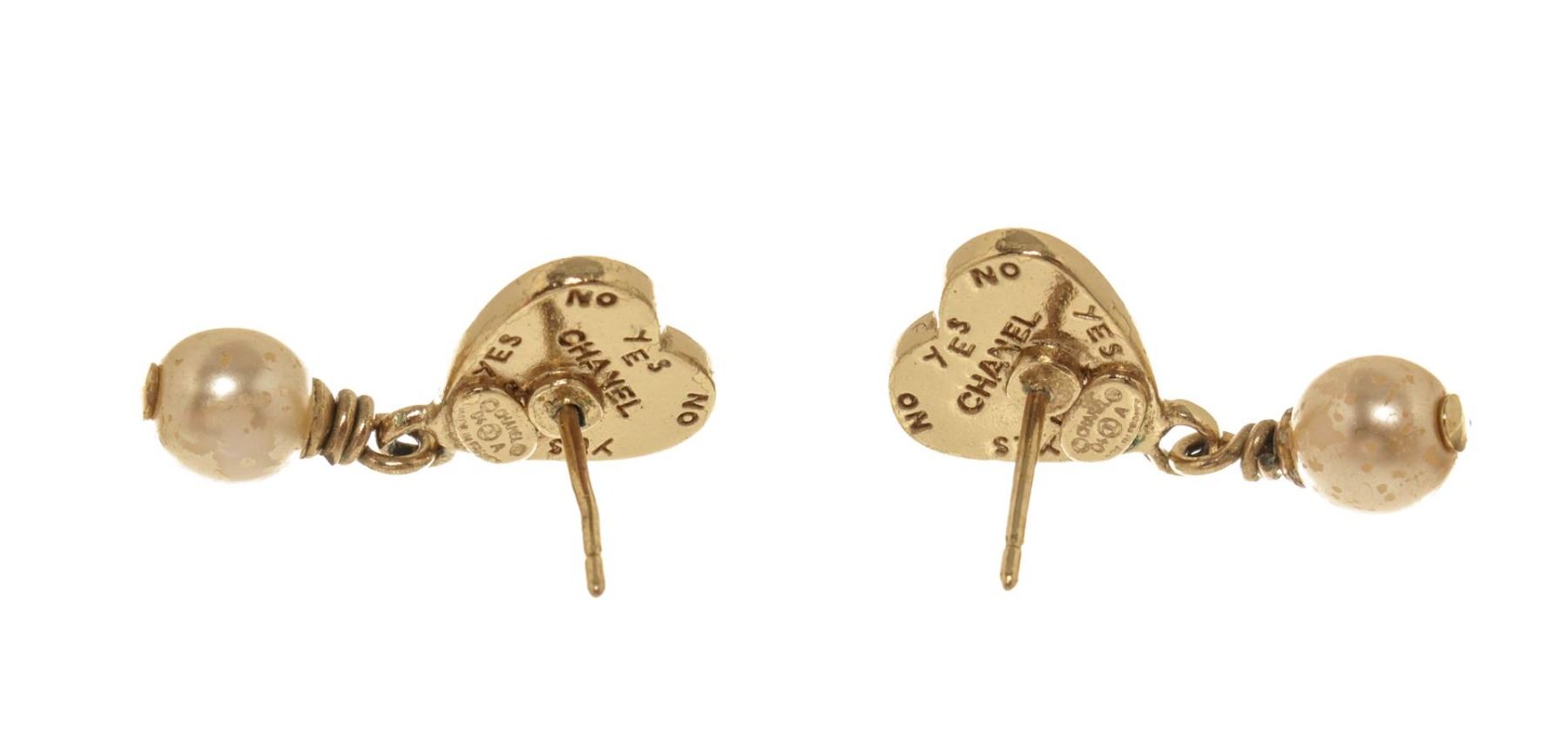 Chanel CC Dangle Pearl Earrings Gold Metal. Brand: Chanel, Style: CC Dangle Pearl, Type: Earrings, Exterior Color: Gold, Exterior Material: Metal, Closure: Stud.75", Height: 33. Condition: Missing the backings. Additional Information: From the 2004 Fall collection. Item is sold AS-IS and all information pertaining to this lot is available in the photos or this description.