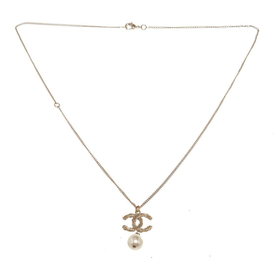 One Chanel CC Dangle Pearl Pendant Gold-tone Necklace. Item is sold AS-IS. All available information is listed in the description and shown in the photo. Gold-tone long chain Chanel CC necklace features dangle gold-tone CC logo and pearl pendant and lobster claw closure.