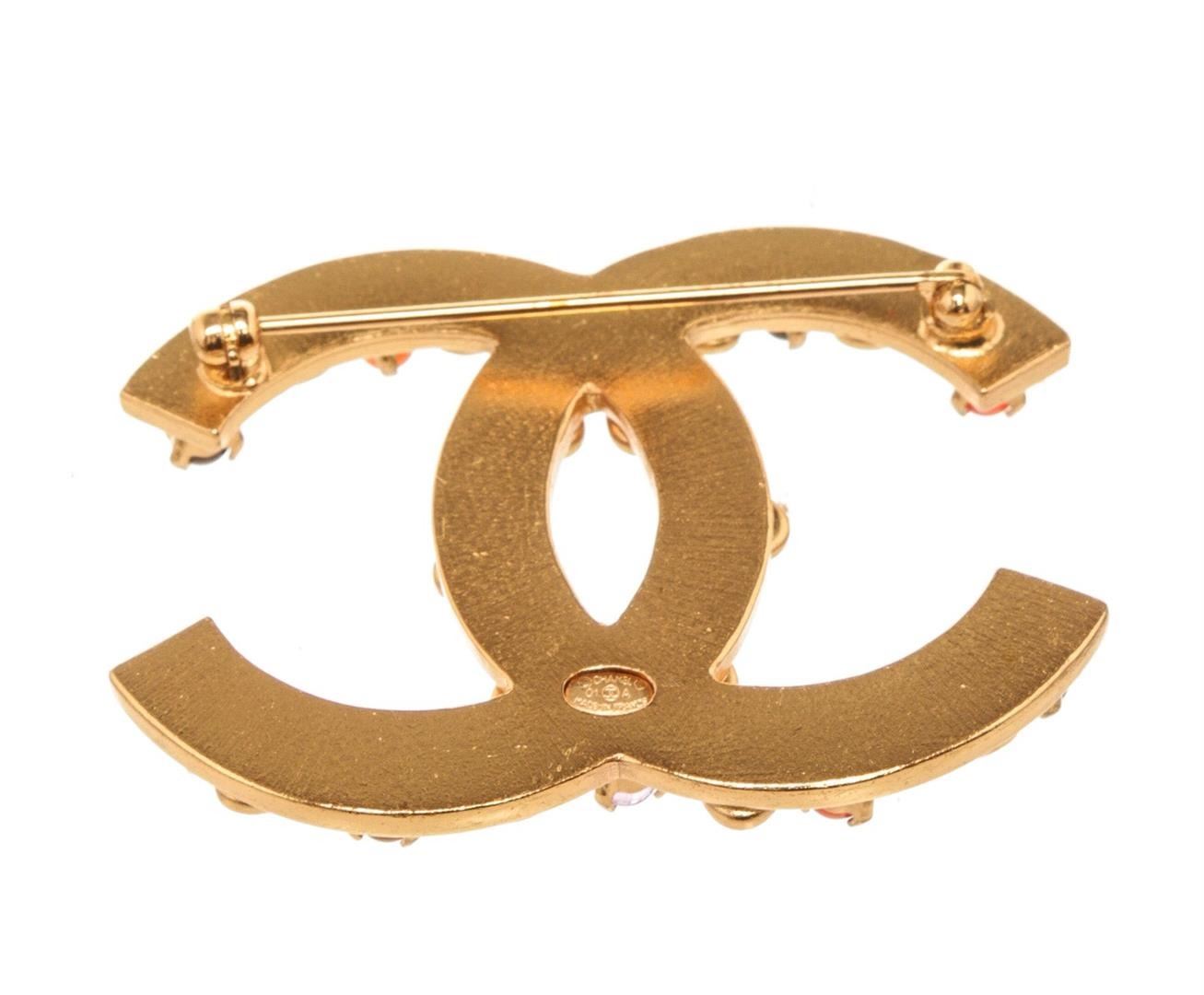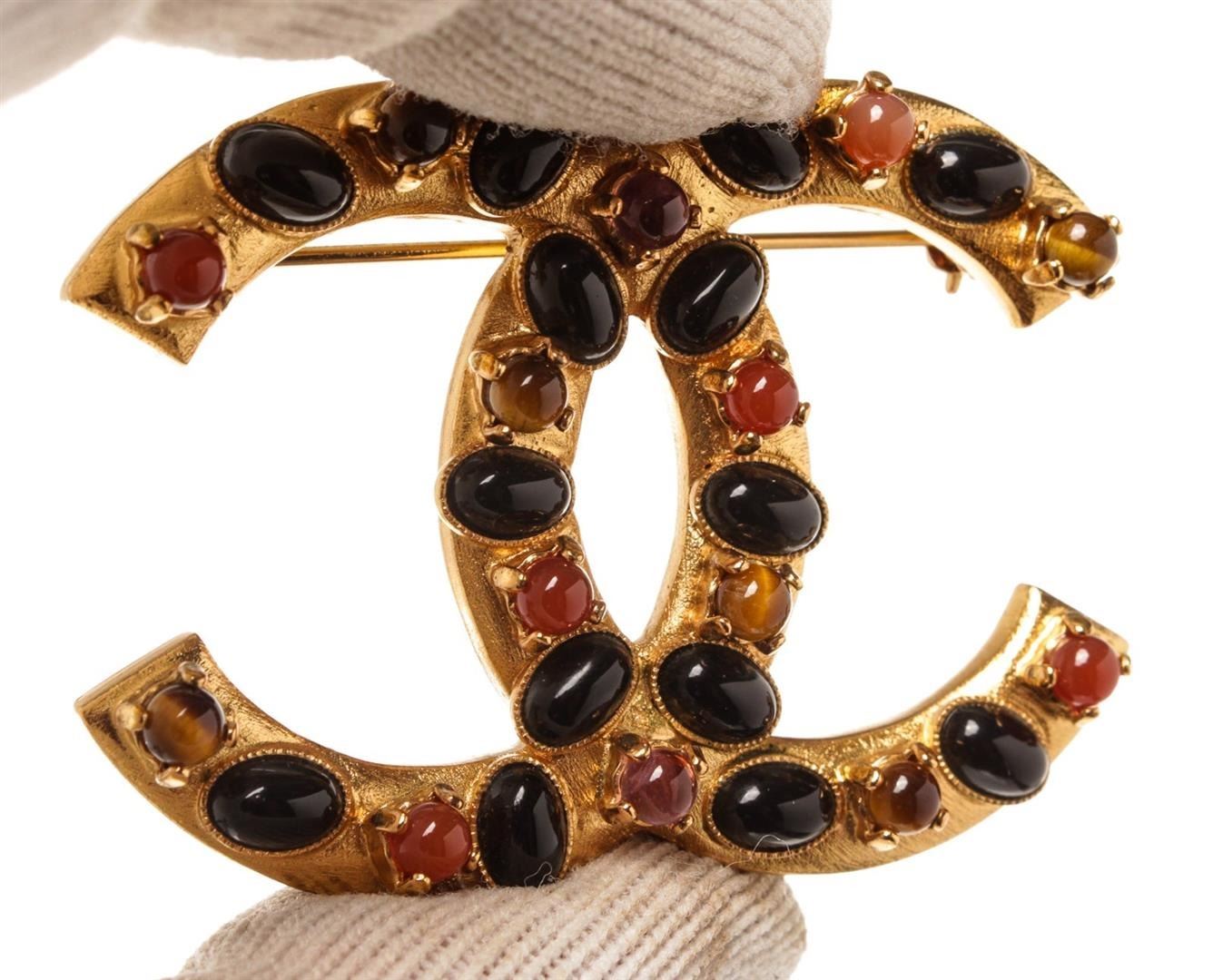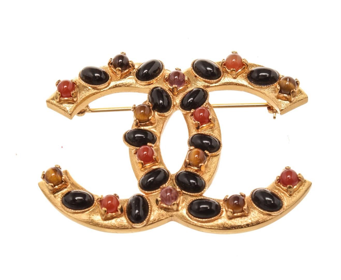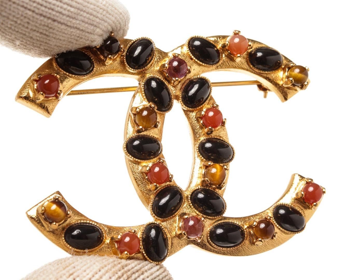 One Chanel CC Gem Brooch. Item is sold AS-IS. All available information is listed in the description and shown in the photo. Gold-tone chanel CC brooch with multi colors gripoix