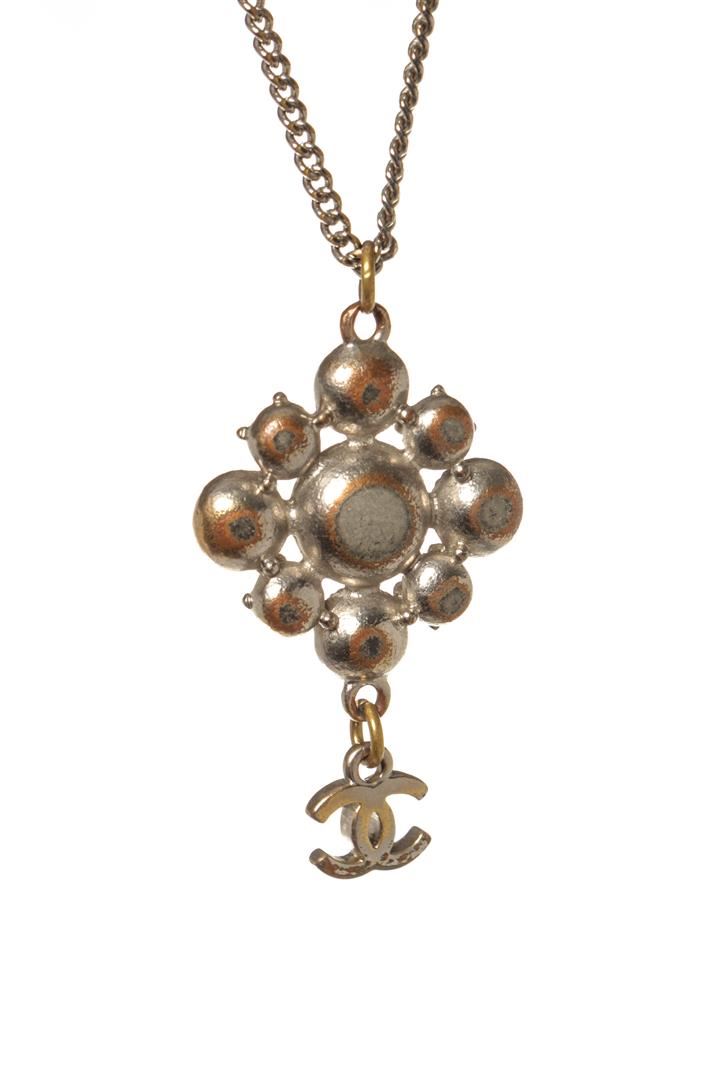 Chanel CC Logo Crystal Cluster Necklace. All available information is listed in the description and shown in the photos. Chanel CC Logo Crystal Cluster Necklace with silver metal tone hardware and link, crystals, and chanel logo pendant.
