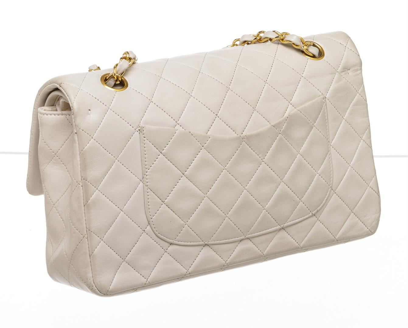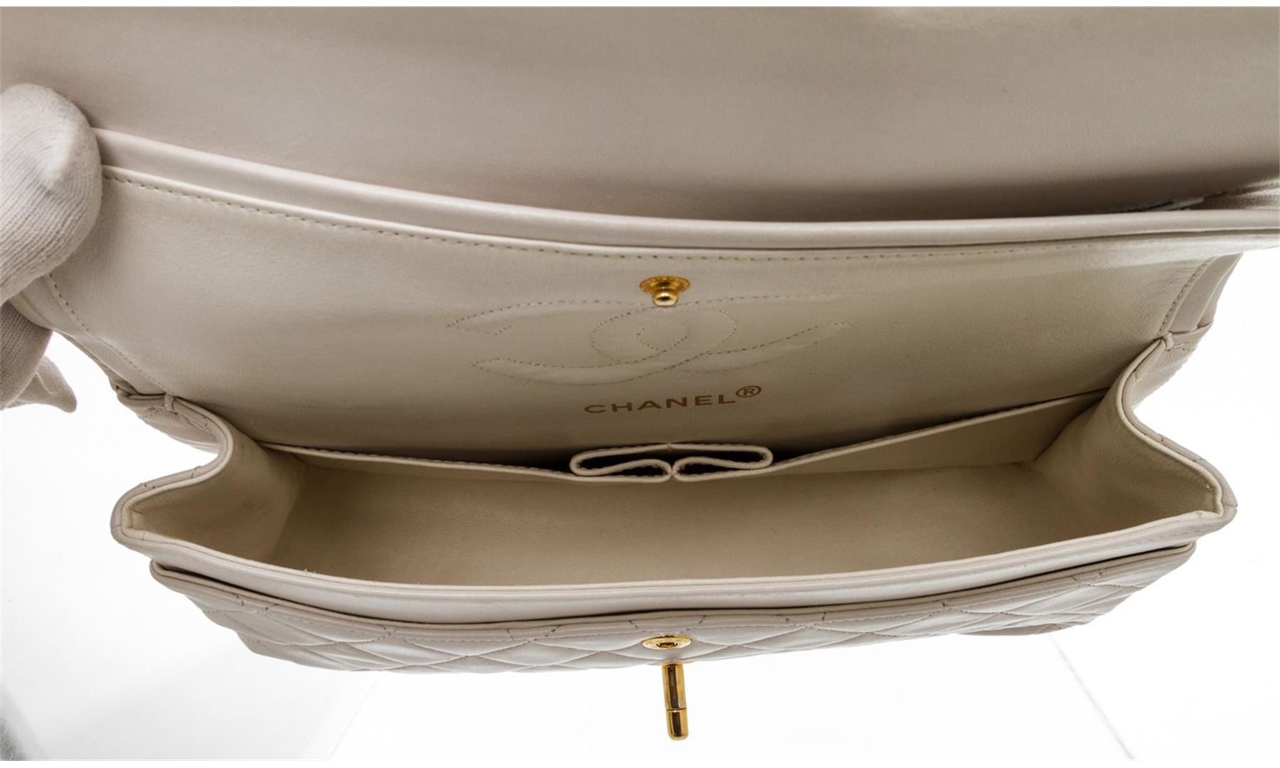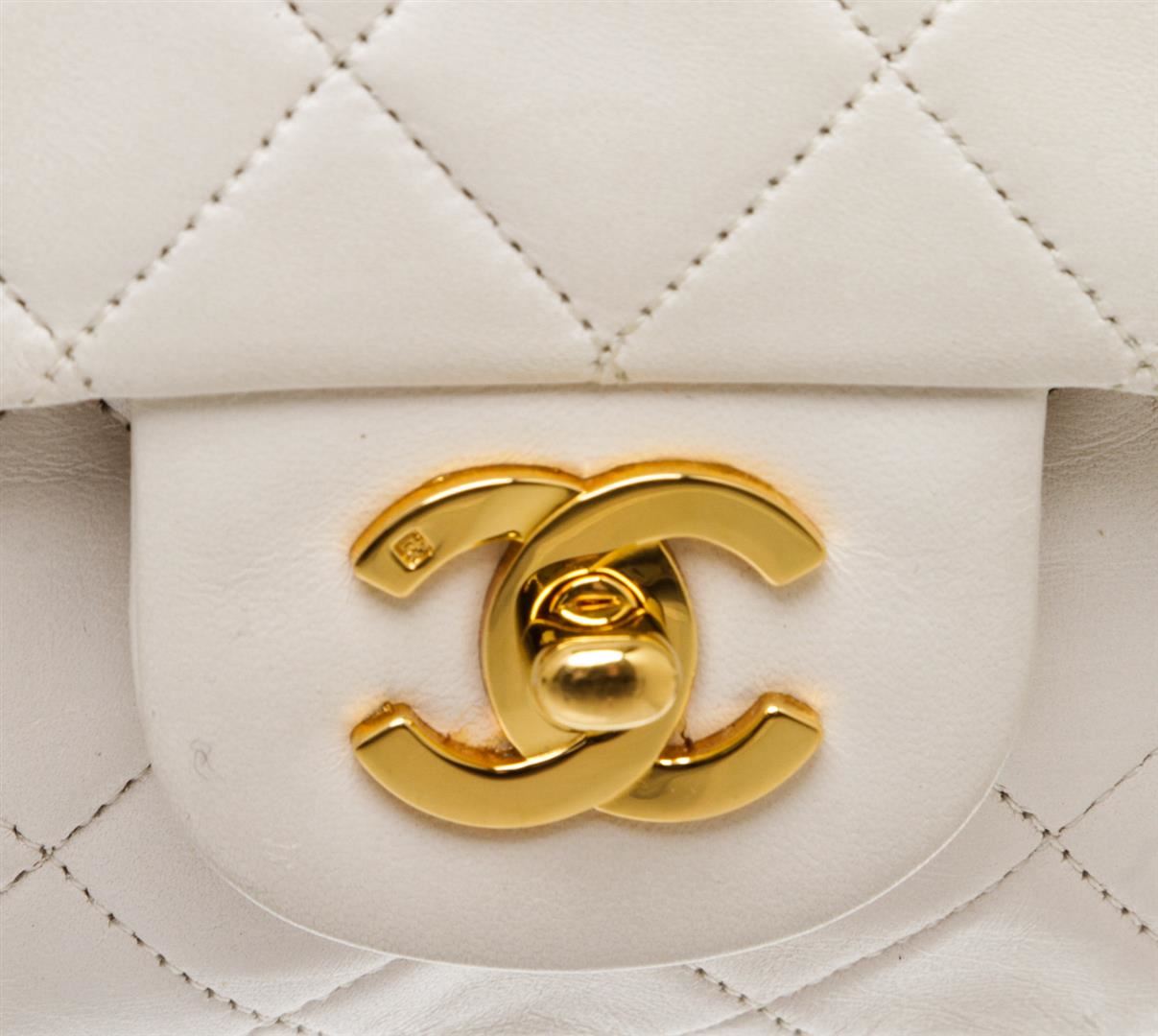 One Chanel Chanel White Lambskin Leather Classic Medium Double Flap Bag. White quilted lambskin vintage Chanel Medium Double Flap bag with gold-tone hardware, convertible chain-link and leather shoulder strap, single patch pocket at back, single zip pocket at flap underside, three compartments; two with snap closure at flap, tonal leather lining, dual slit pockets at interior wall and CC turn-lock closure at front flap.