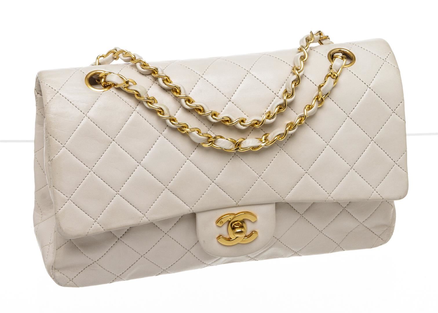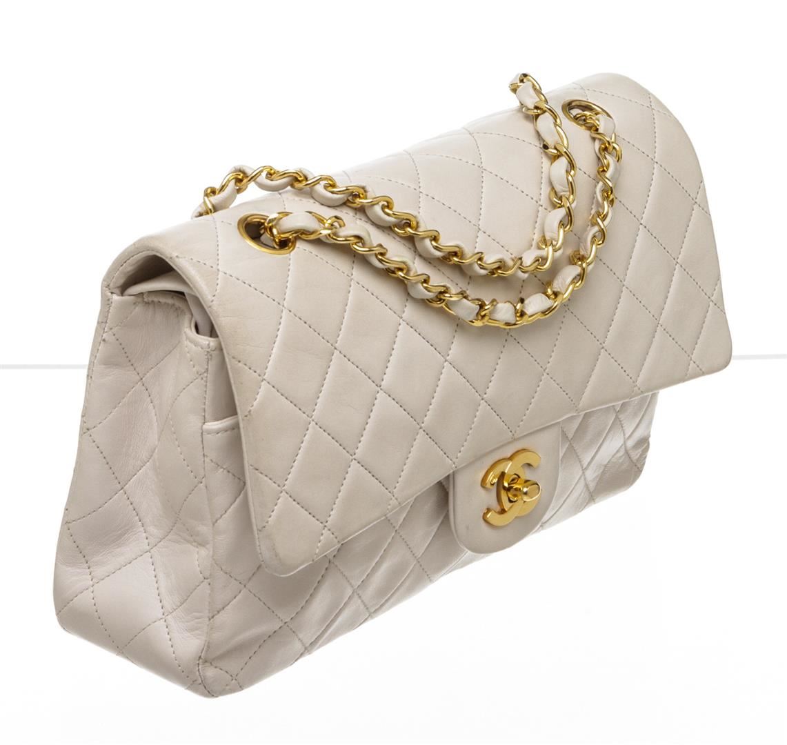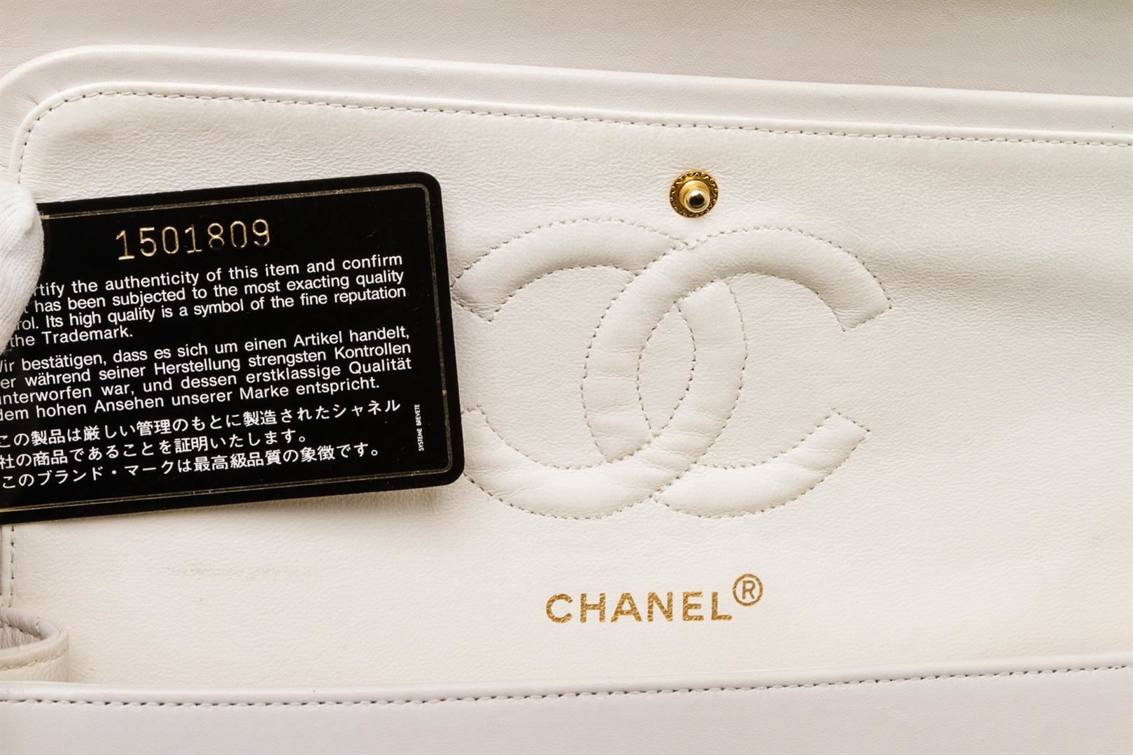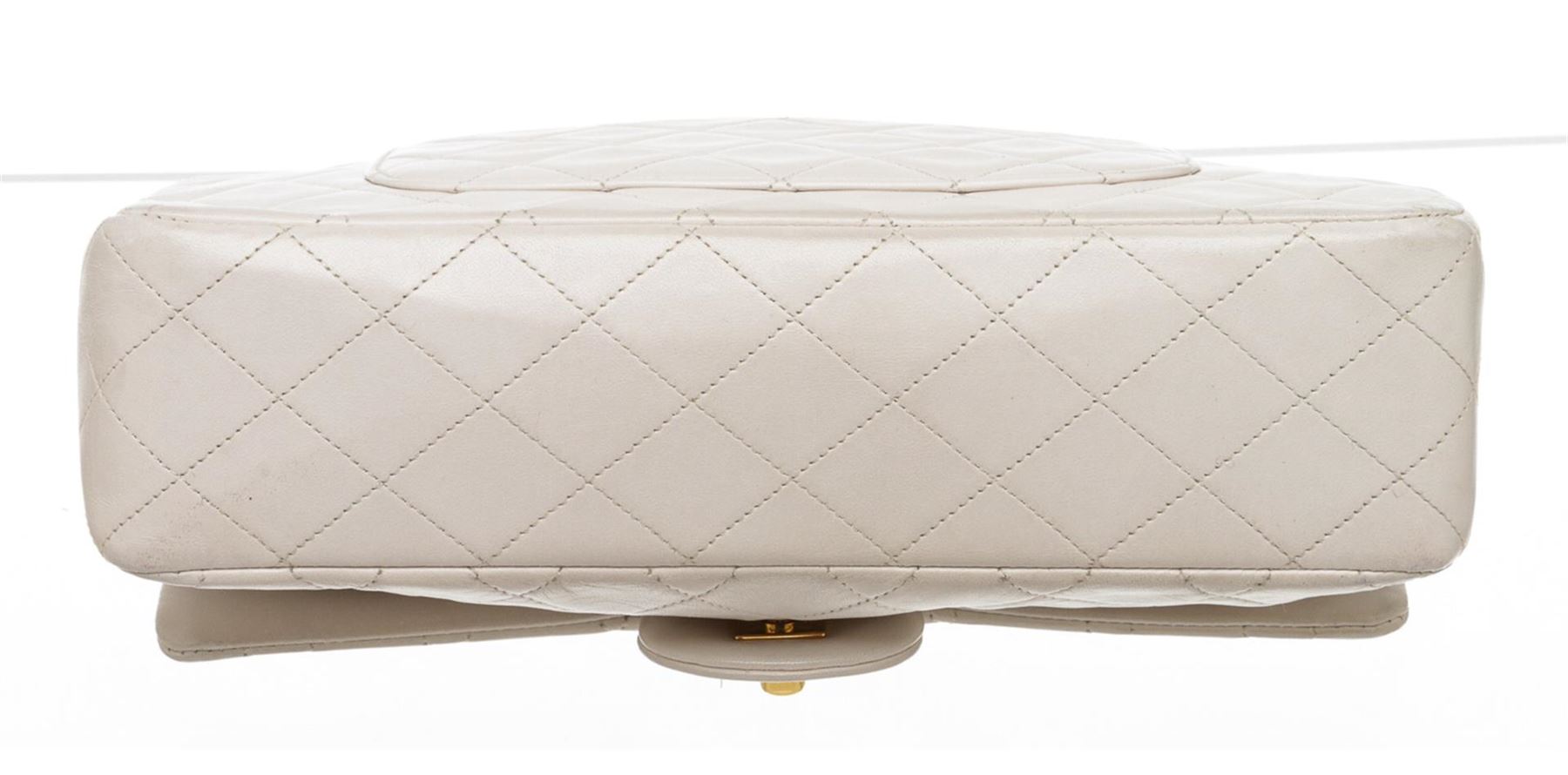 One Chanel Chanel White Lambskin Leather Classic Medium Double Flap Bag. White quilted lambskin vintage Chanel Medium Double Flap bag with gold-tone hardware, convertible chain-link and leather shoulder strap, single patch pocket at back, single zip pocket at flap underside, three compartments; two with snap closure at flap, tonal leather lining, dual slit pockets at interior wall and CC turn-lock closure at front flap.
