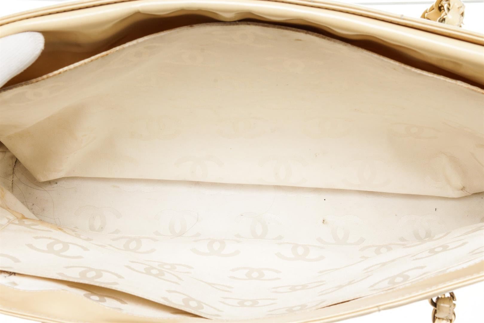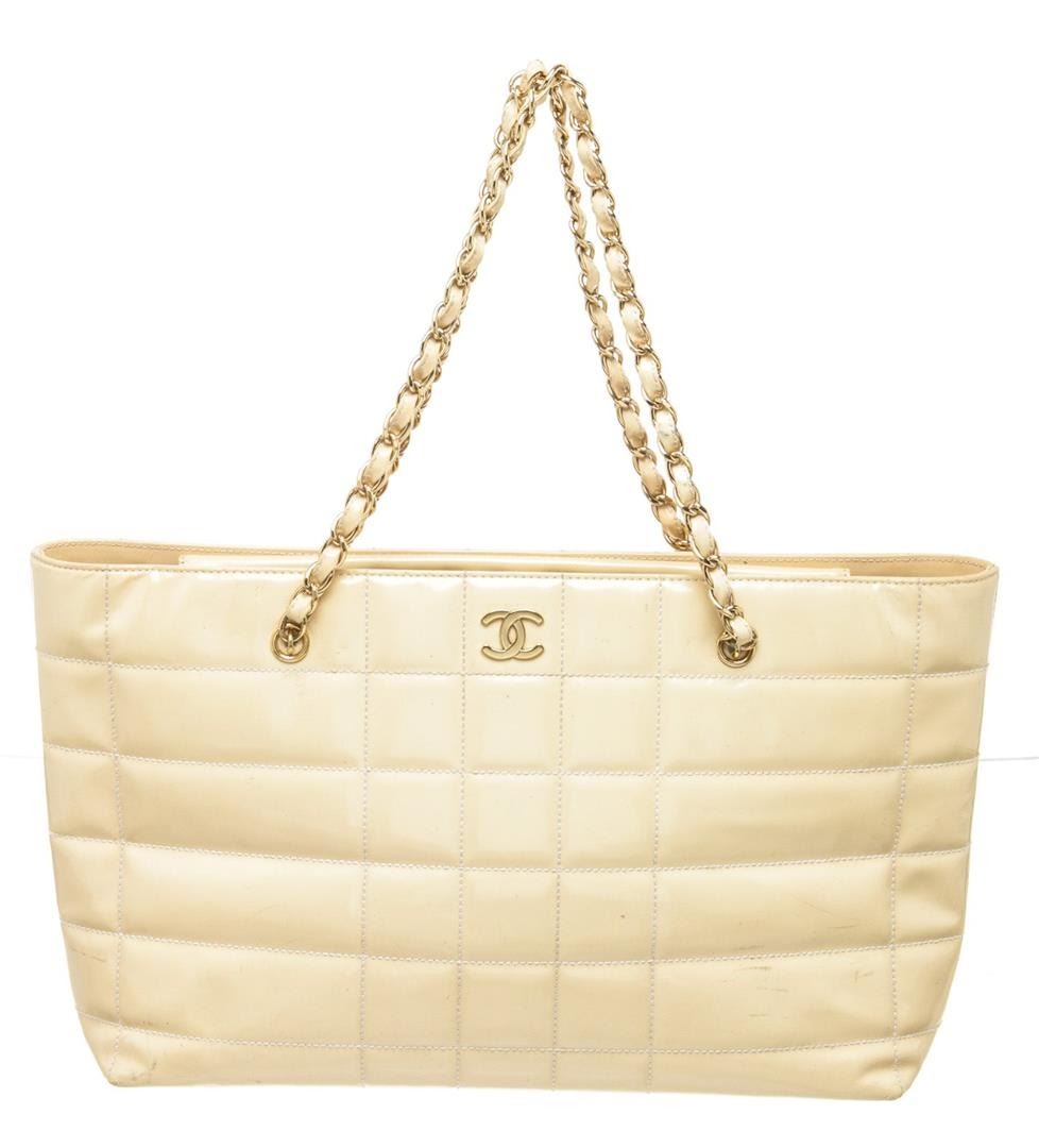Chanel Chocolate Bar Tote Ivory Patent Leather. Brand: Chanel, Style: Chocolate Bar, Type: Tote, Exterior Color: Ivory, Exterior Material: Patent Leather, Exterior Pockets: None, Interior Color: White, Interior Material: Canvas, Interior Pockets: Two Slip, Closure: Magnet, Handle/Strap Type: Chain Strap, Length: 15", Width: 4 1/2", Height: 9 7/8", Handle Drop: 9". Condition: Patent leather is worn. Additional Information: CC on lining. Item is sold AS-IS and all information pertaining to this lot is available in the photos or this description.