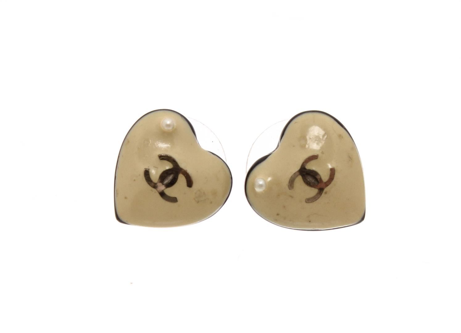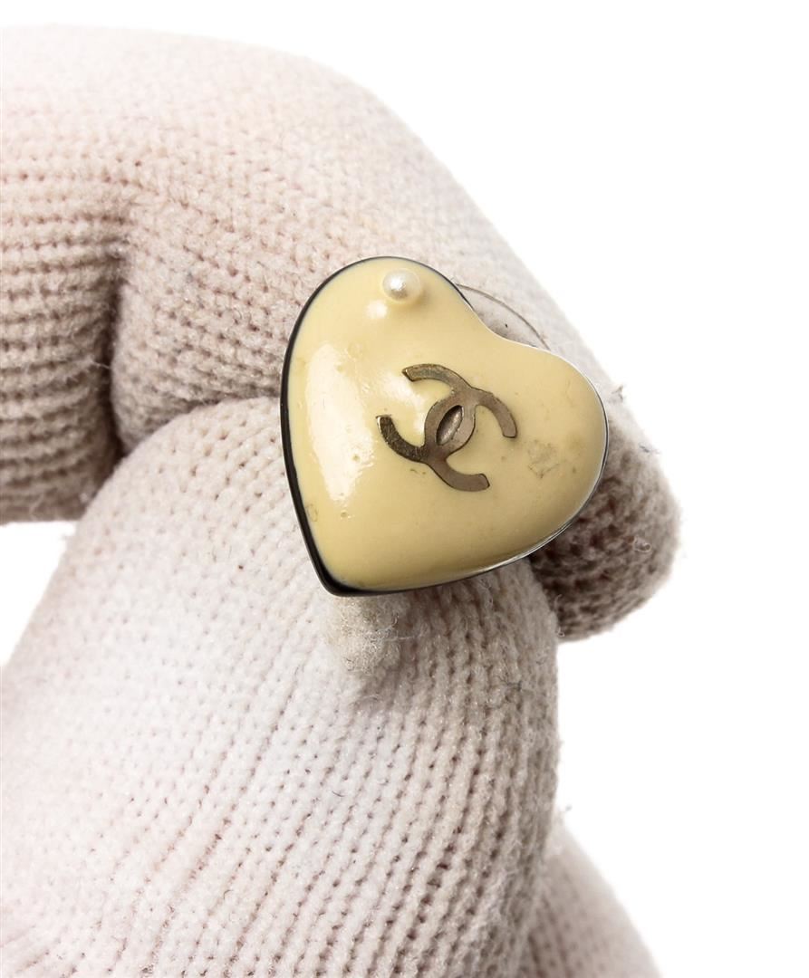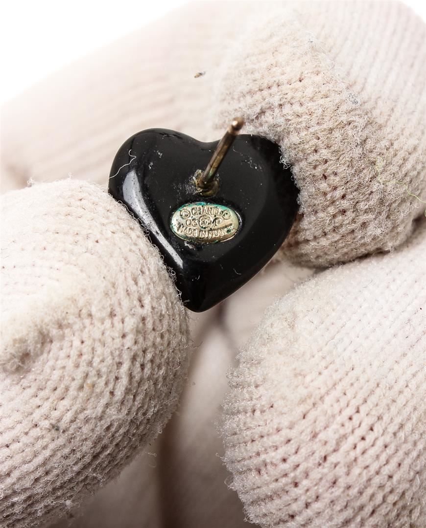 Silver-tone metal Chanel CC logo heart earrings featuring enamel inlays and clutch back closures.