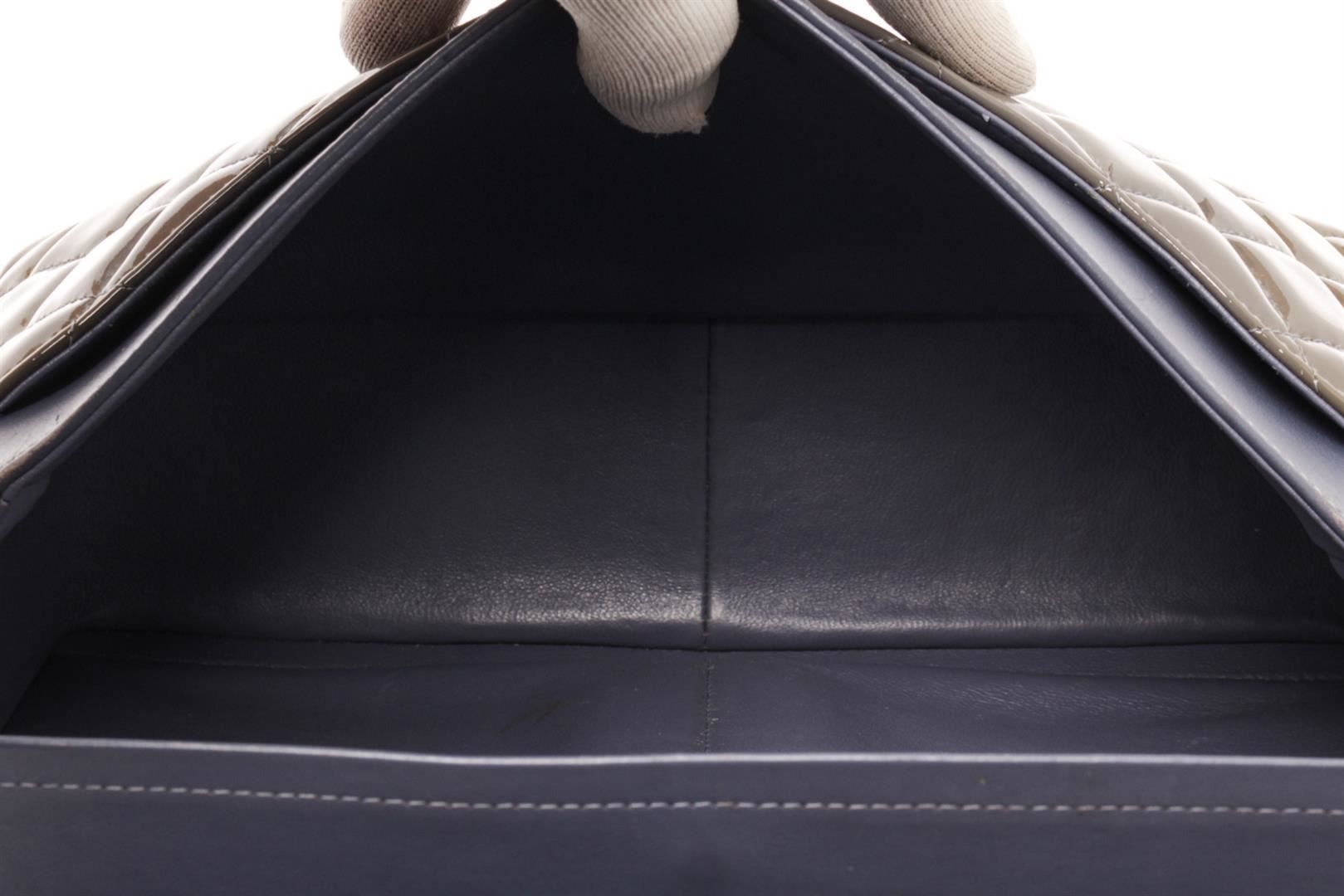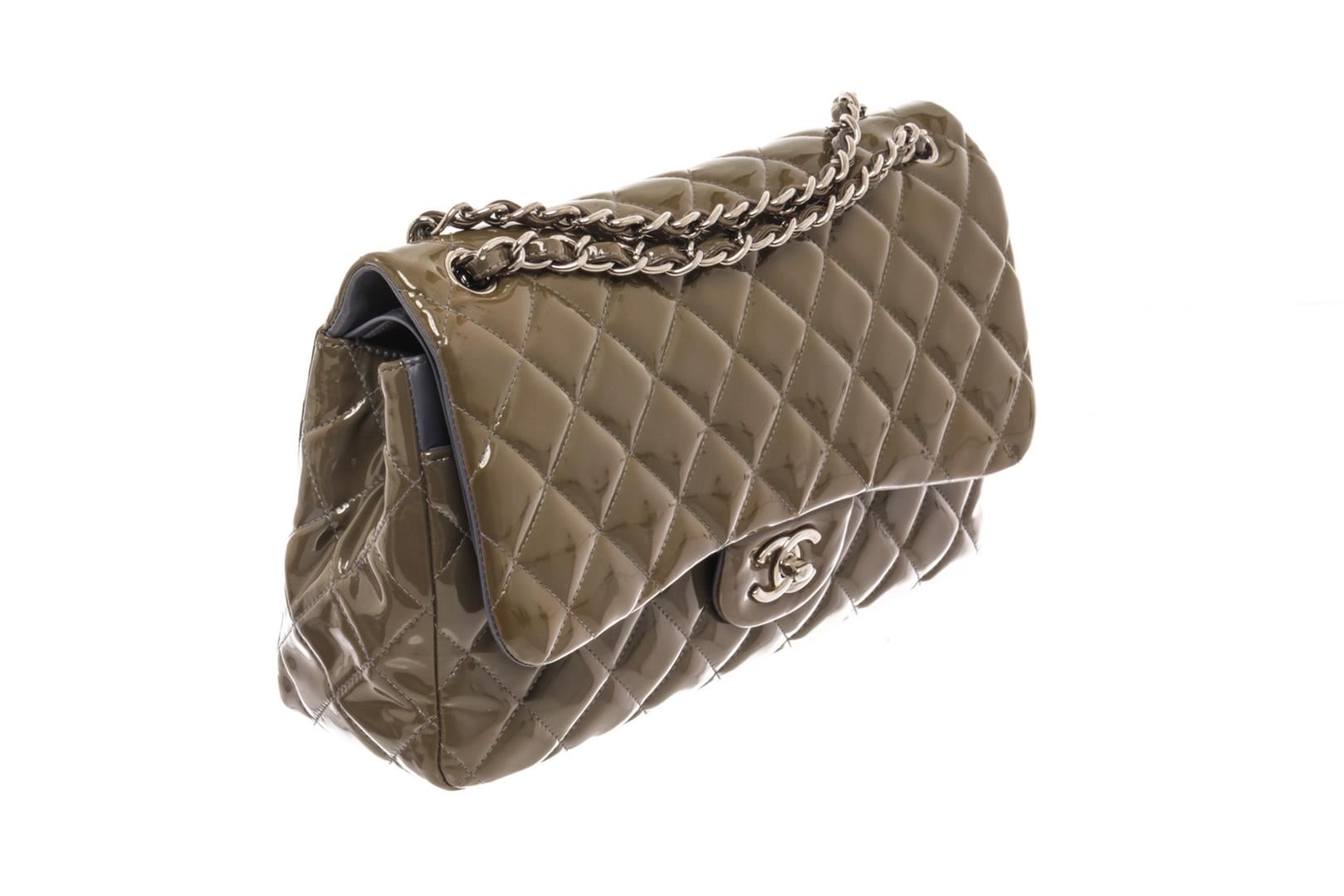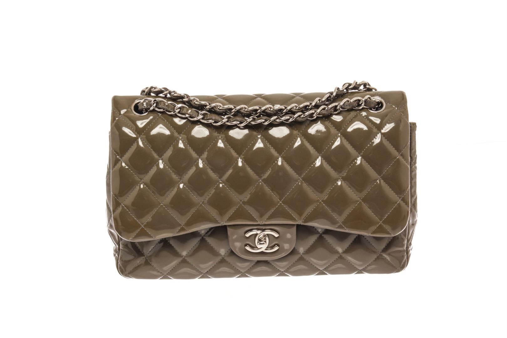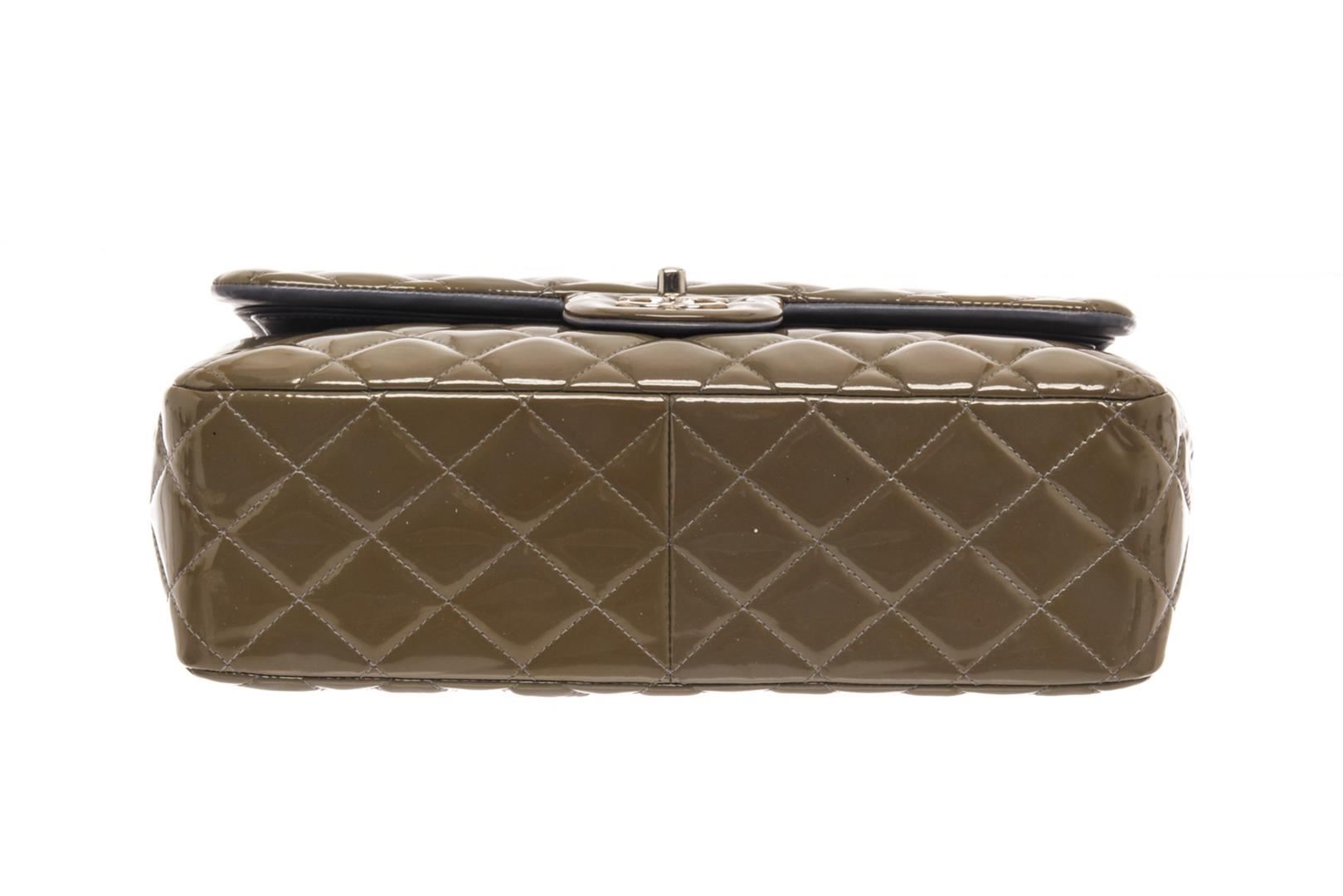 Chanel Dark Green Quilted Caviar Leather Jumbo Double Flap Shoulder Bag. All available information is listed in the description and shown in the photos. Chanel Dark Green Quilted Caviar Leather Jumbo Double Flap Shoulder Bag with polished light gold chain-link leather-threaded shoulder strap and a front flap with a light gold Chanel CC turn-lock closure, This opens to reveal an inner flap and a matching leather interior with patch pockets. length: 12 in, Height: 7.5 in, Width: 3.5 in / 30.48 x 19.05 x 8.89 cm