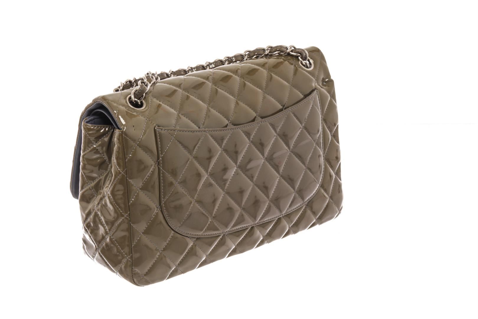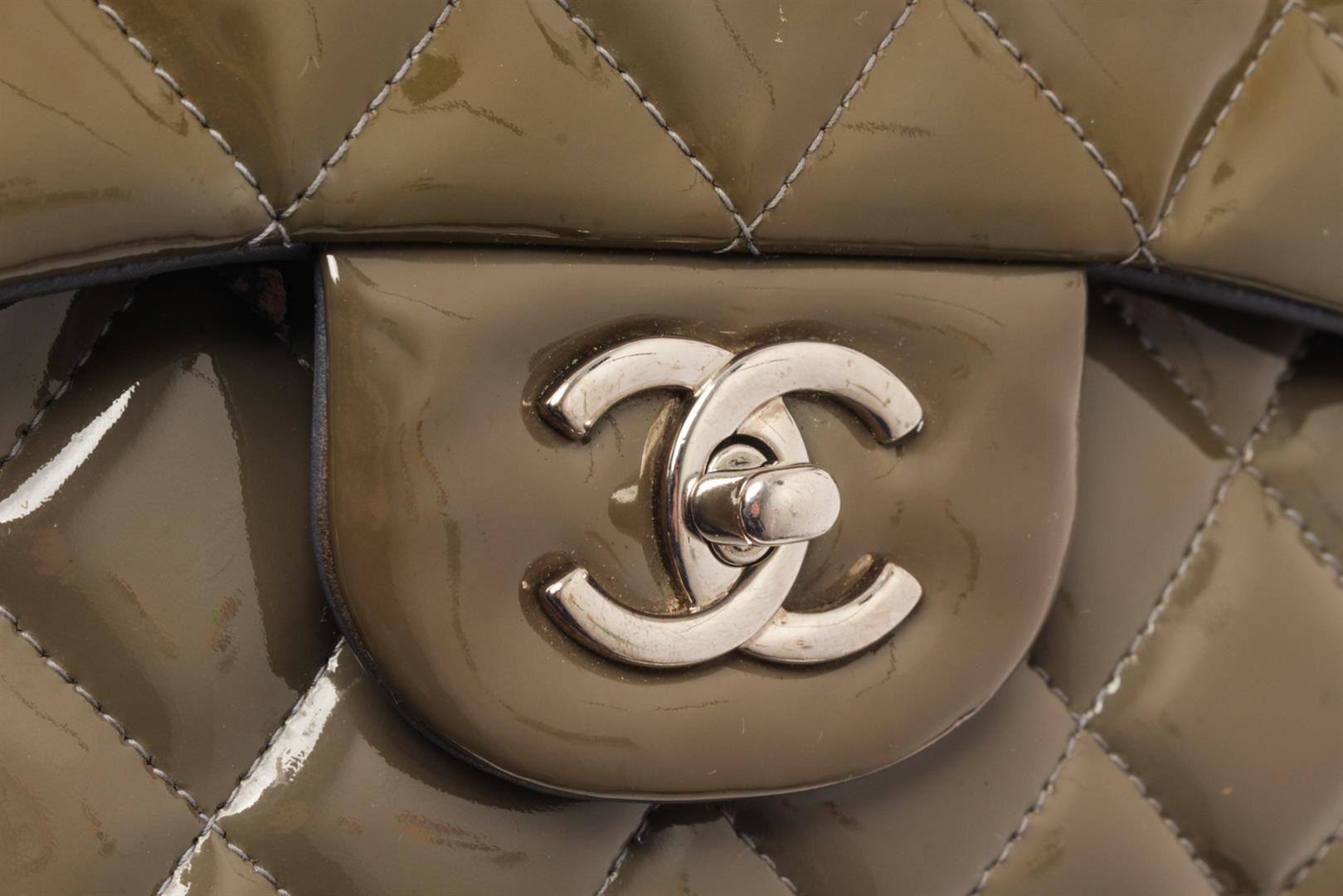 Chanel Dark Green Quilted Caviar Leather Jumbo Double Flap Shoulder Bag. All available information is listed in the description and shown in the photos. Chanel Dark Green Quilted Caviar Leather Jumbo Double Flap Shoulder Bag with polished light gold chain-link leather-threaded shoulder strap and a front flap with a light gold Chanel CC turn-lock closure, This opens to reveal an inner flap and a matching leather interior with patch pockets. length: 12 in, Height: 7.5 in, Width: 3.5 in / 30.48 x 19.05 x 8.89 cm