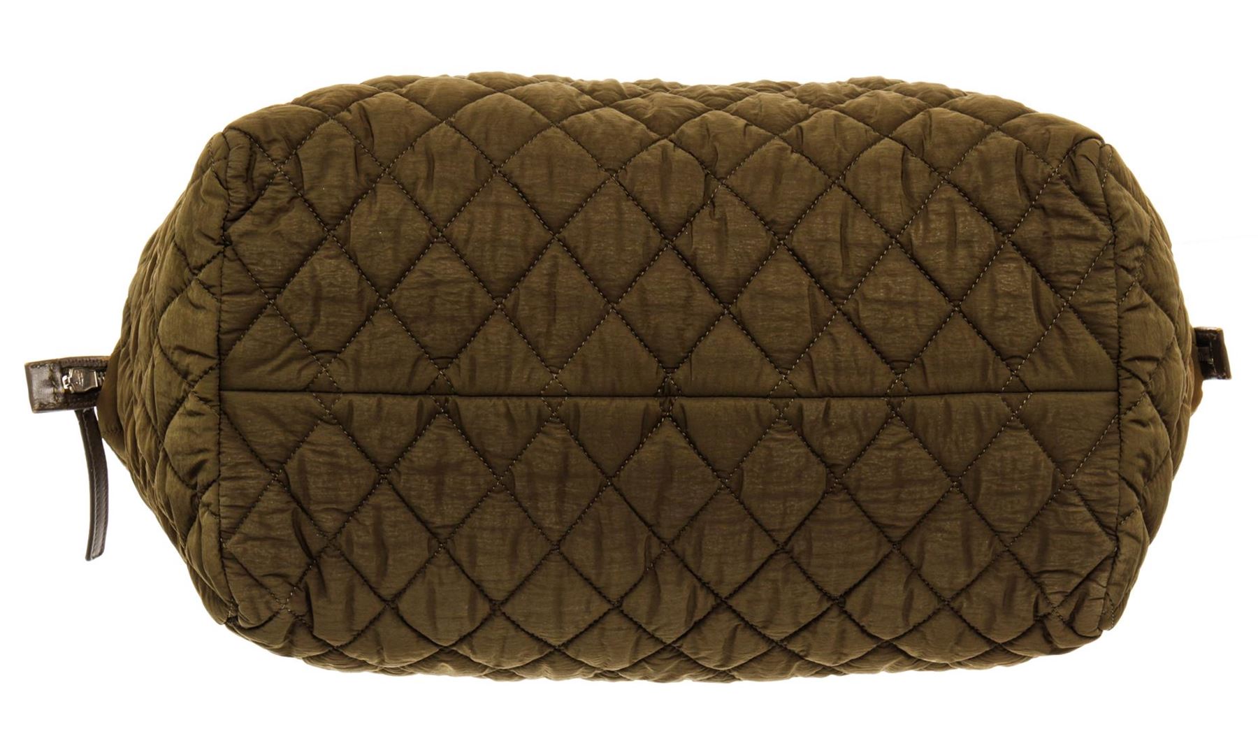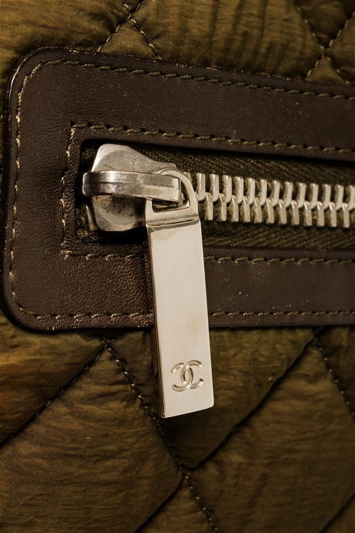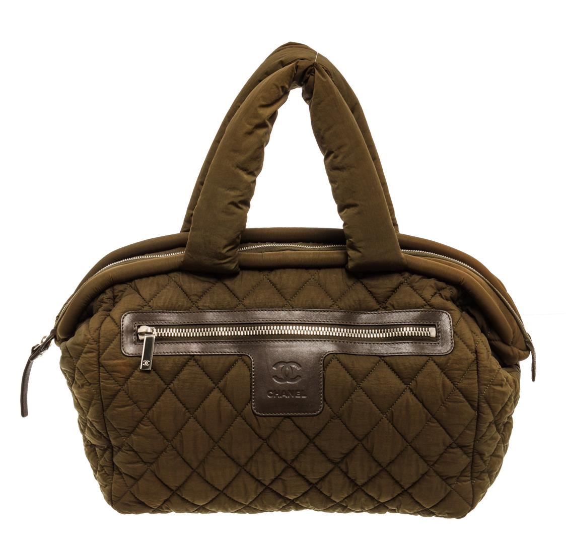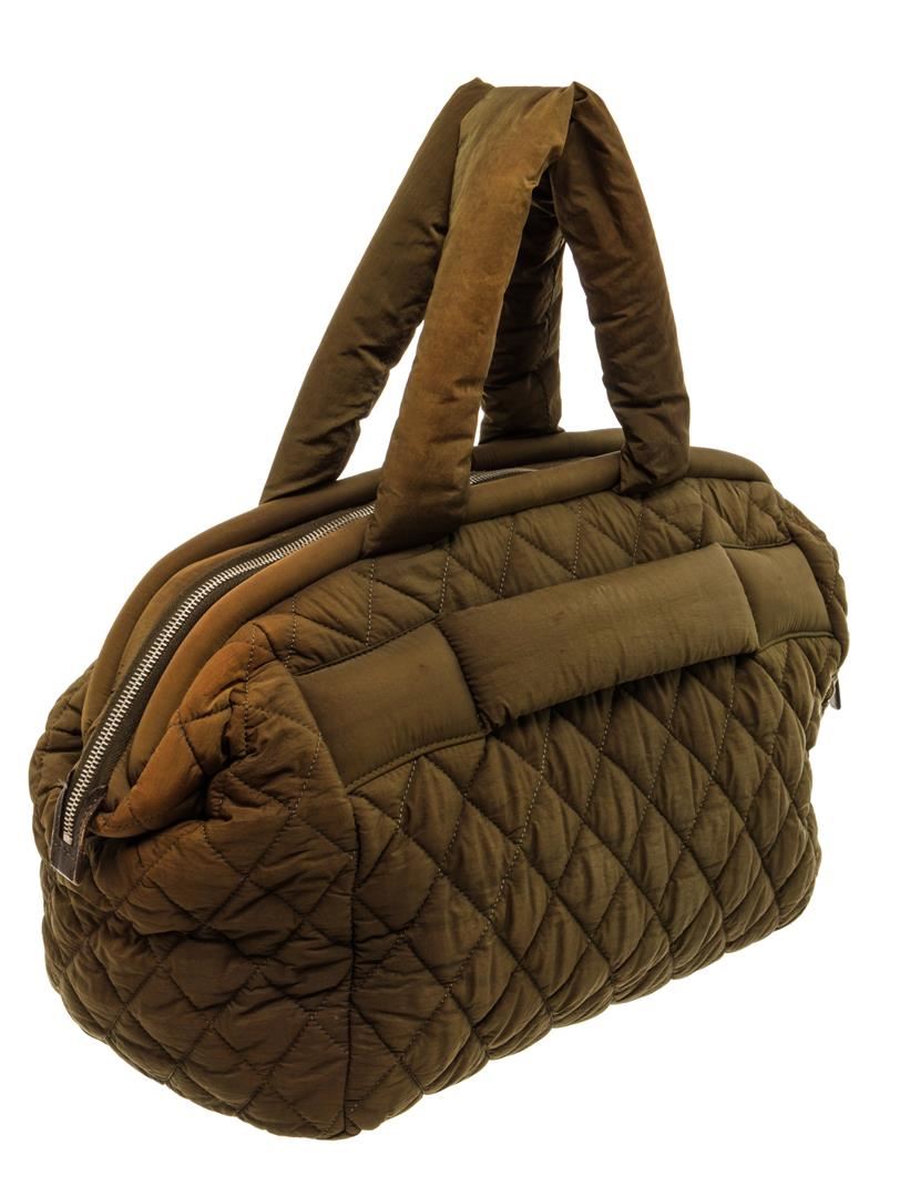 One Chanel Dark Green Quilted Nylon Cocoon Bowling Bag. Item is sold AS-IS. All available information is listed in the description and shown in the photo. Chanel Dark Green Quilted Nylon Cocoon Bowling Bag with silver-tone hardware, leather trim, front zip pocket, CC interlocking logo at the front leather, red nylon lining, interior zip pocket, dual nylon rolled handles, and zip closure at the top. .