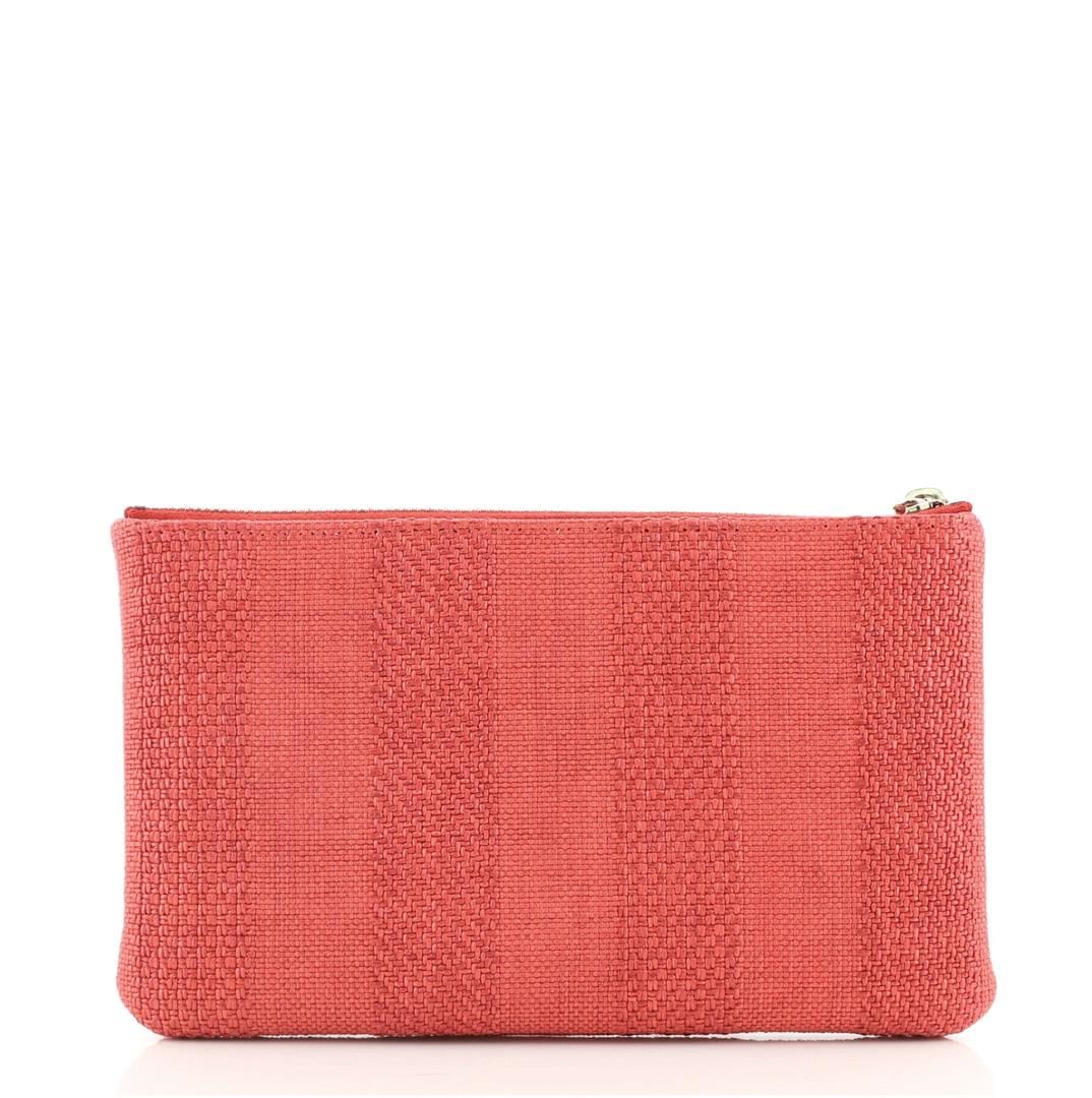 One Chanel Deauville Pouch Striped Mixed Fibers Small Red. Item is sold AS-IS. All available information is listed in the description and shown in the photo. Chanel Deauville Pouch Striped Mixed Fibers Small Red Fiber Condition Details: Slight odor in interior. Discoloration and wear on exterior corners, scratches on hardware. Height ", Width ", Depth ", Strap Drop -