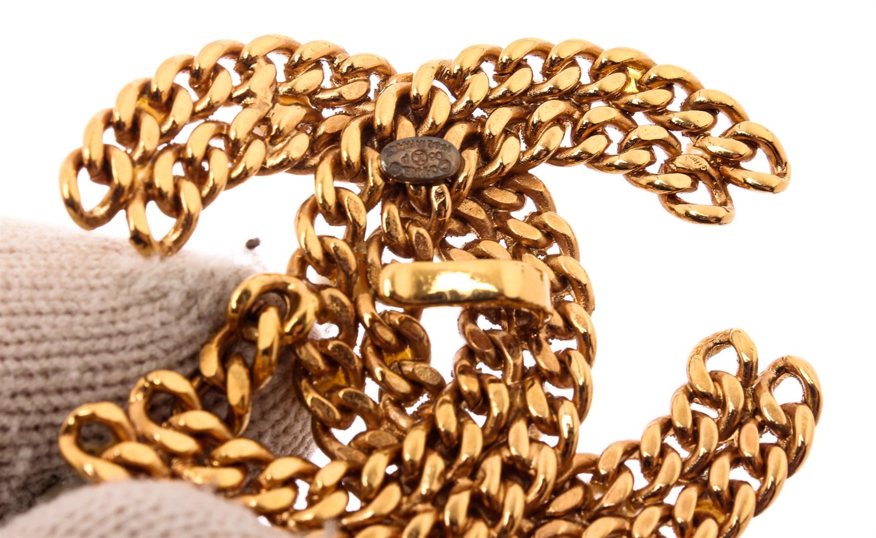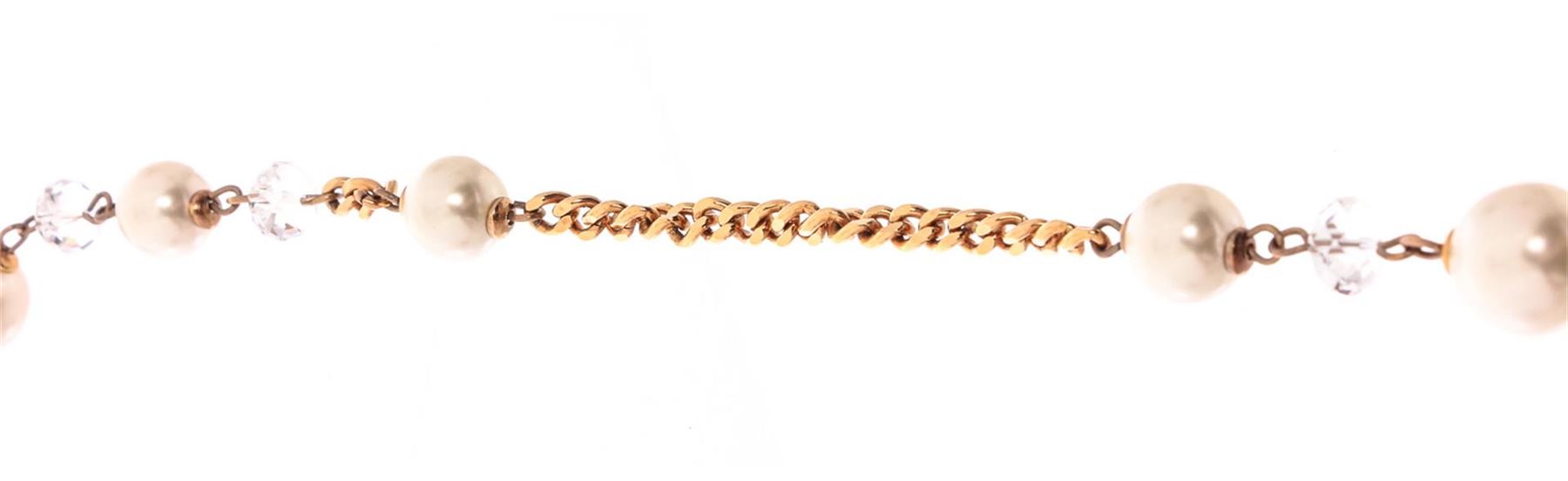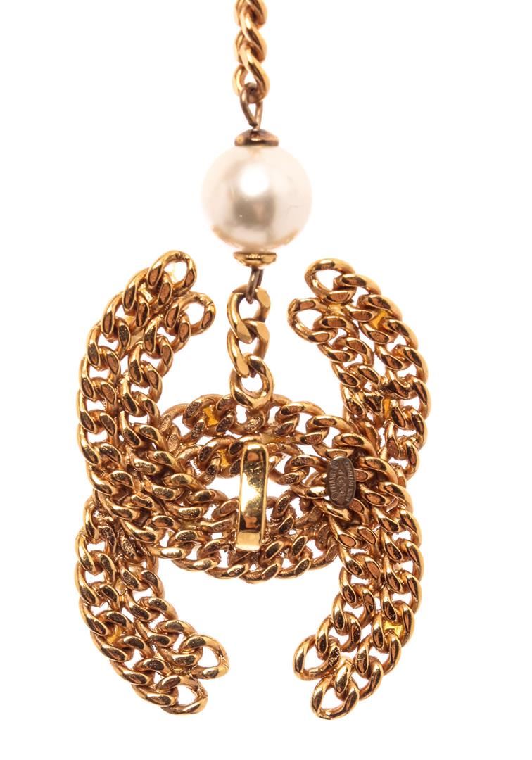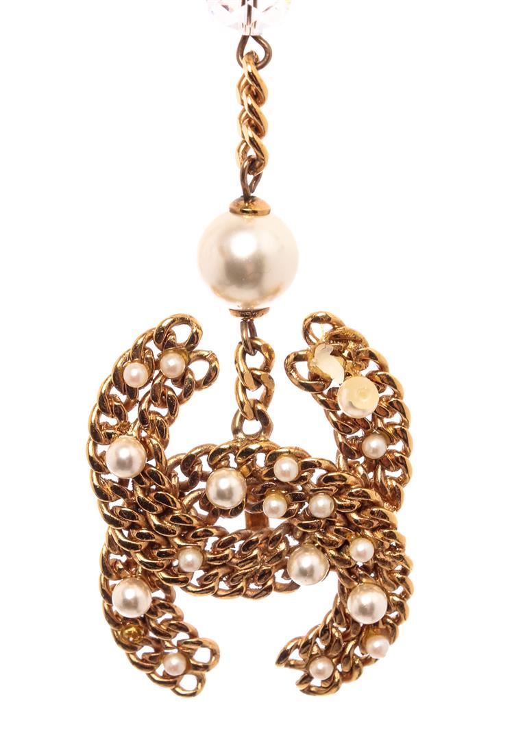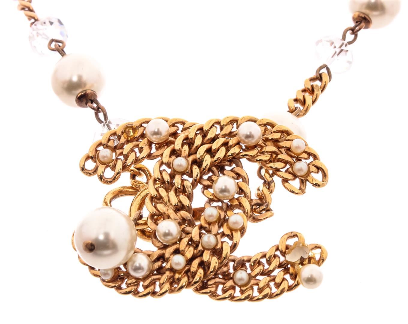 Textured gold-tone CC chain Chanel pendant necklace featuring faux pearl and crystal embellishments. Hook closure at pendant.