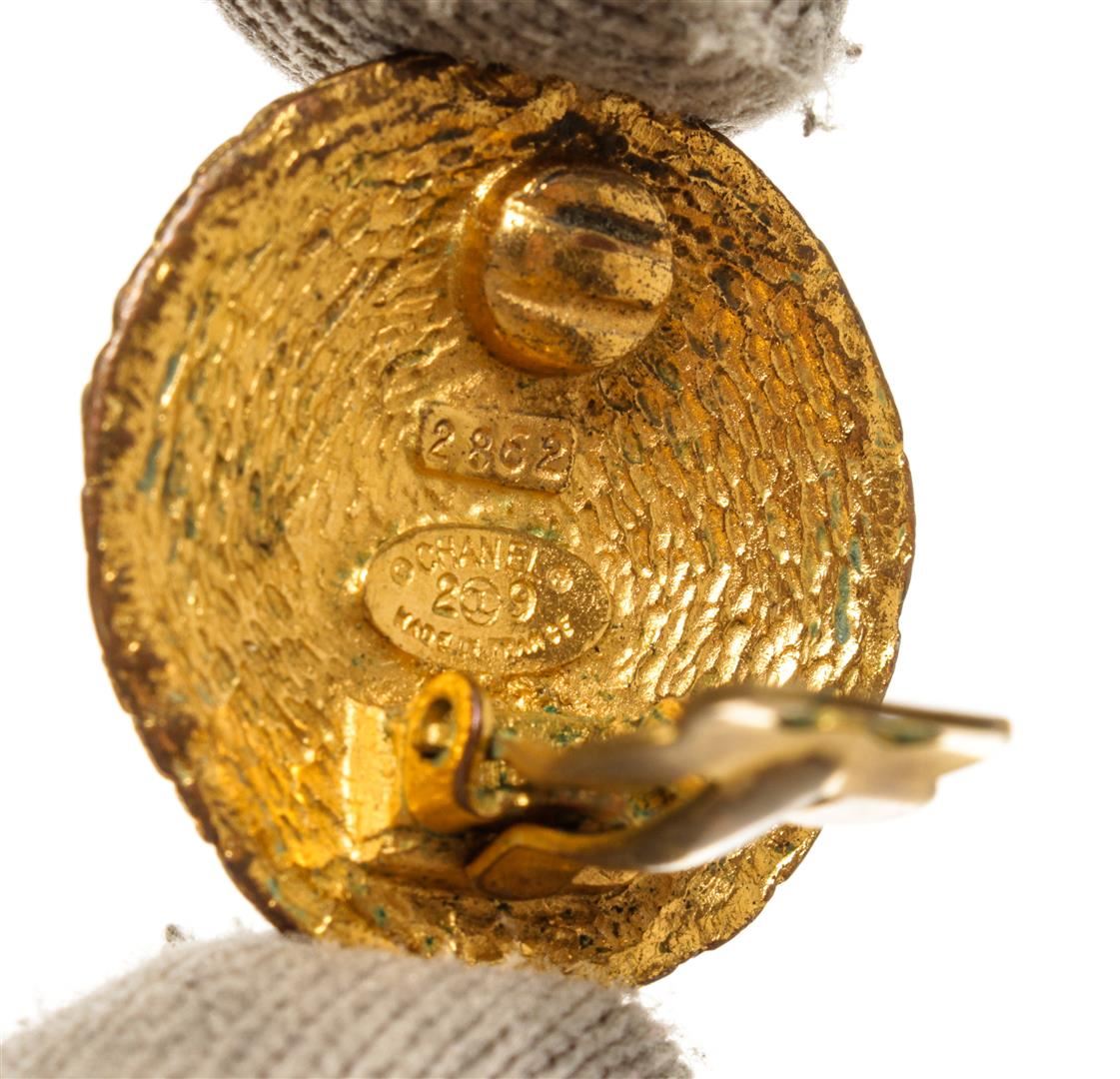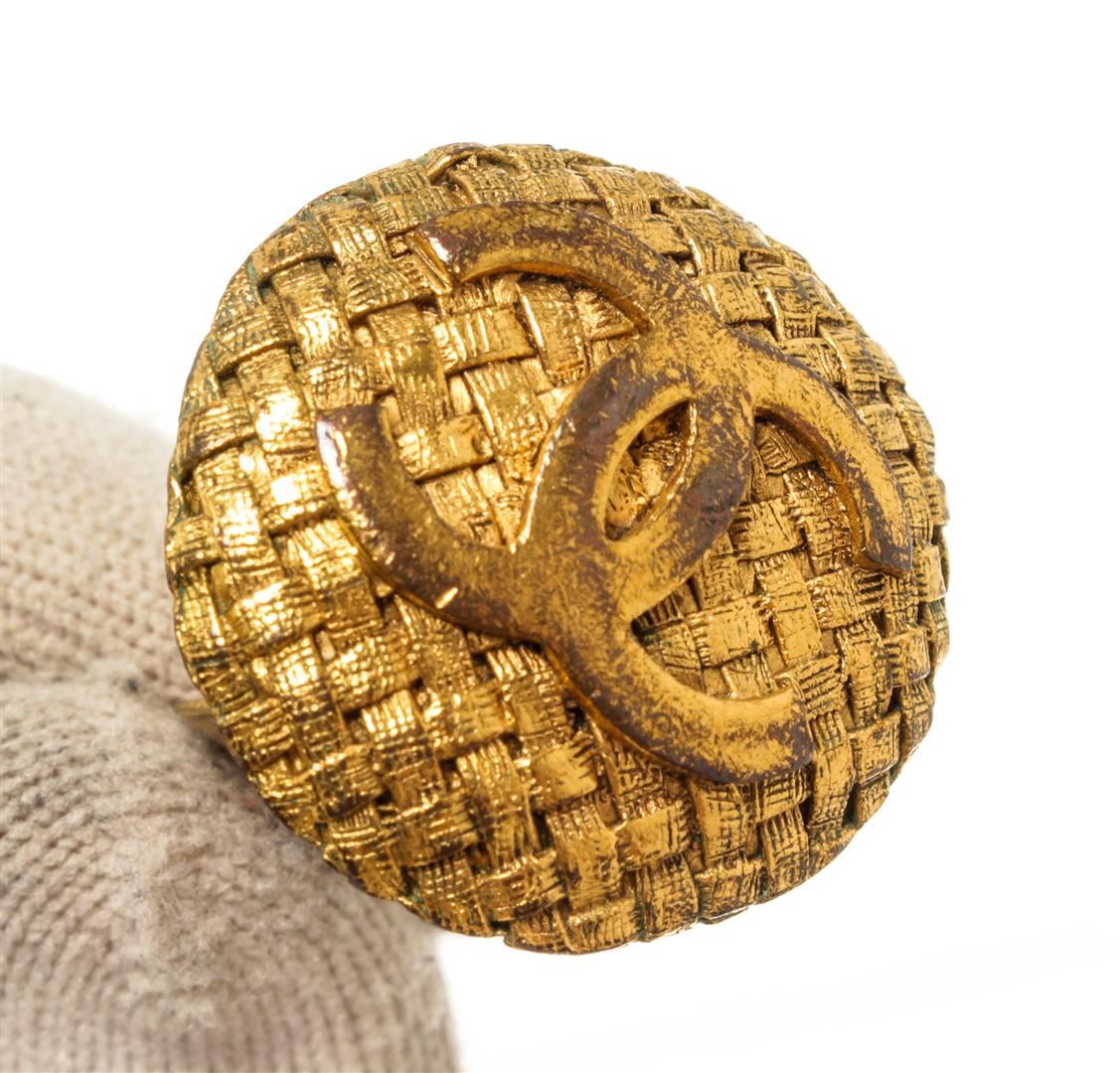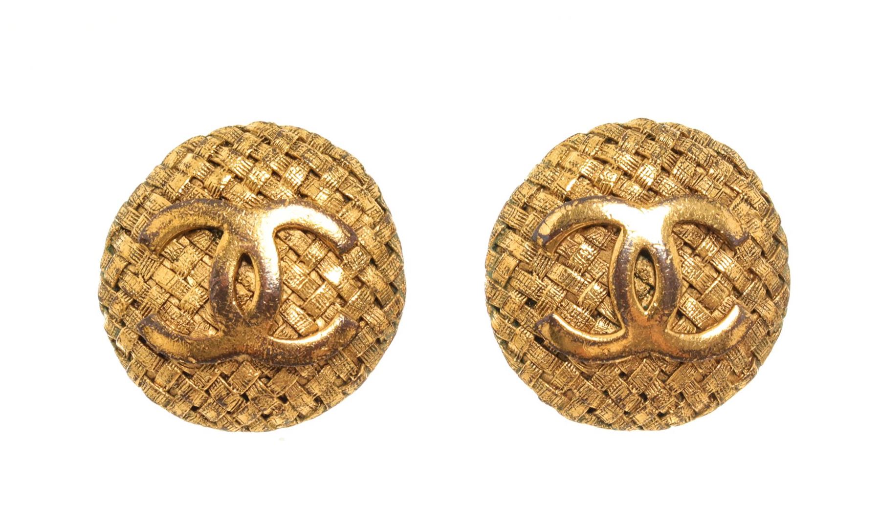 Chanel Gold CC Earrings. All available information is listed in the description and shown in the photos. Chanel gold CC earrings feature a gold-finish body with a weaved pattern and the CC logo in the center, Chanel stamp on the back, and a clip on closure.