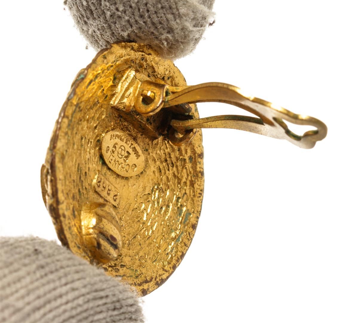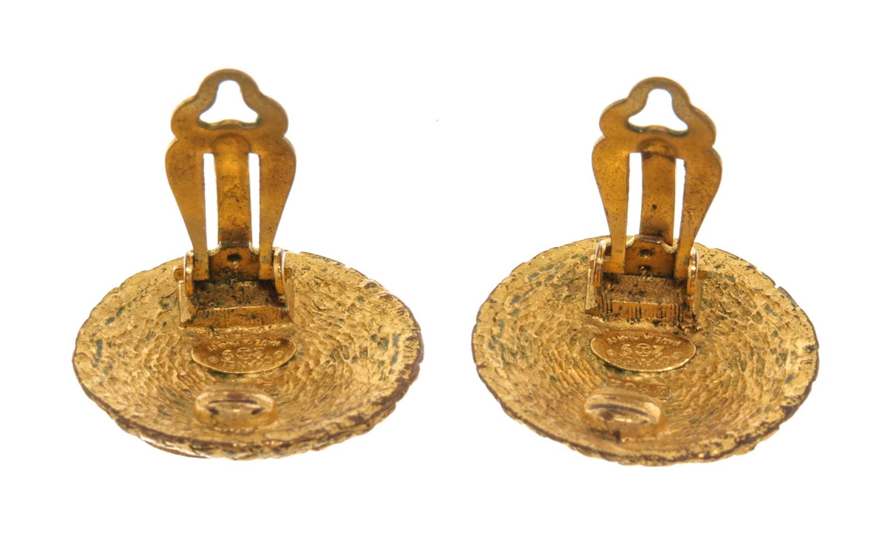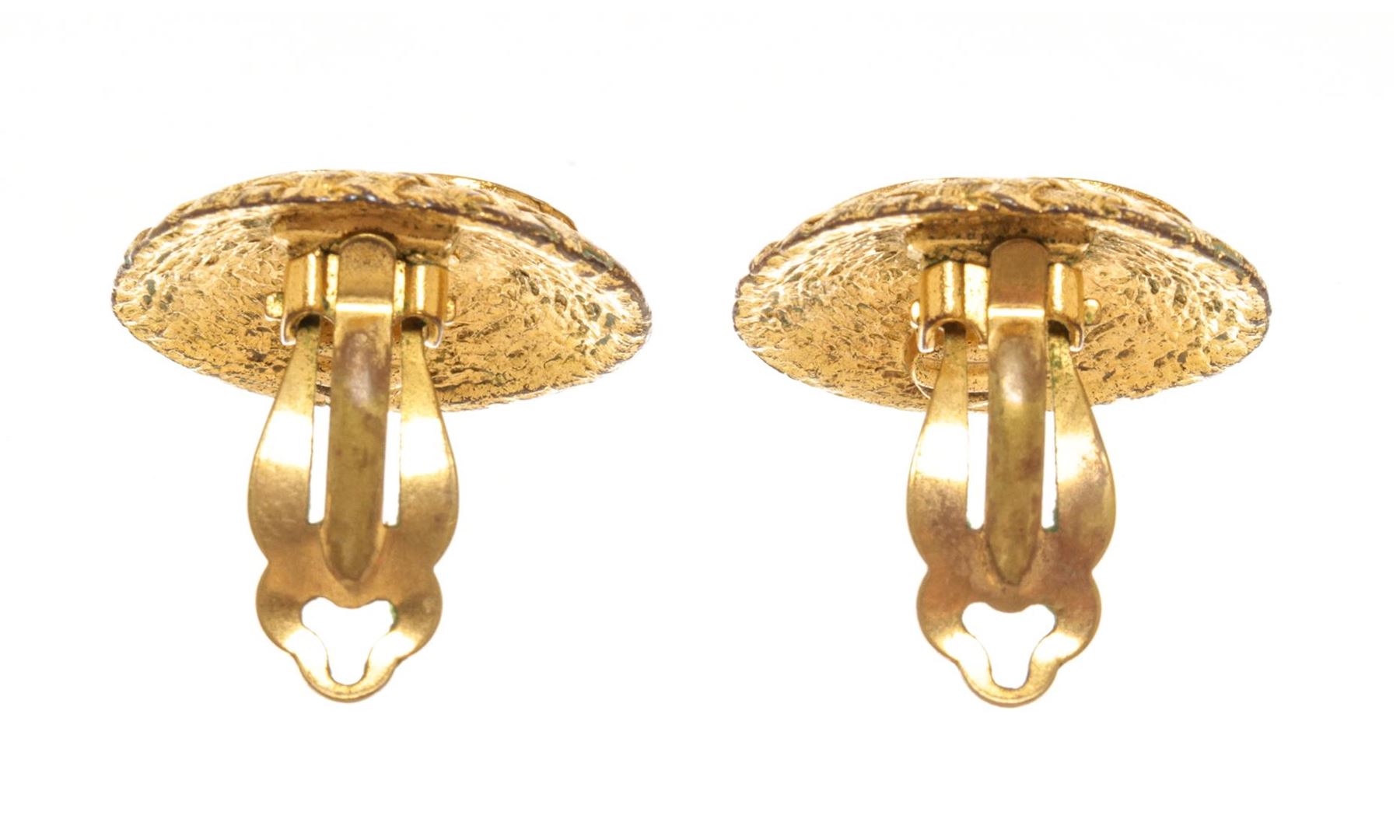Chanel Gold CC Earrings. All available information is listed in the description and shown in the photos. Chanel gold CC earrings feature a gold-finish body with a weaved pattern and the CC logo in the center, Chanel stamp on the back, and a clip on closure.