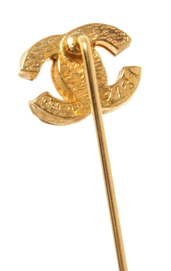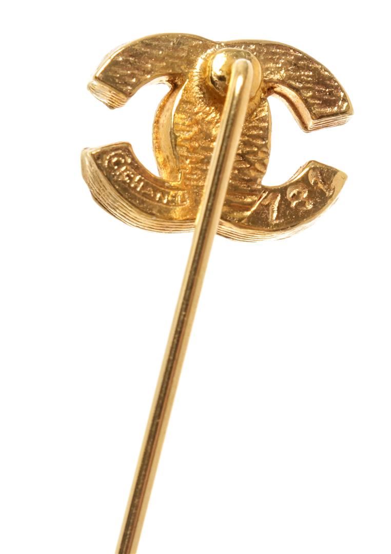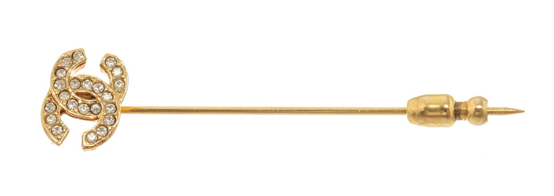 Chanel Gold CC Rhinestone Brooch. All available information is listed in the description and shown in the photos. Chanel gold CC rhinestone brooch with CC logo with rhinestones all over with a single pin.