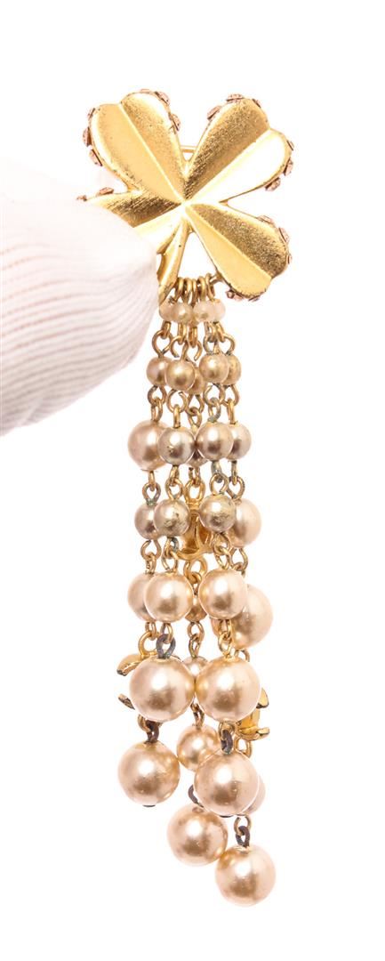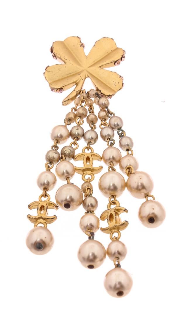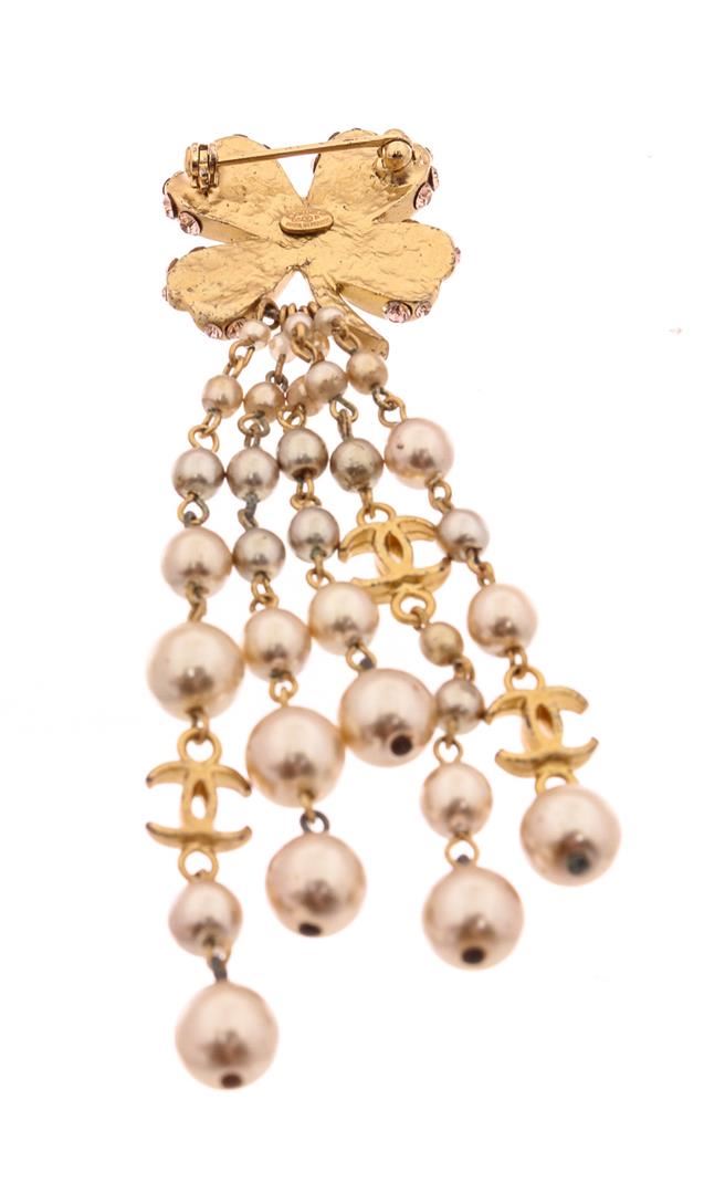 Chanel gold-tone clover shape brooch with rhinestones, dangling pearls and 'CC' logo, and a bar pin fastening.