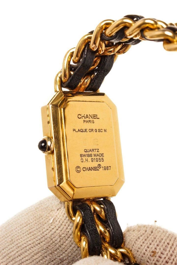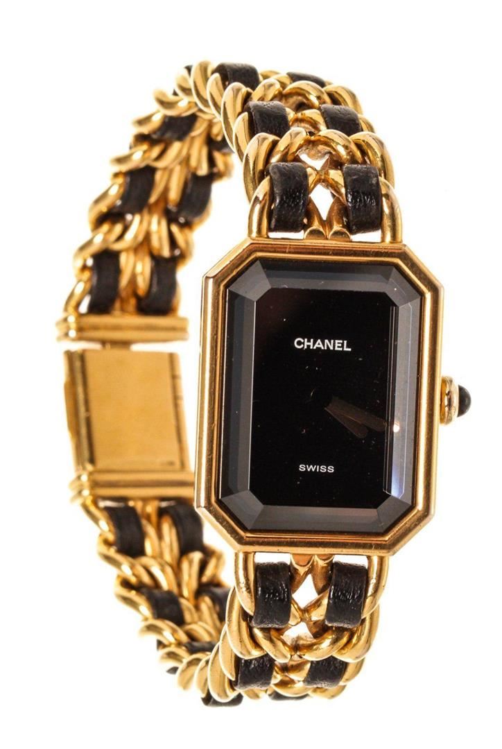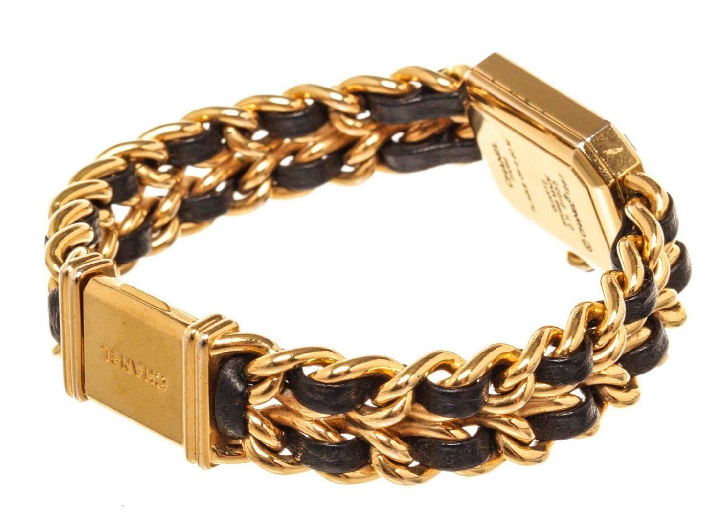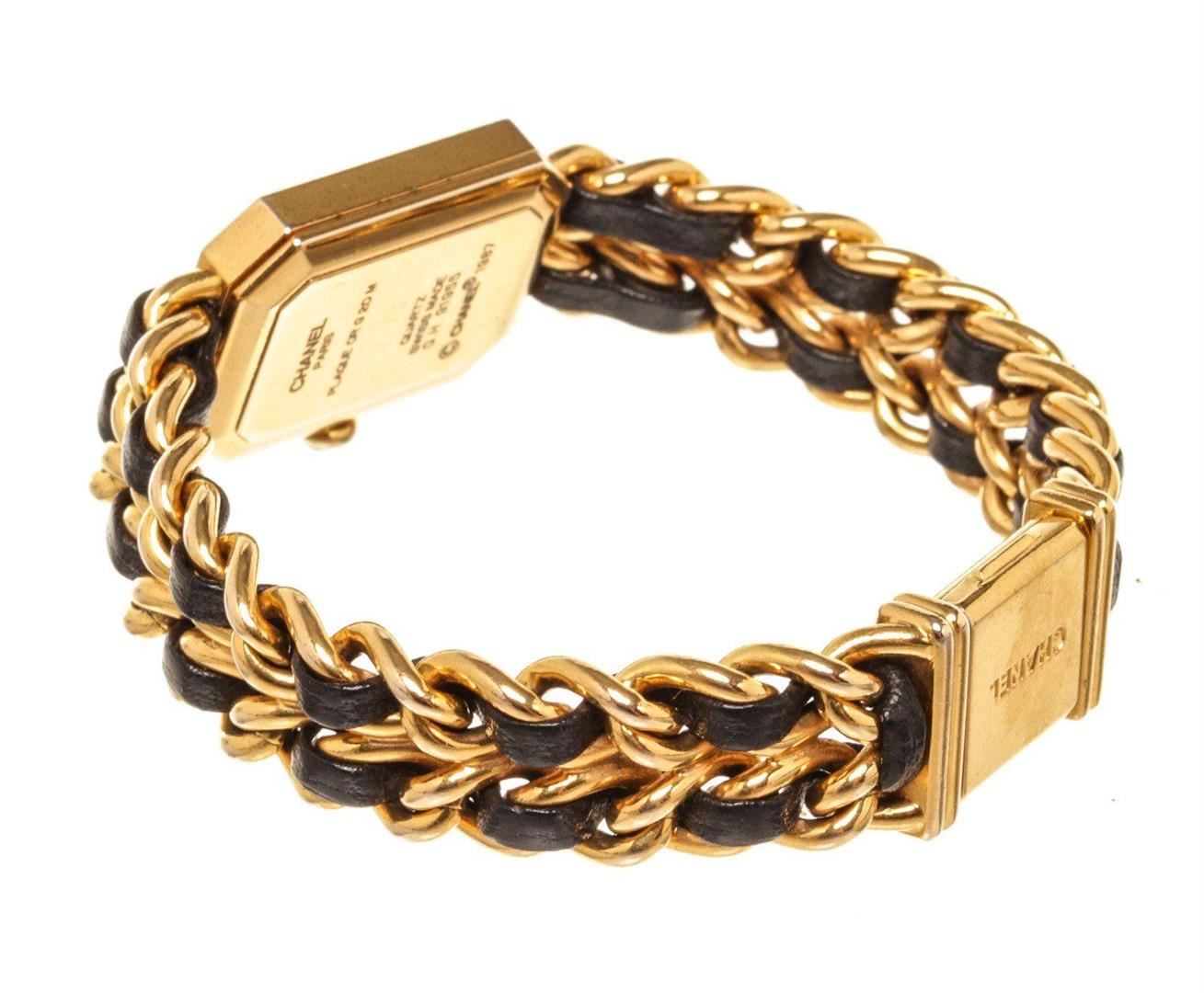 Chanel Gold Leather Premiere L Watch with leather, yellow gold-plated and black leather bracelet; hinged clasp closure.