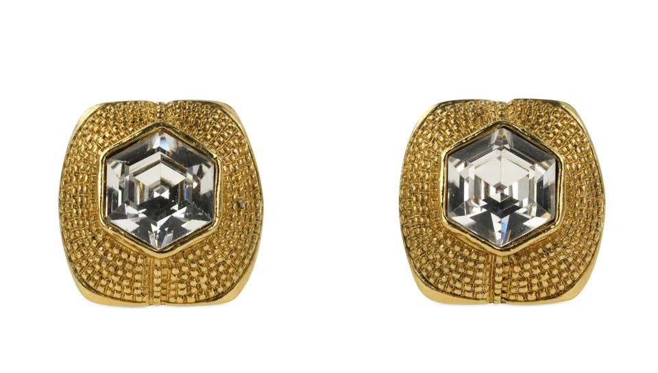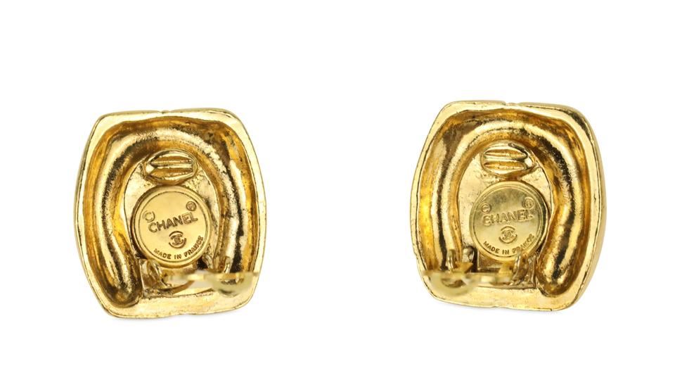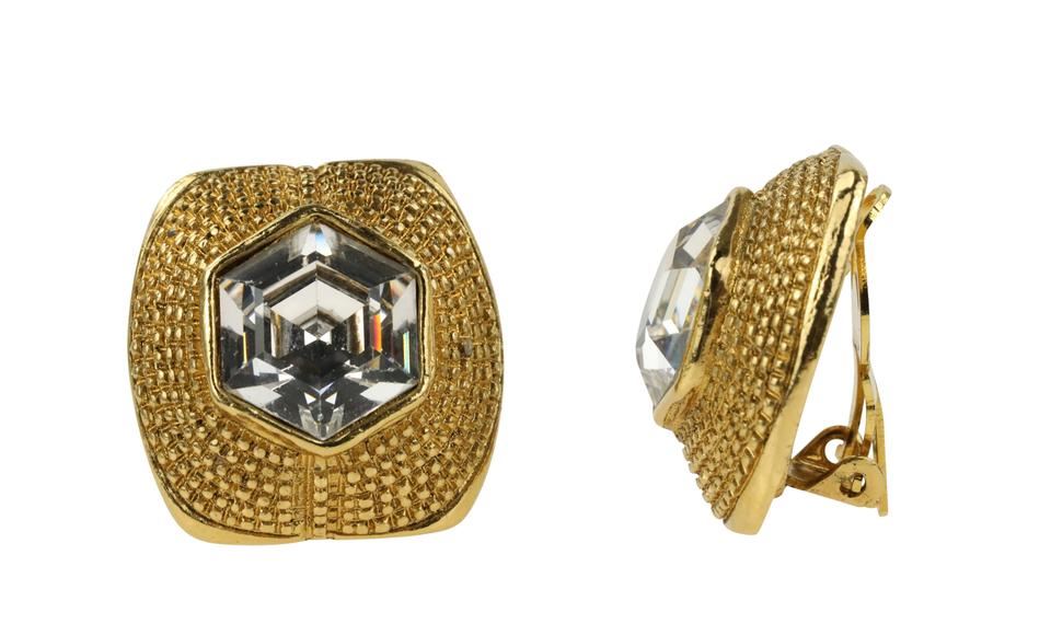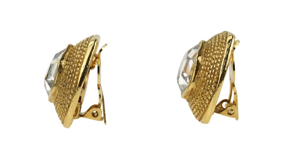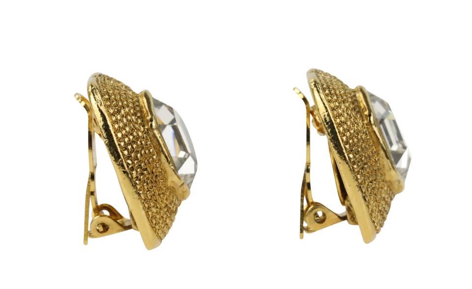 One pair Chanel Gold Vintage Crystal Clip On Earrings. Chanel Vintage Gold-tone Crystal Clip-on Earrings Clip-on Gold-tone hardware Clear rhinestone center " height ." ." depth Stampings: Chanel CC Made in France