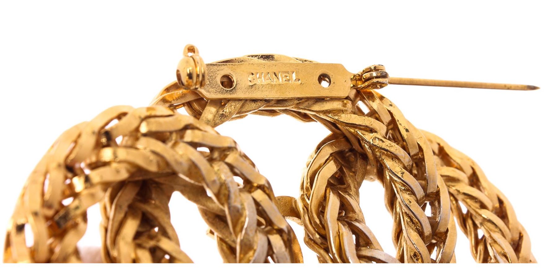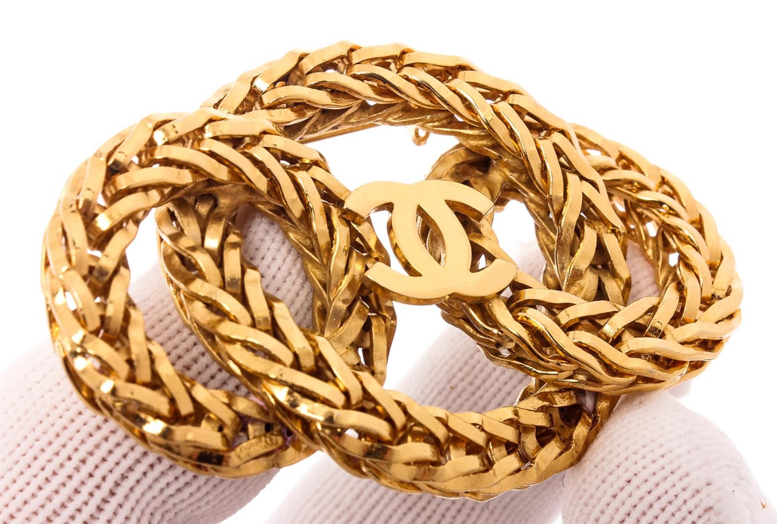 Gold-tone Chanel brooch featuring three interwoven chain link circles and 'CC' logo at center.