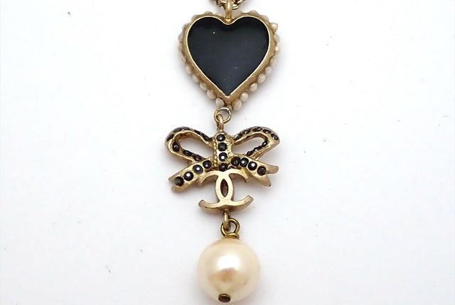 One Chanel Gold-tone Black Heart Ribbon Pendant CC Necklace. Item is sold AS-IS. All available information is listed in the description and shown in the photo. Chanel CC necklace features gold-tone hardware, black heart-shaped pendant surrounded by faux pearls, a gold-tone iron band embellised with black rhinestones and interlocking CC logo at base, a faux pearl and lobster claw closure.
