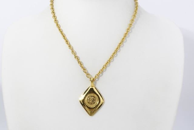 One Chanel Gold-tone Metal CC Diamond Shape Charm Logo Short Necklace. Item is sold AS-IS. All available information is listed in the description and shown in the photo. Chanel CC necklace features gold-tone metal, a diamond-shaped pendant with CC logo at the center and a spring ring closure.
