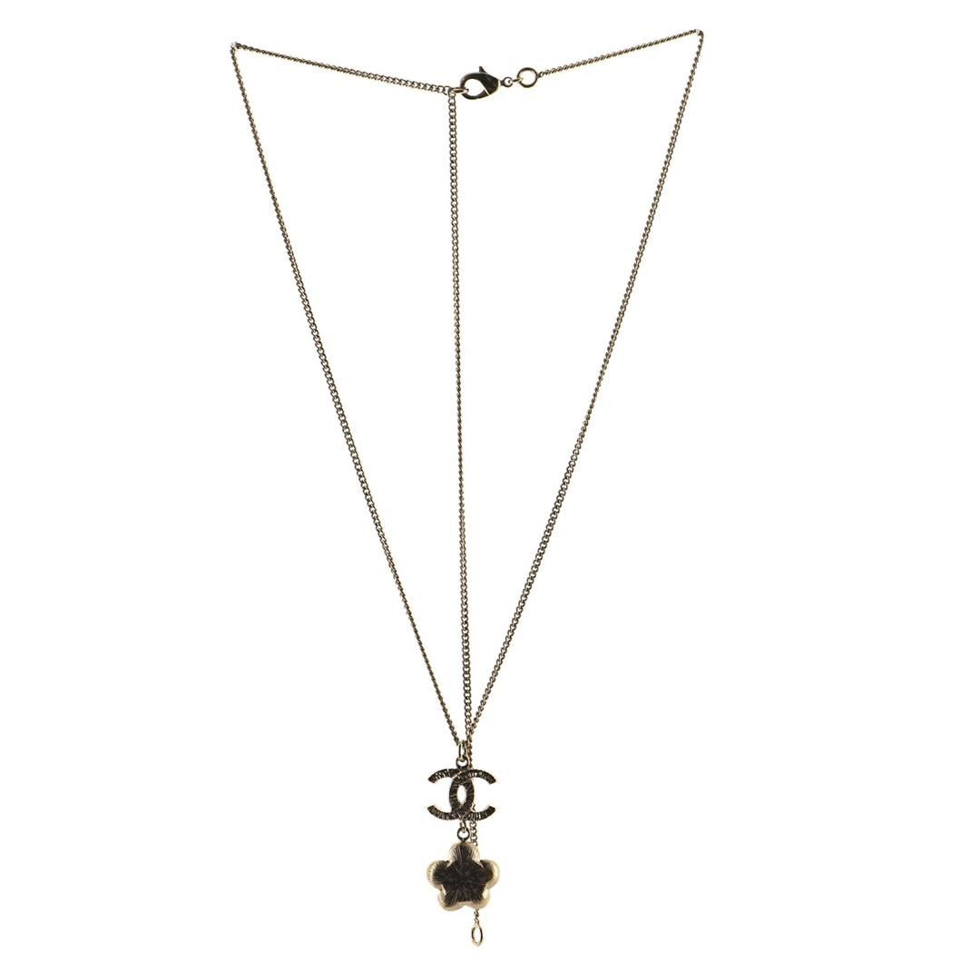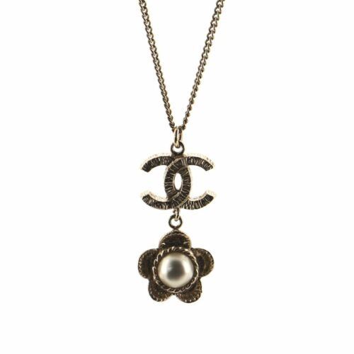 Chanel Gold-tone Metal CC Flower Faux Pearl Drop Pendant Necklace. All available information is listed in the description and shown in the photos. Chanel CC Flower Drop Pendant Necklace features aged gold-tone hardware, interlocking CC logo with flower-shaped drop pendant and faux pearl at the center, completed with lobster-claw closure.